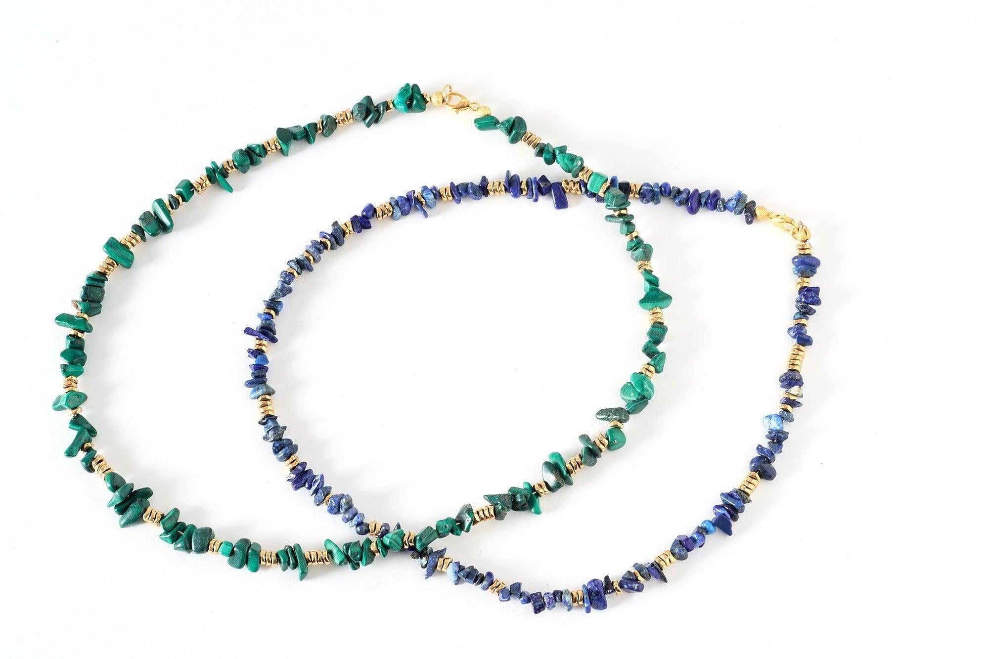 - cuentas de piedras naturales (lapislázuli, malaquita, obsidiana, concha amarilla, concha rosa, howlita turquesa)