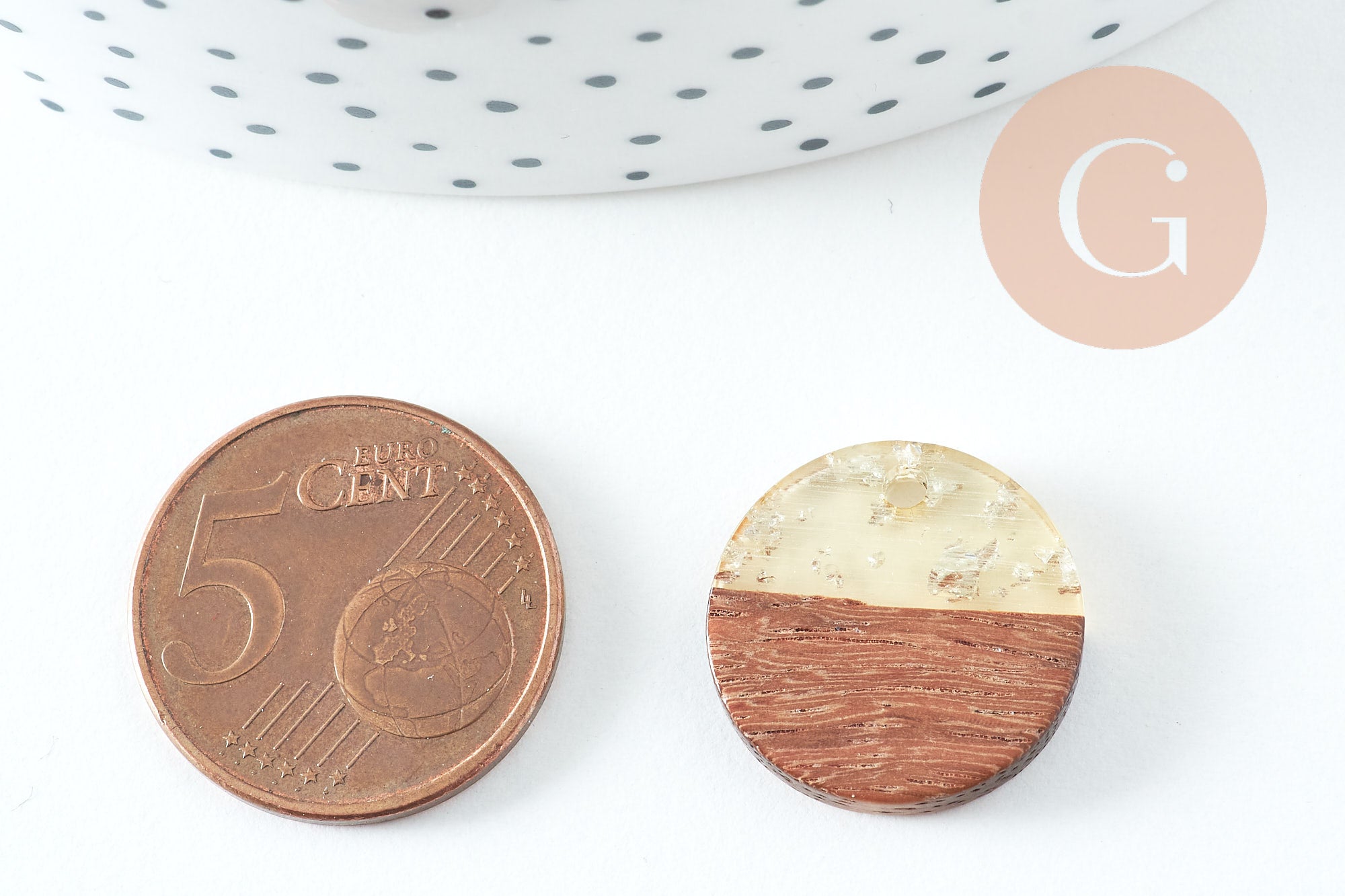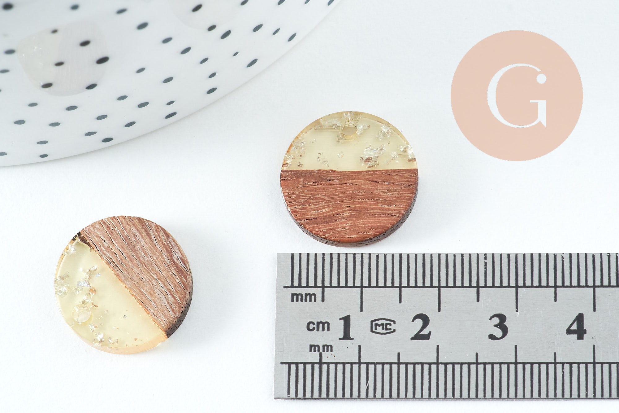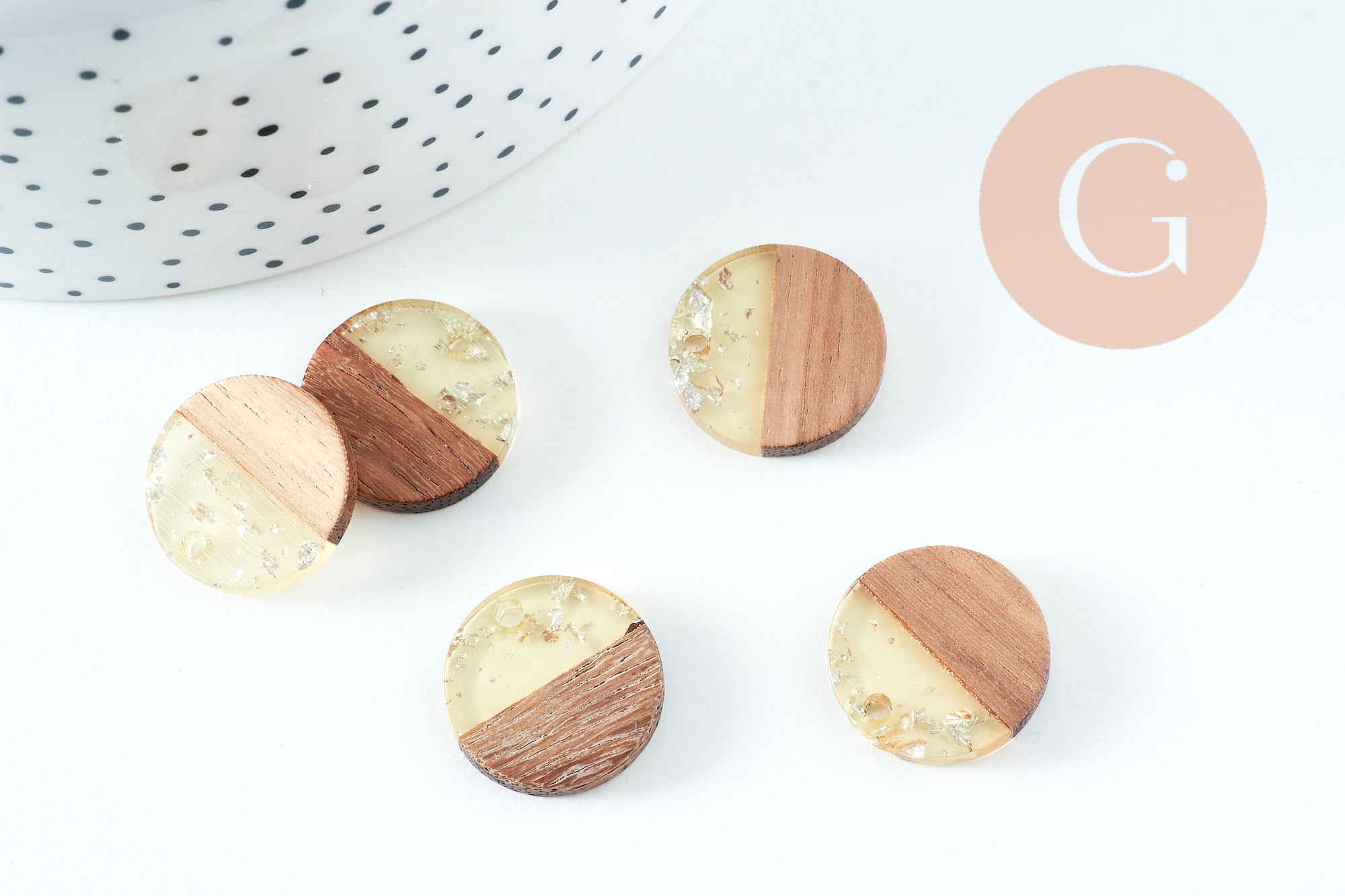 Cuentas en forma de disco de aspecto muy sencillo, hechas de madera y resina transparente y purpurina, que permiten realizar colgantes muy bonitos o bucles completos de espíritu geométrico.