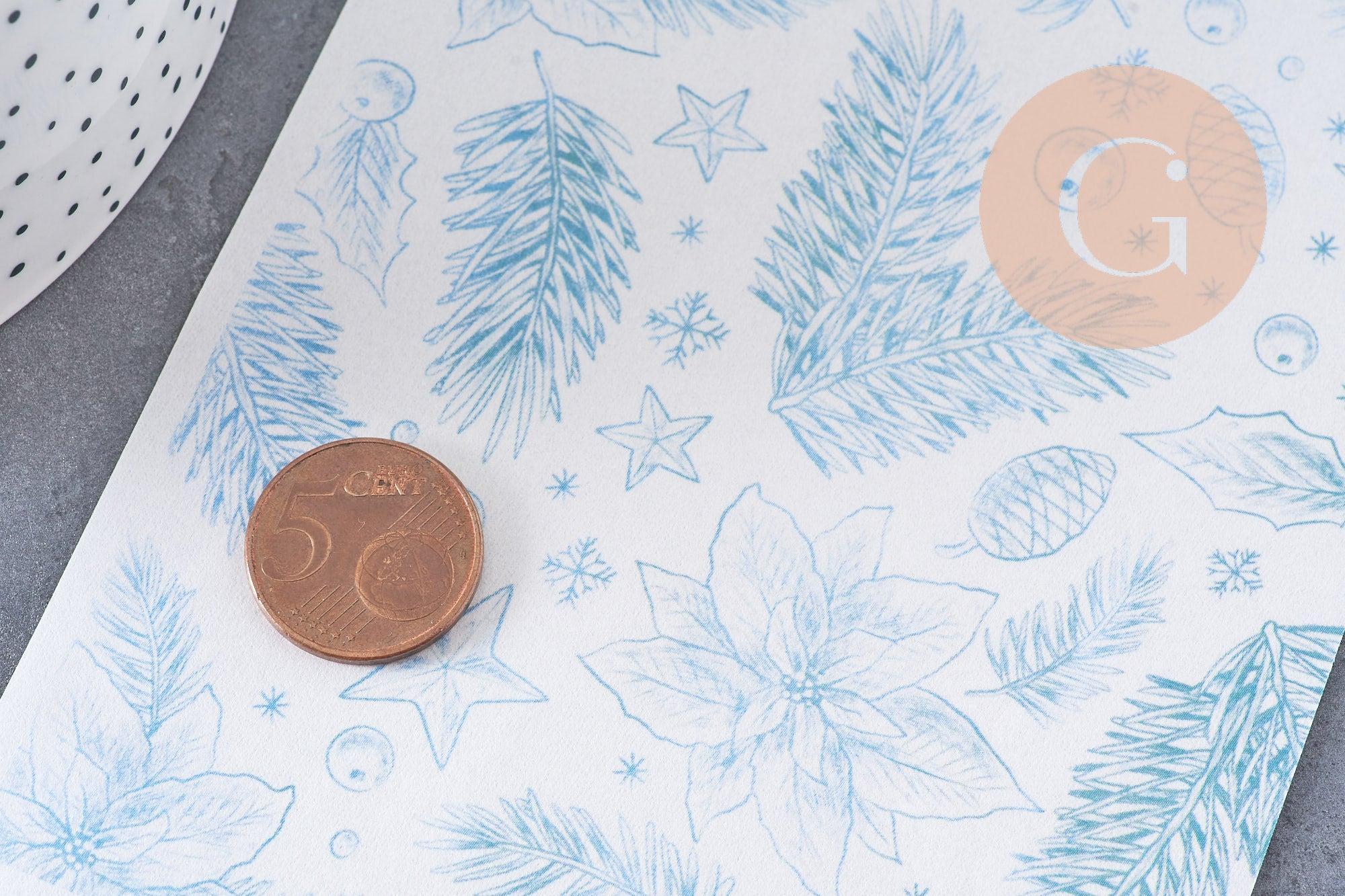 • Patrón: invierno verde (copos de nieve, ramas de abeto, piñas, estrellas grabadas)