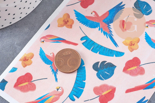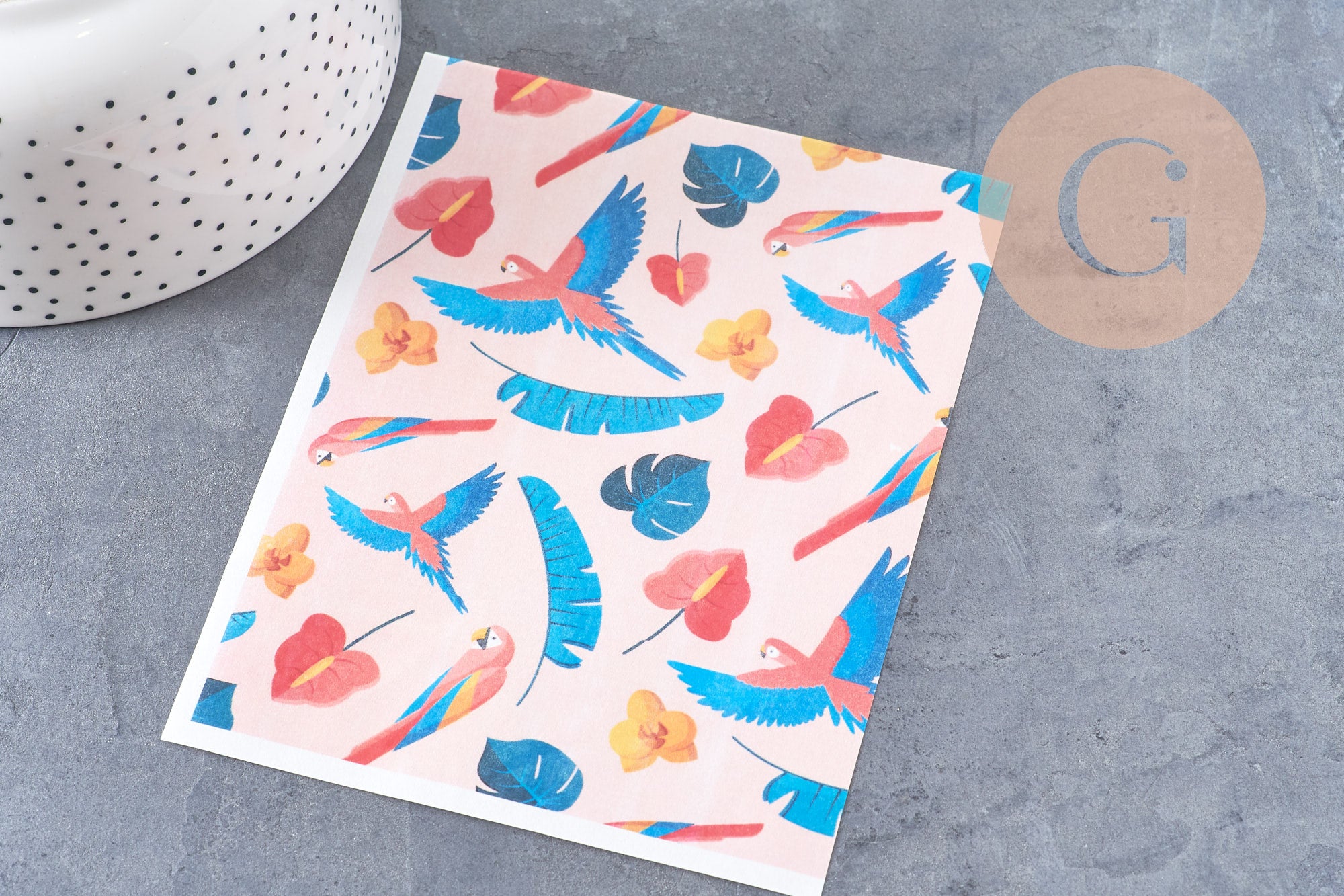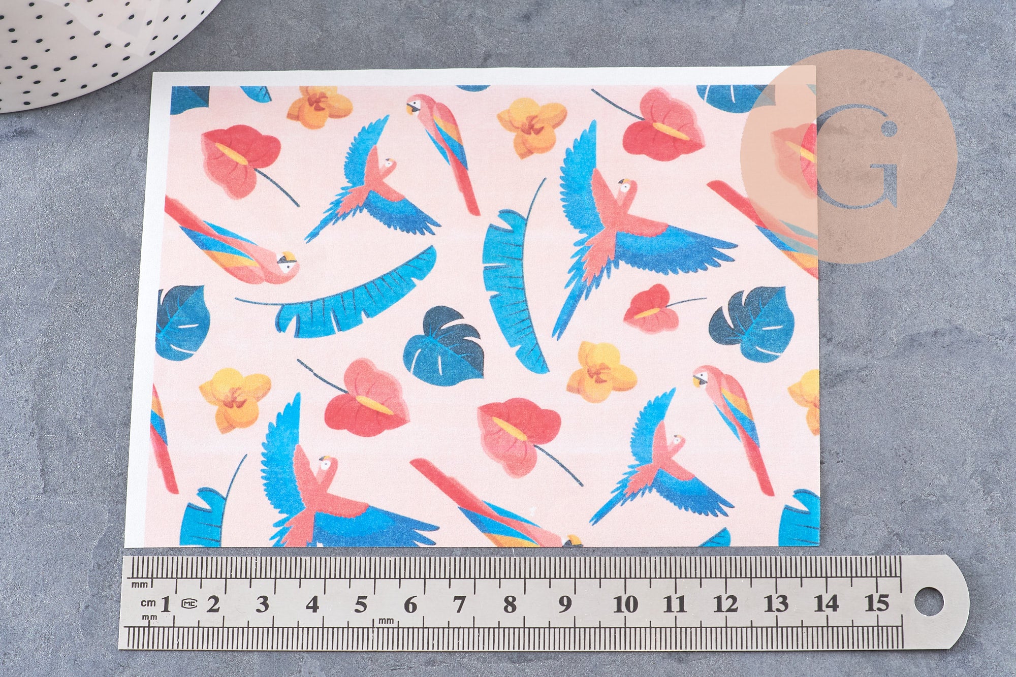 Dale un toque exótico y extravagante a tus creaciones con esta lámina de transferencia de arcilla polimérica . Su diseño de loros multicolores sobre fondo rosa, rodeado de hojas de plátano y flores tropicales , es ideal para crear joyería colorida con un estilo veraniego y exótico.