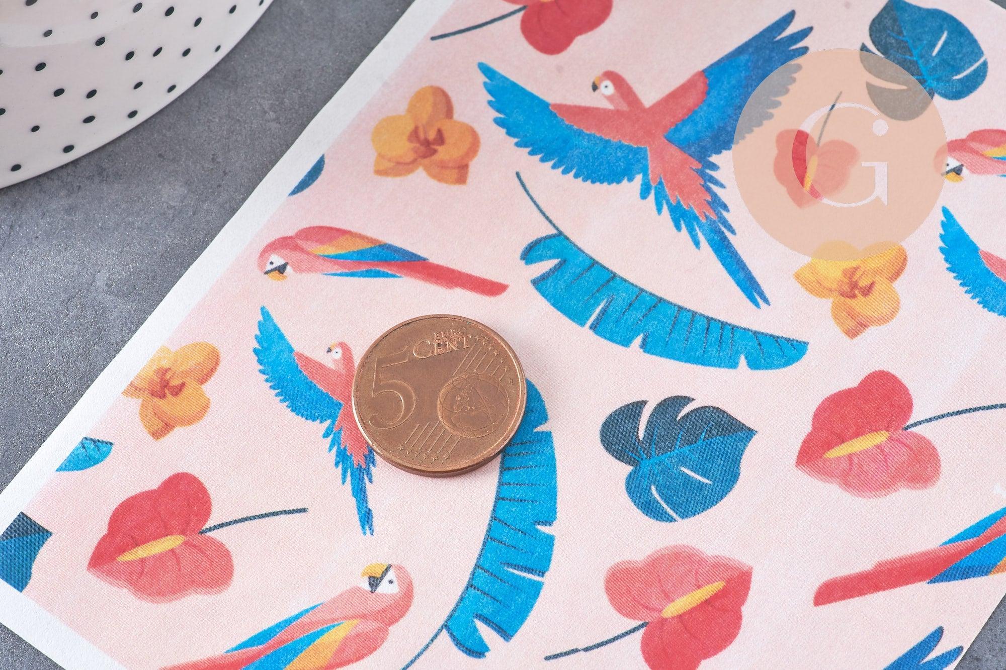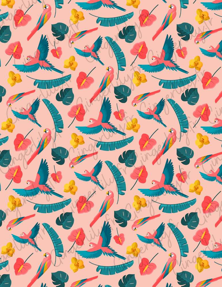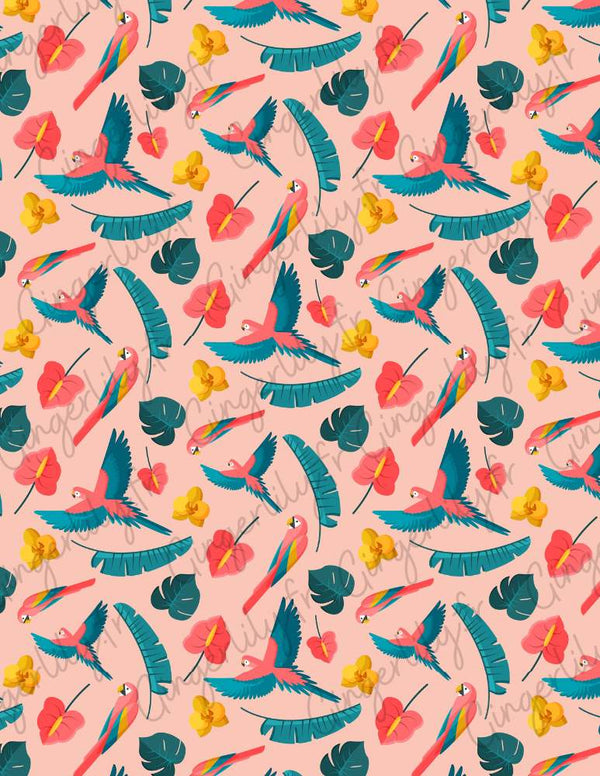 • Patrón: Loros multicolores, fondo rosa con hojas de plátano y flores tropicales.
