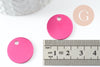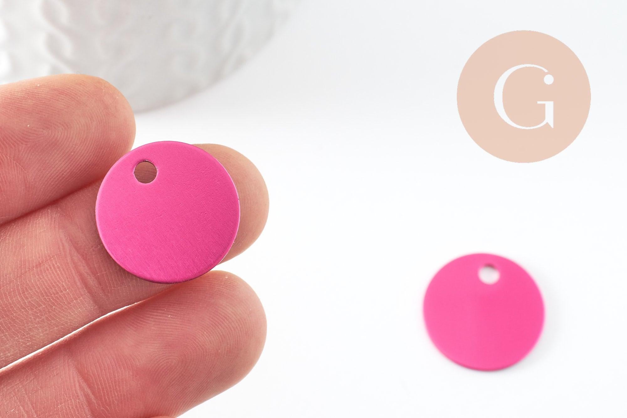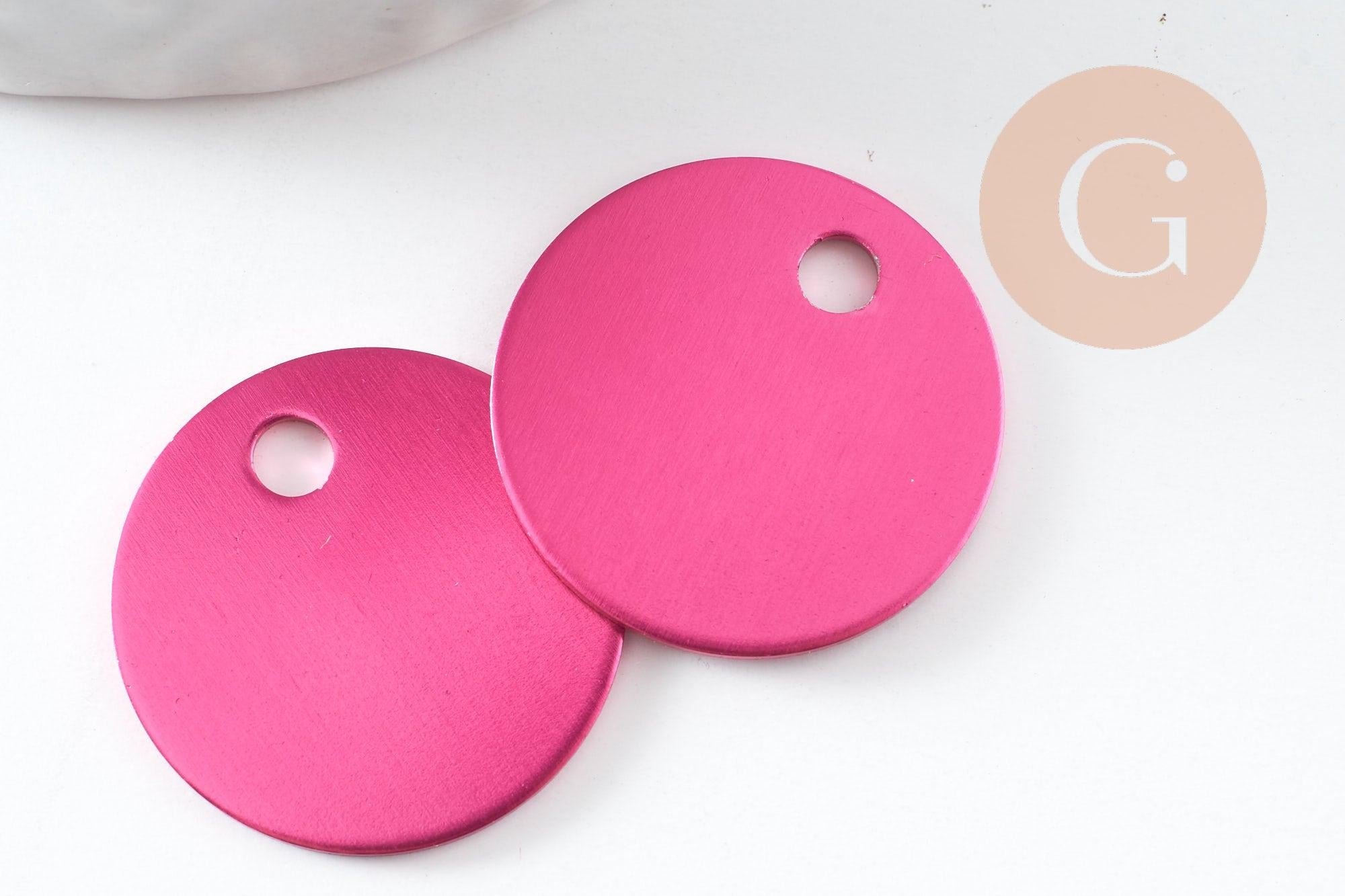 Este colgante redondo de aluminio de color rosa fucsia , de 20 mm de diámetro , es ideal para grabado personalizado . Su superficie lisa permite escribir un nombre, una fecha o un patrón.