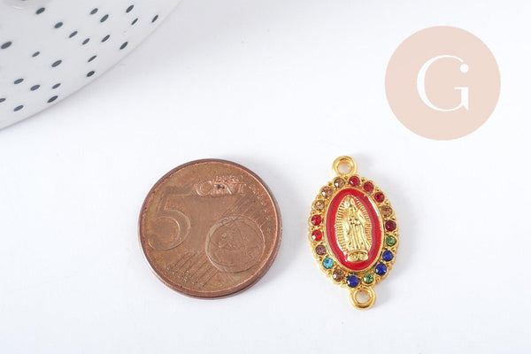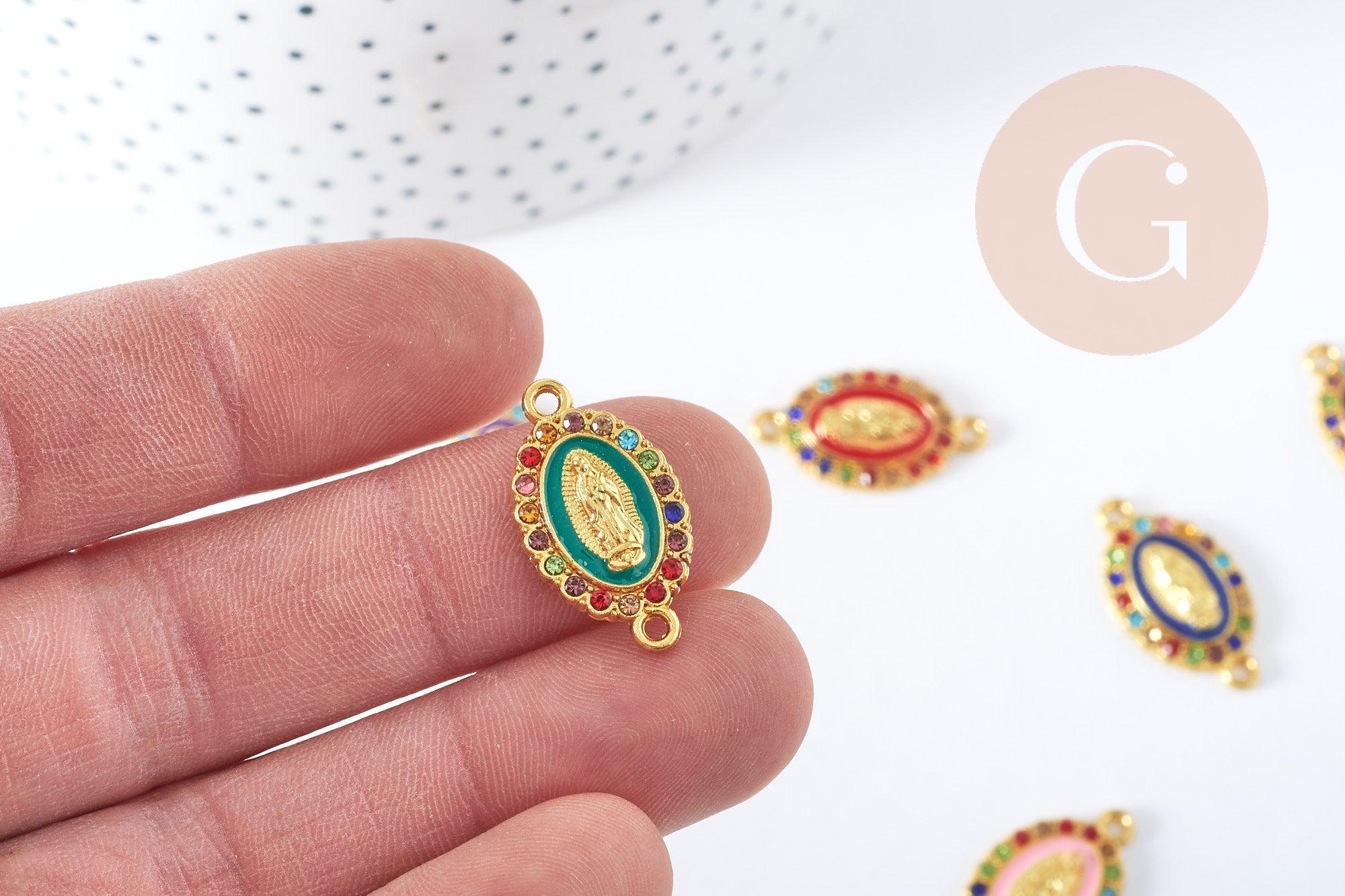 Déjate seducir por este conector ovalado en zamac dorado y esmalte decorado con pedrería multicolor. Representa a la Virgen María , signo religioso y protector.
