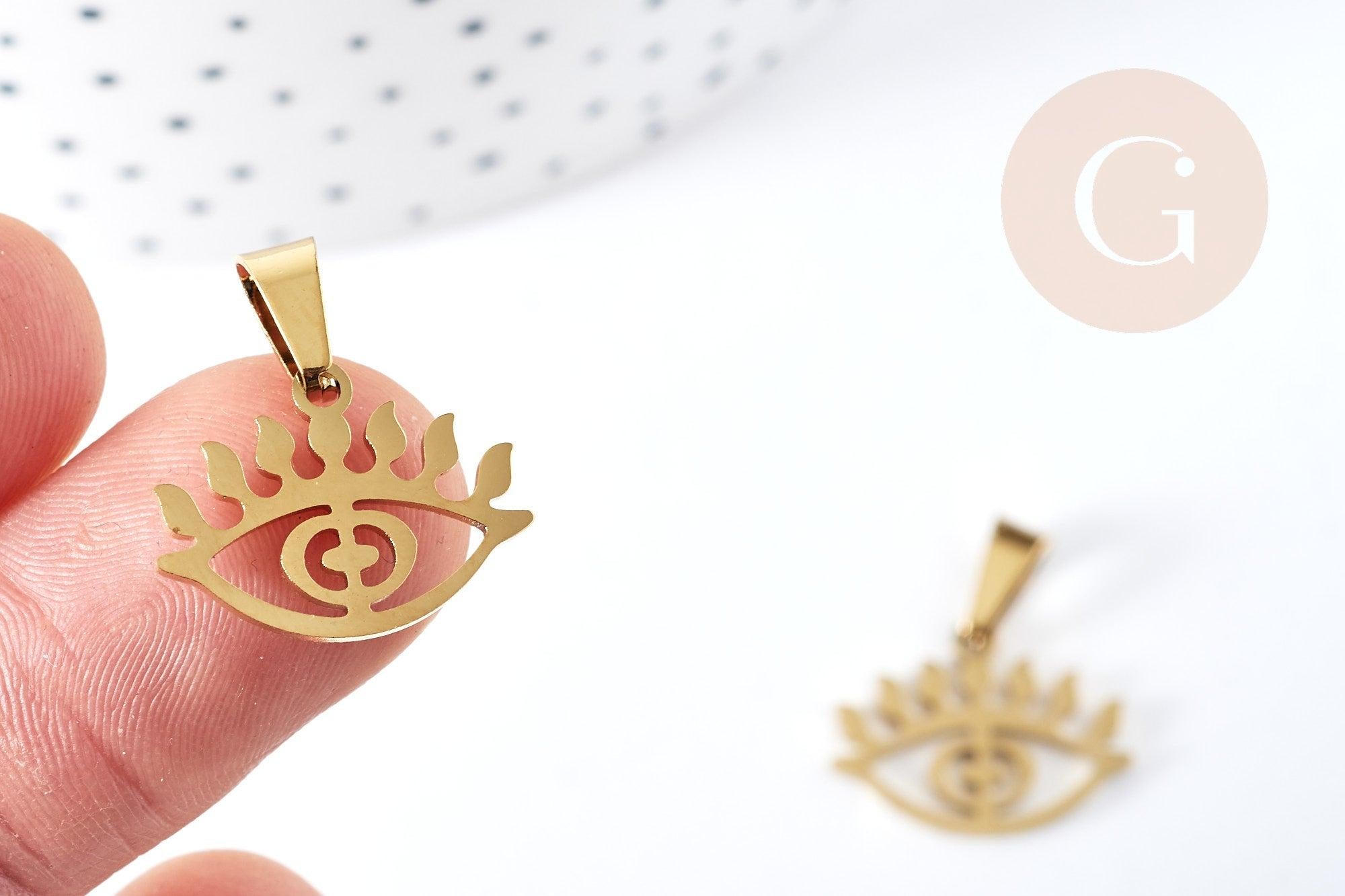 El colgante de ojo protector en acero bañado en oro es un elemento único para crear joyas de acero inoxidable .