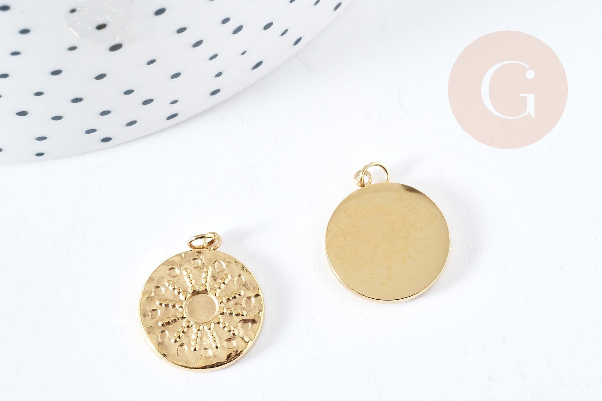 Este colgante de sol redondo de acero inoxidable 304 chapado en oro es una joya elegante y simbólica a la vez. Su forma redonda representa el infinito y la eternidad, mientras que el sol evoca luz, energía y fuerza.