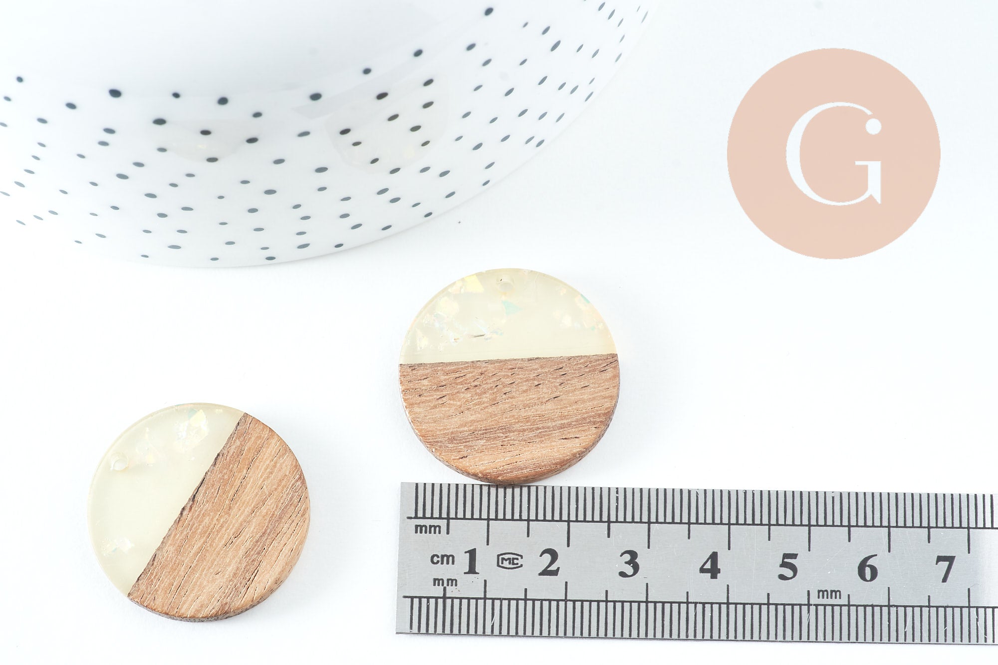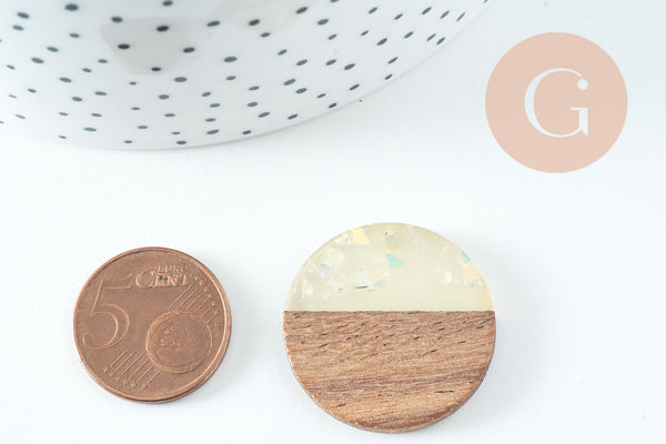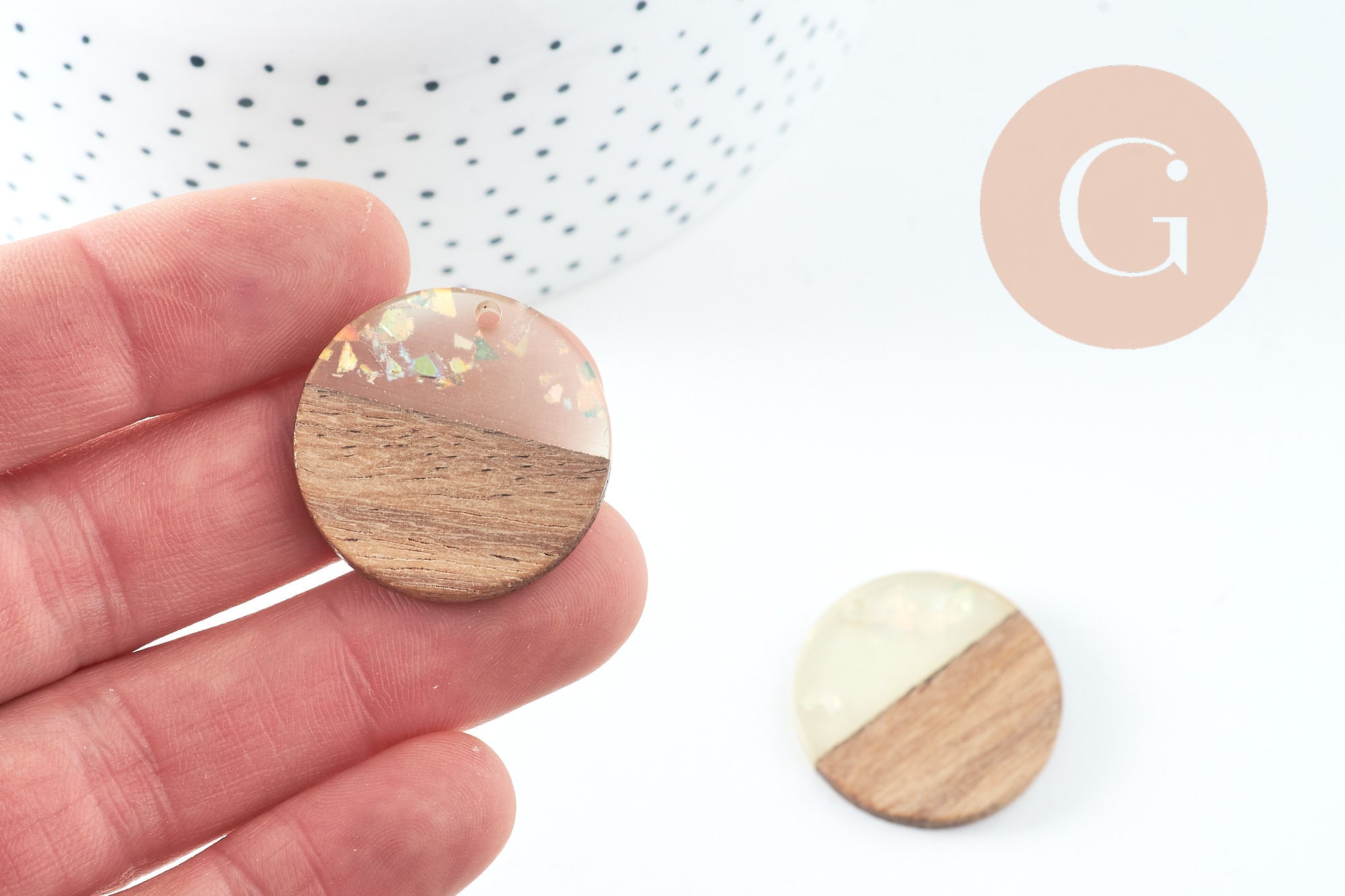Cuentas en forma de disco de aspecto muy sencillo, hechas de madera y resina decoradas con purpurina iridiscente, que permiten realizar colgantes muy bonitos o completar rizos con un espíritu artístico.