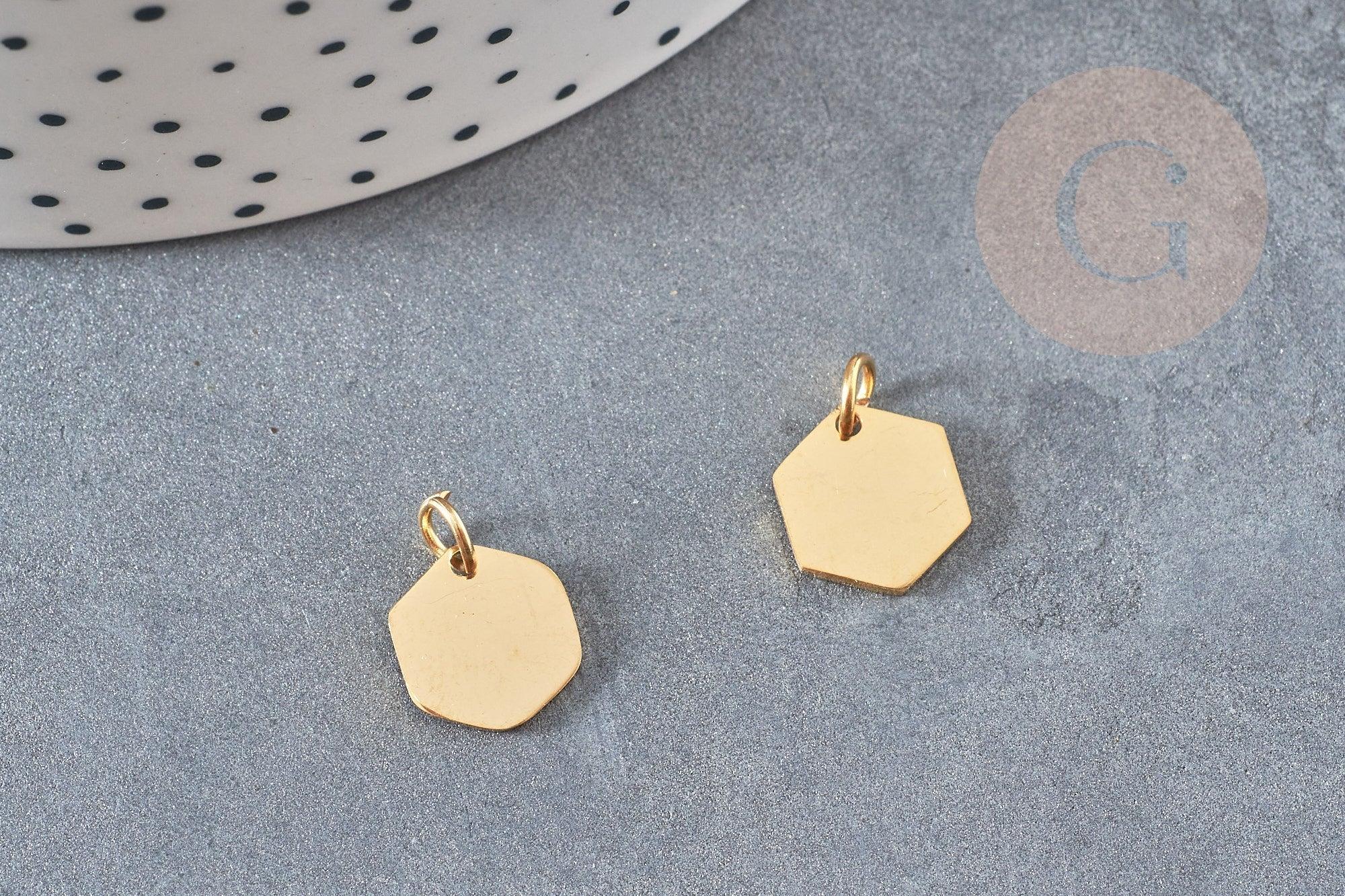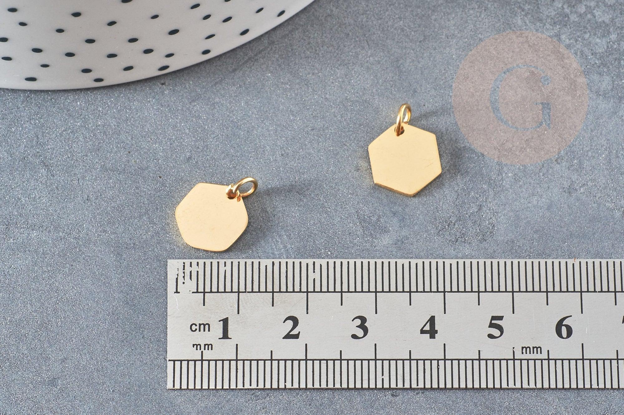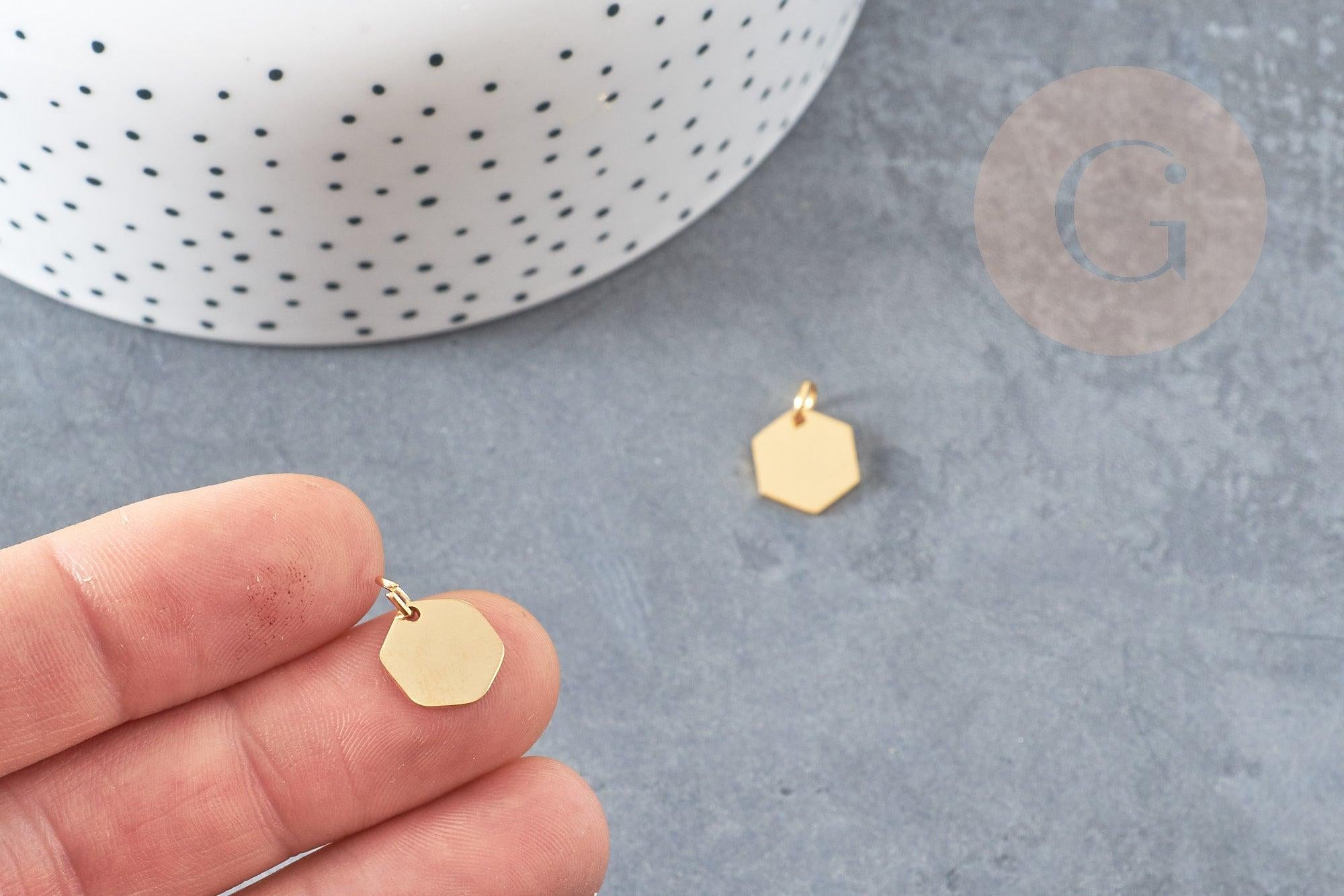 Un pequeño colgante geométrico de diseño moderno, perfecto para tus creaciones minimalistas. Con forma de hexágono plano, está elaborado en acero inoxidable hipoalergénico chapado en oro 201 con un hermoso y duradero baño de oro.