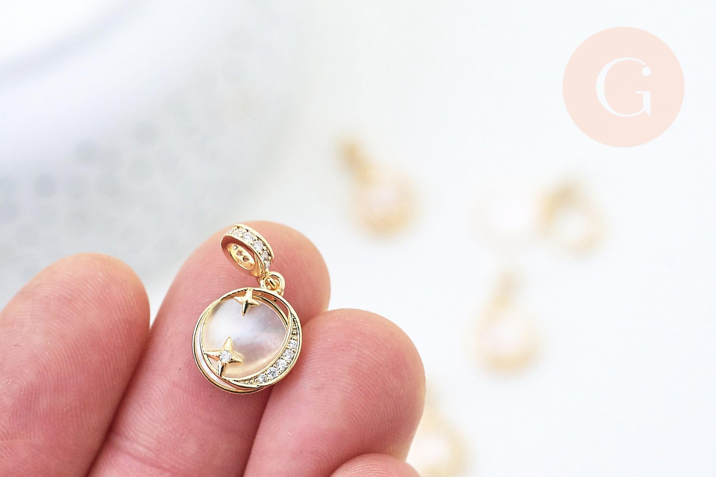 Colgante medalla luna redonda de latón dorado nácar móvil 13,5 mm, colgante de nácar de latón dorado para creación de joyas, medalla de oro, x1 G5682