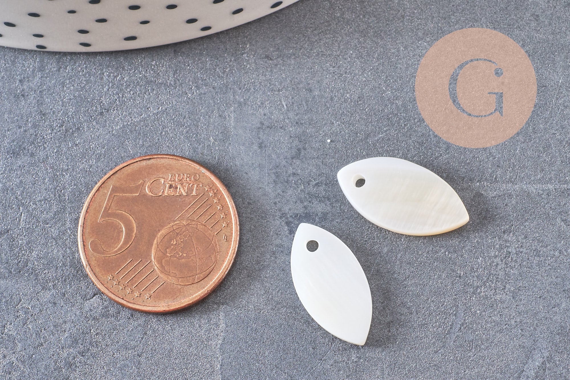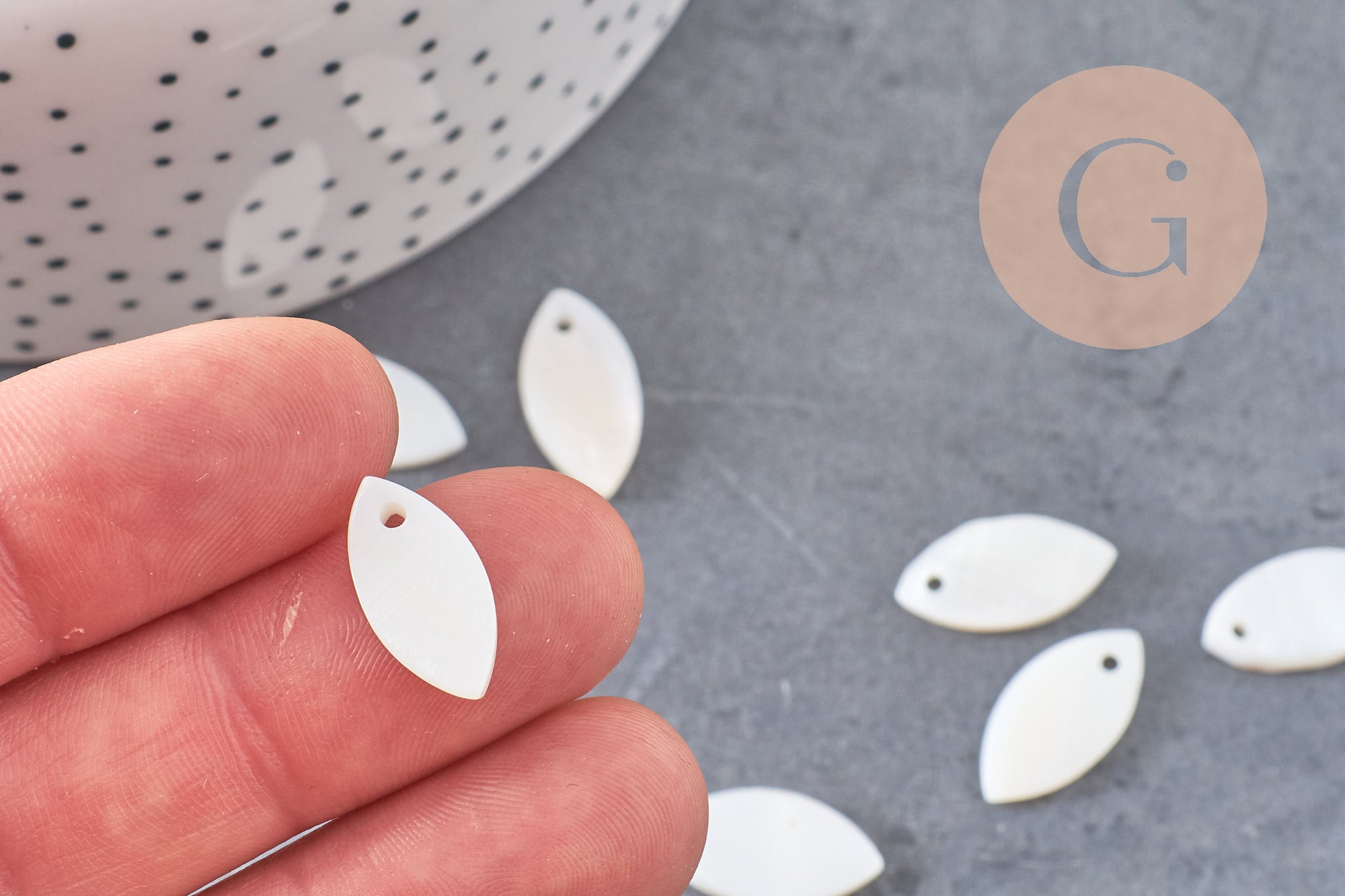 Otros colgantes y cuentas de nácar blanco, en otros colores y materiales, están disponibles en la tienda gingerlily.