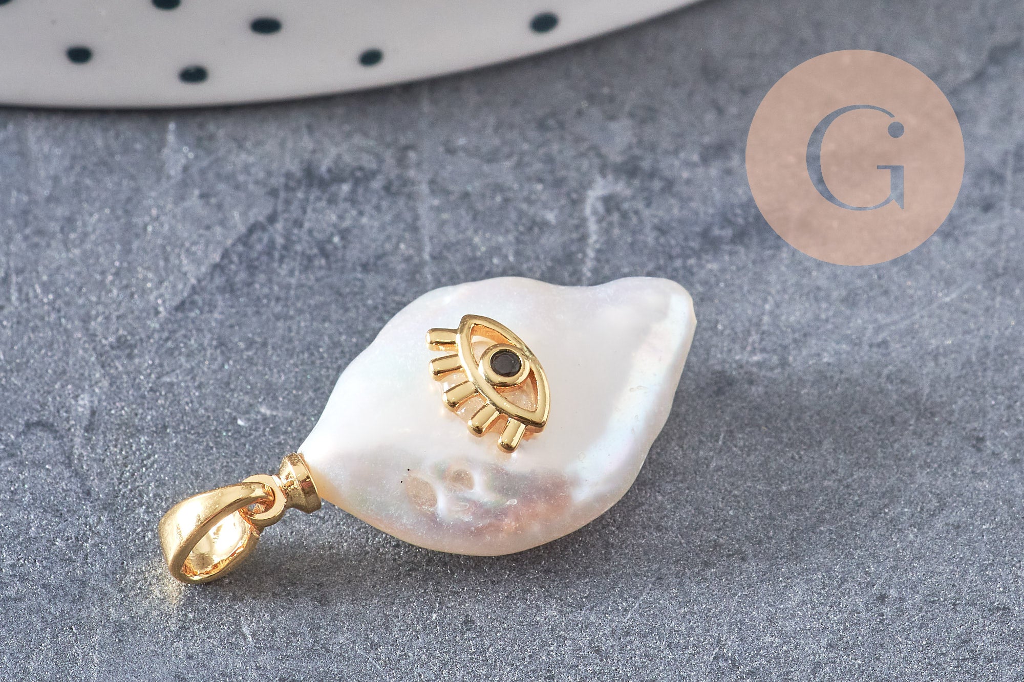 Perla Keshi natural y montura de latón chapado en oro , decorada con un pequeño ojo de la suerte adornado con un circón negro.