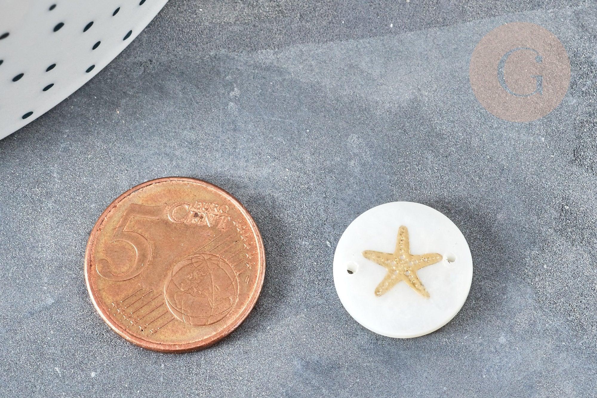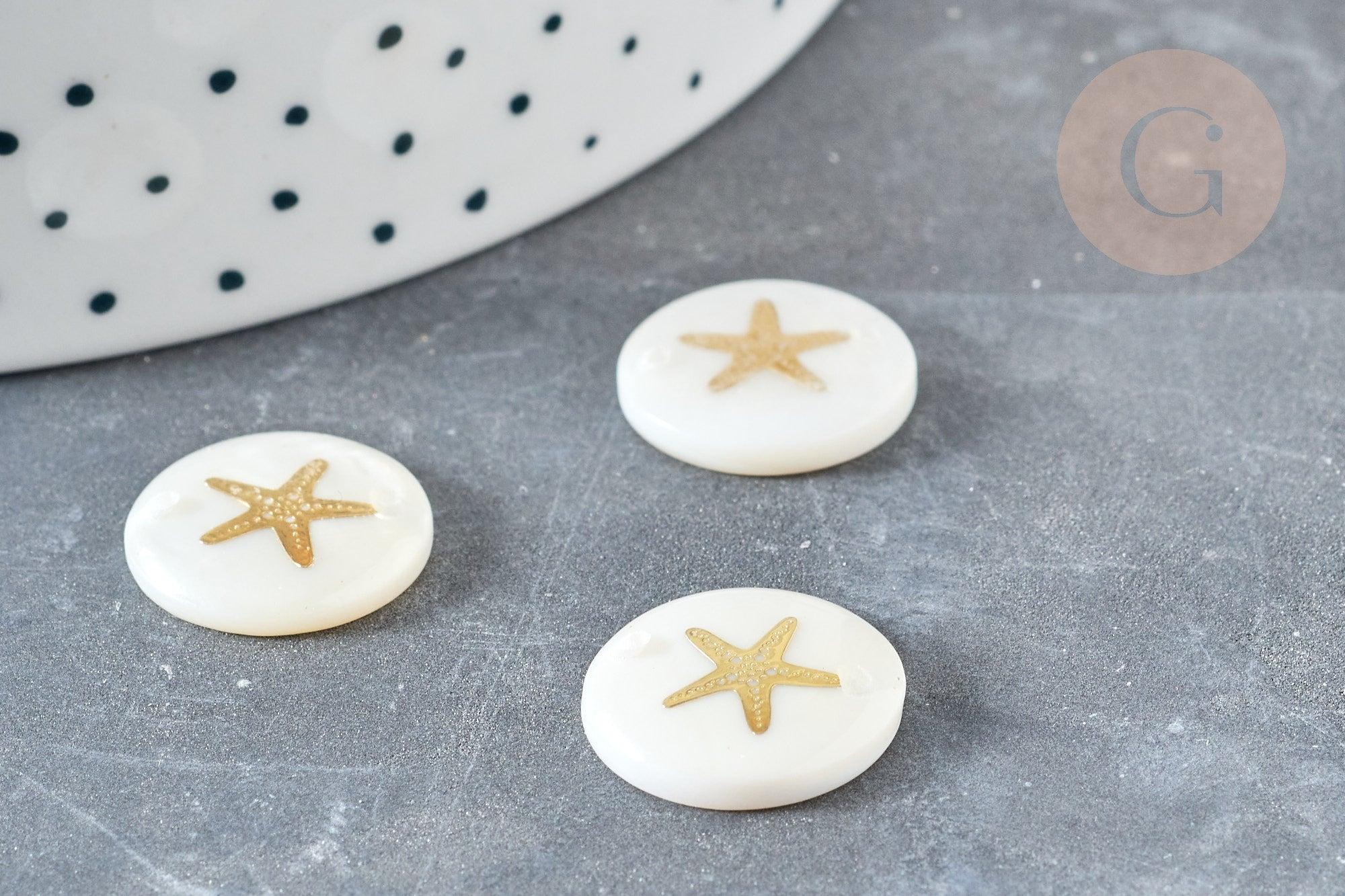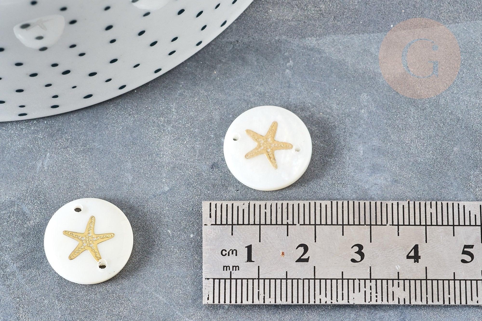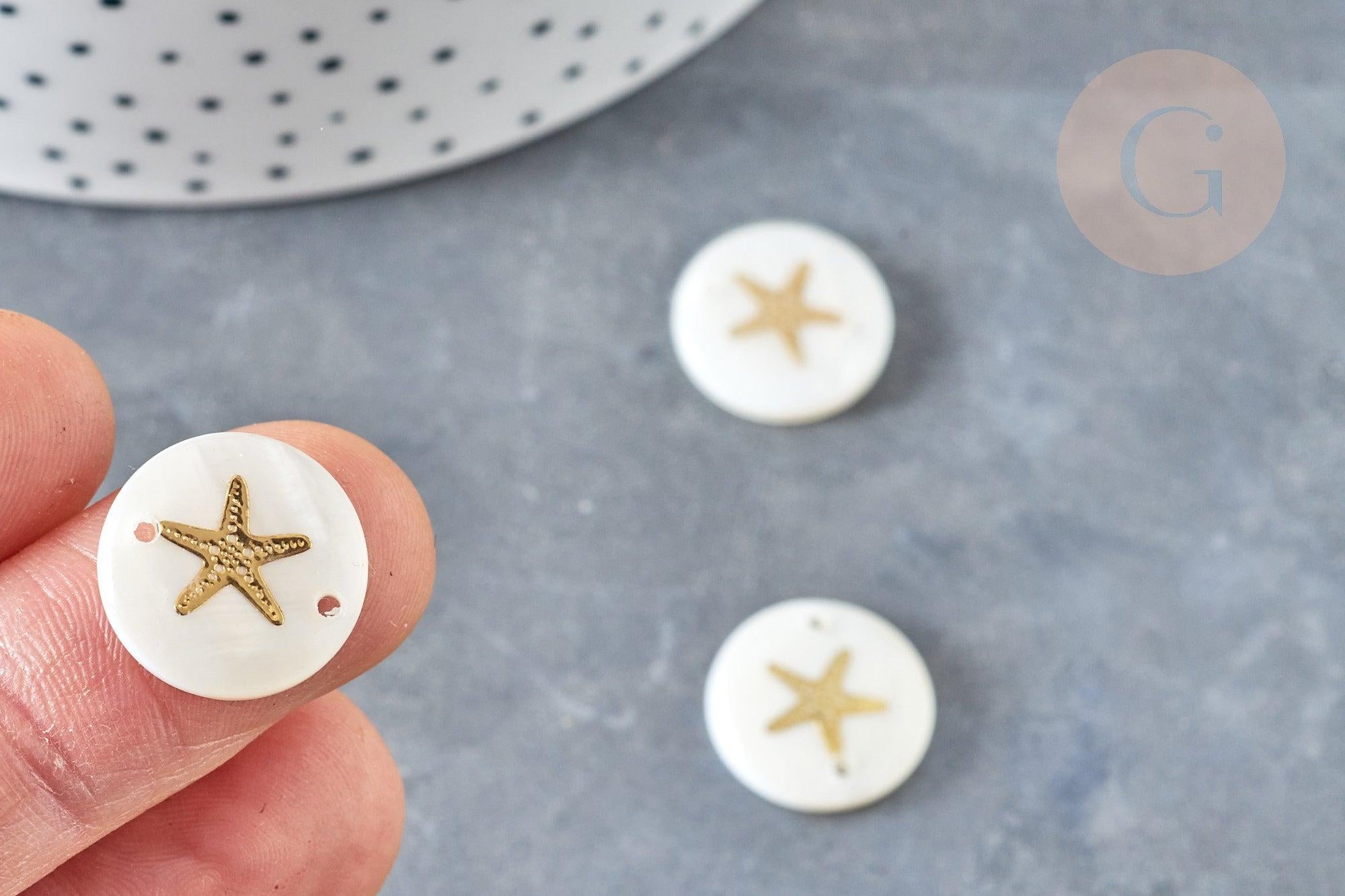 Colgante conector redondo de nácar blanco con estampado de estrellas de mar doradas.