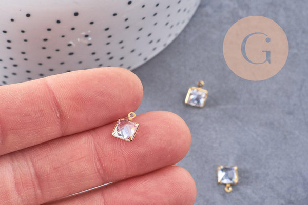 Este colgante cuadrado de 9 mm , realizado en cristal transparente y latón crudo , es un delicado charm ideal para añadir un toque de refinamiento a tus creaciones de joyería.