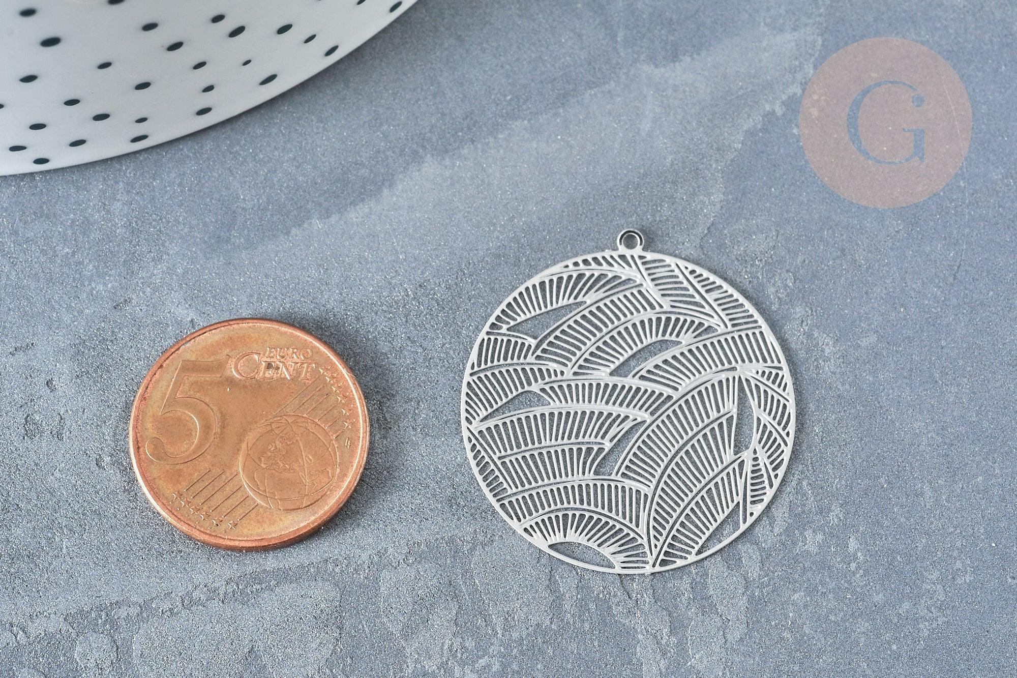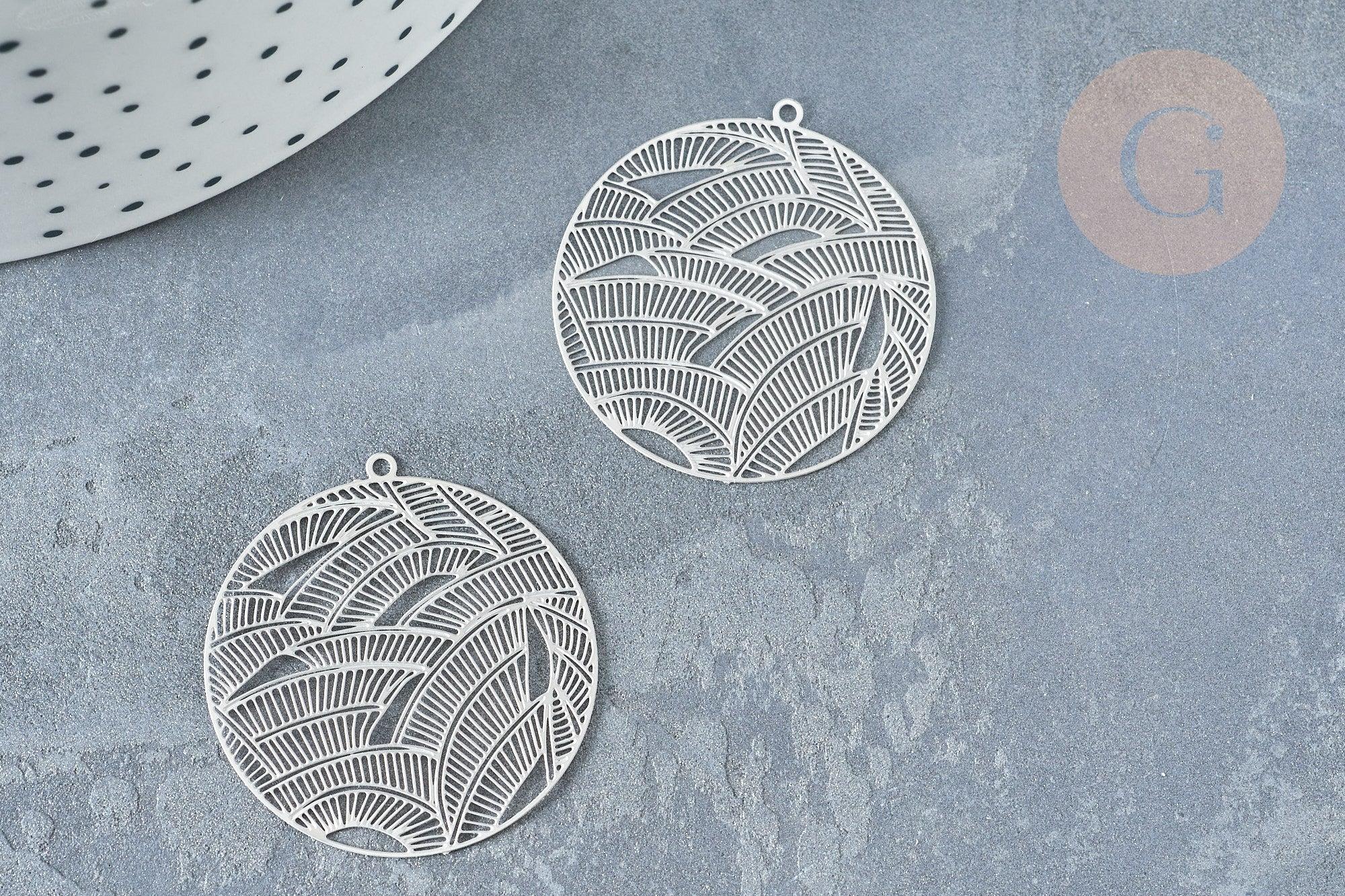 Colgante redondo con forma de hoja de filigrana estampada, acero inoxidable 201, chapado en plata, 31,5 mm, colgante muy fino y ligero, x 2 (G8261)