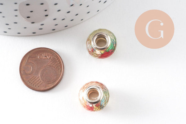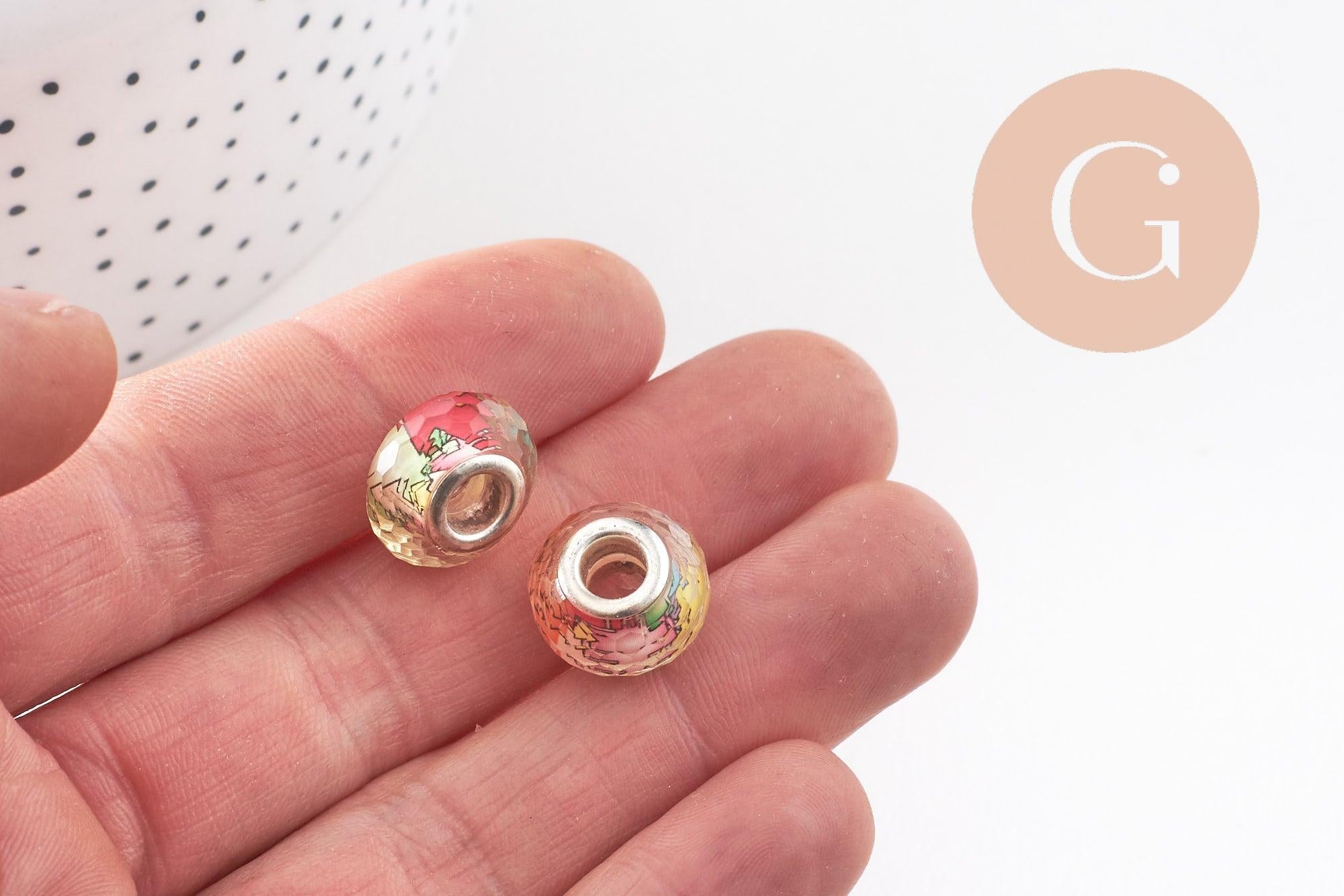 Cuentas de resina transparente y estampado multicolor que pueden complementar bonitas pulseras plateadas tipo Pandora.