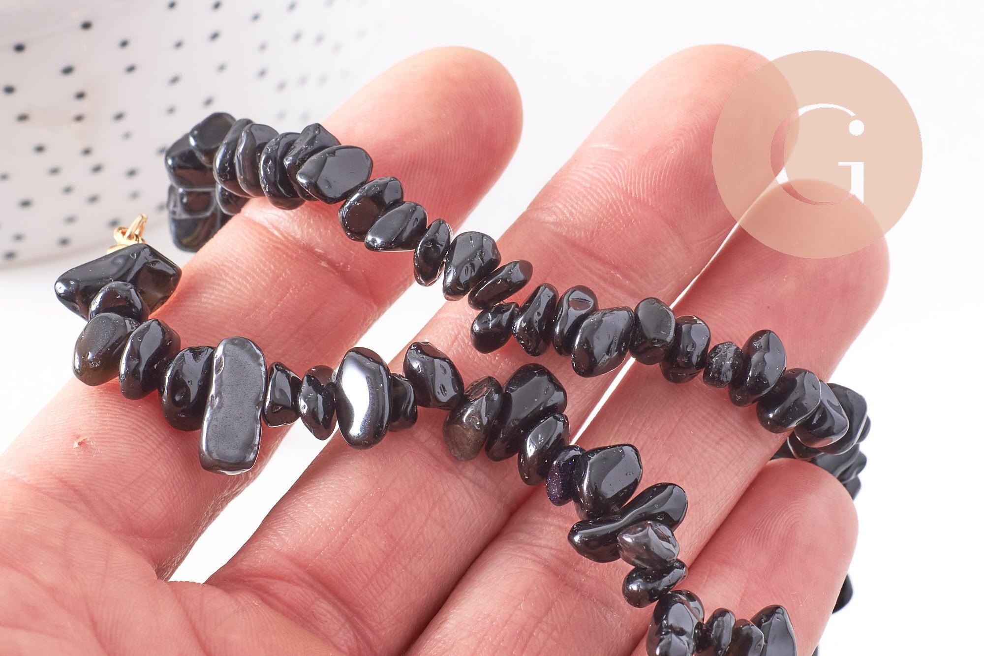 Collier obsidienne noire naturelle chips acier 304 inoxydable doré 40cm, x1 (G10266)
