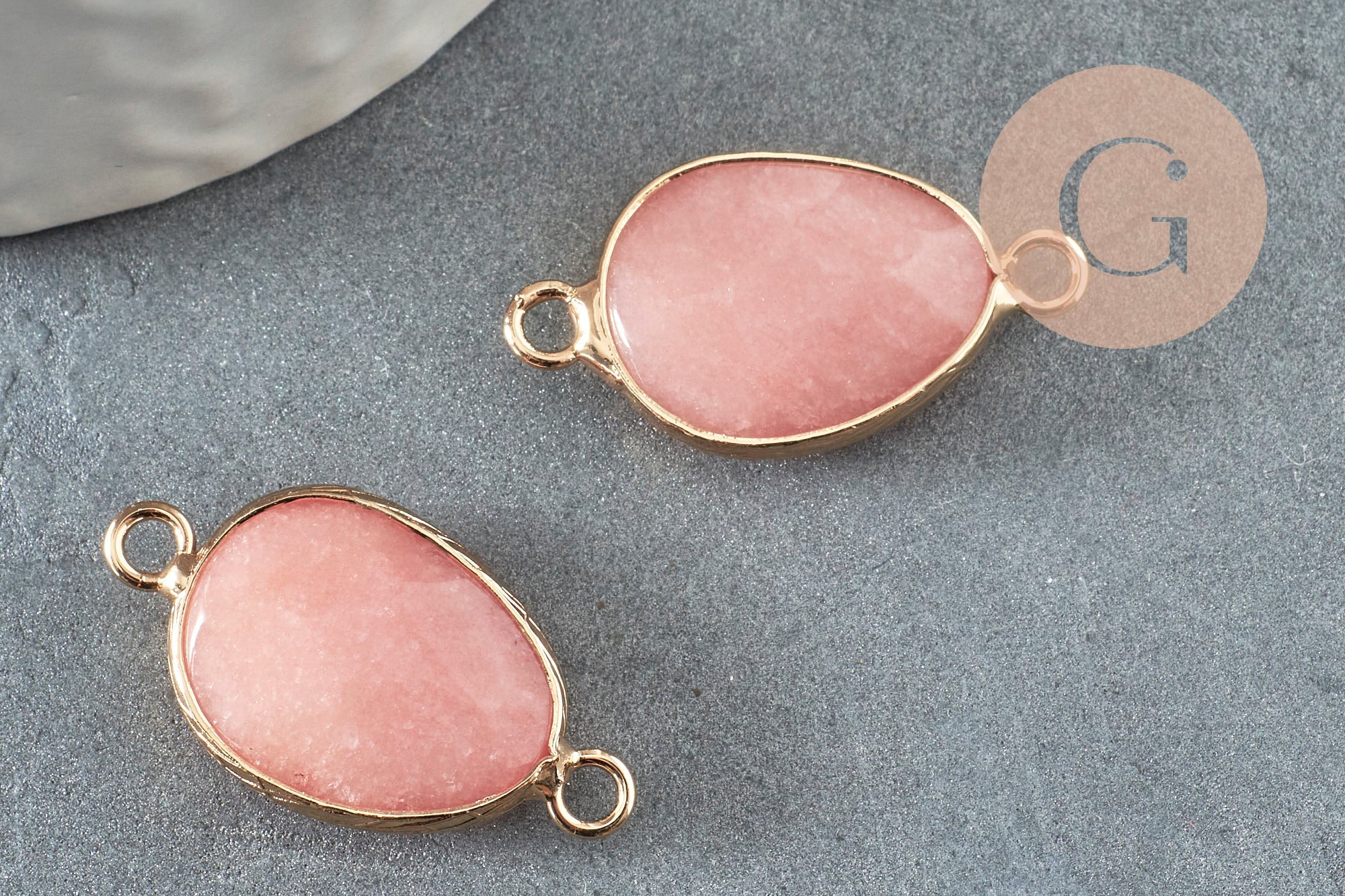 Este colgante de jade natural con un toque rosa, montado sobre un soporte de latón bañado en oro, es perfecto para tus creaciones bohemias y femeninas. Su formato de conector te permite integrarlo fácilmente en collares, pulseras o pendientes añadiendo cadenas, anillos o charms.