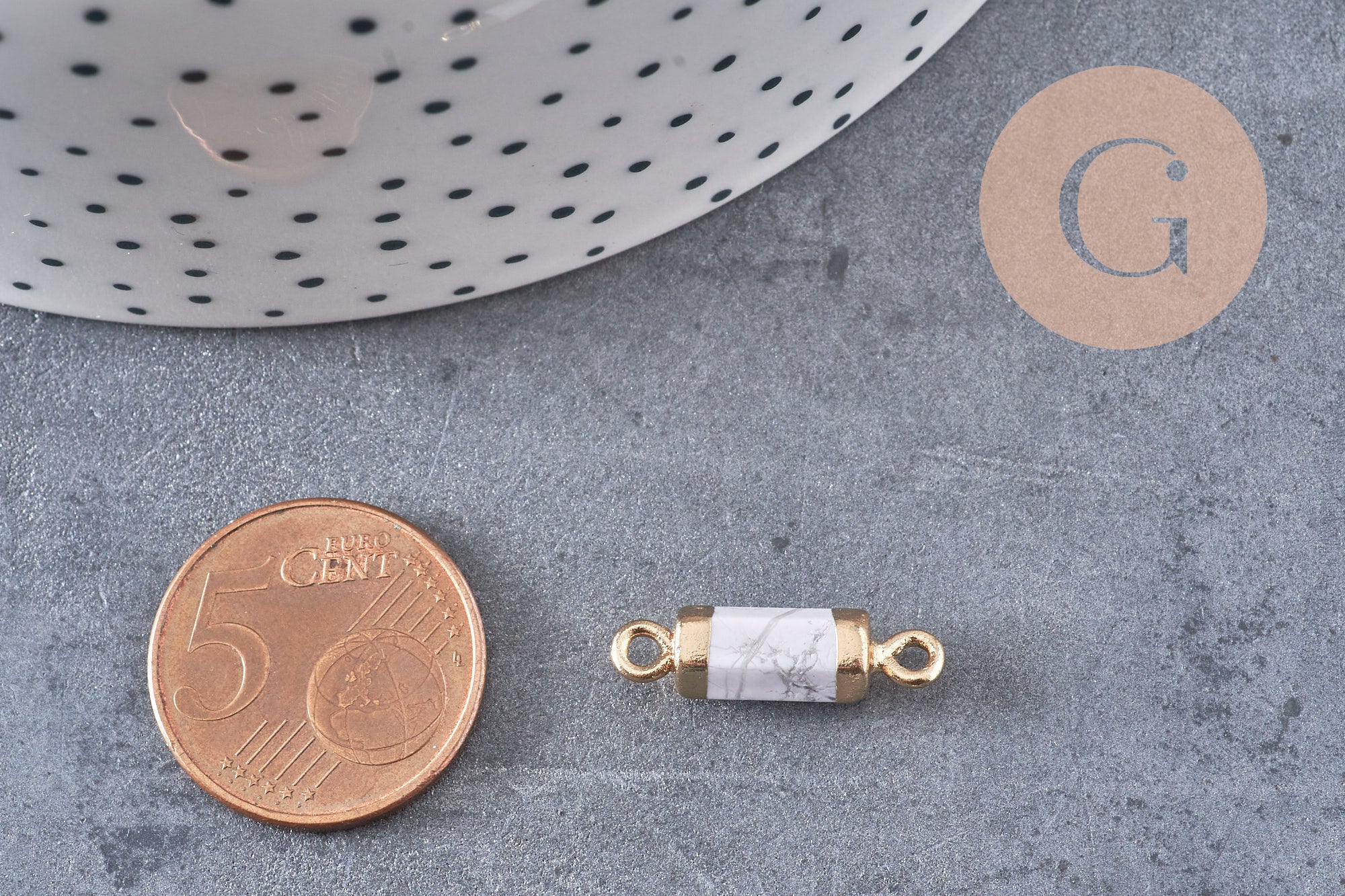 Déjate seducir por este pequeño colgante de howlita natural con su soporte dorado en forma de tubo.