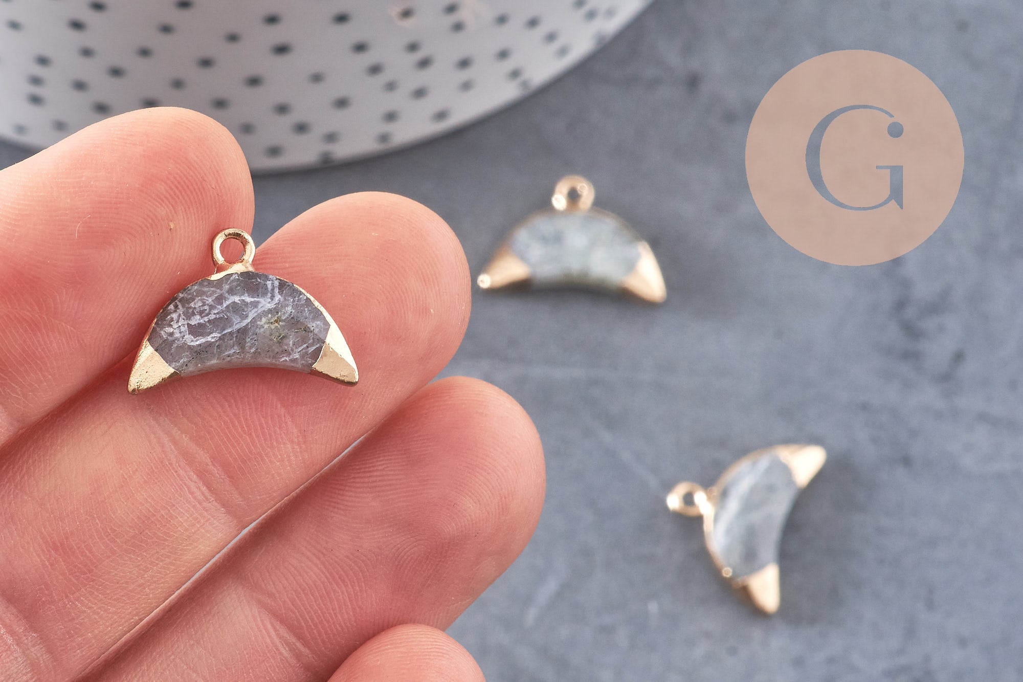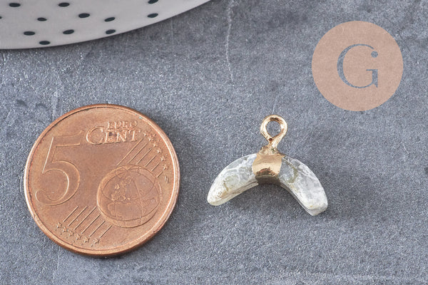 Déjate seducir por este pequeño colgante de labradorita gris con su soporte en forma de media luna dorada.
