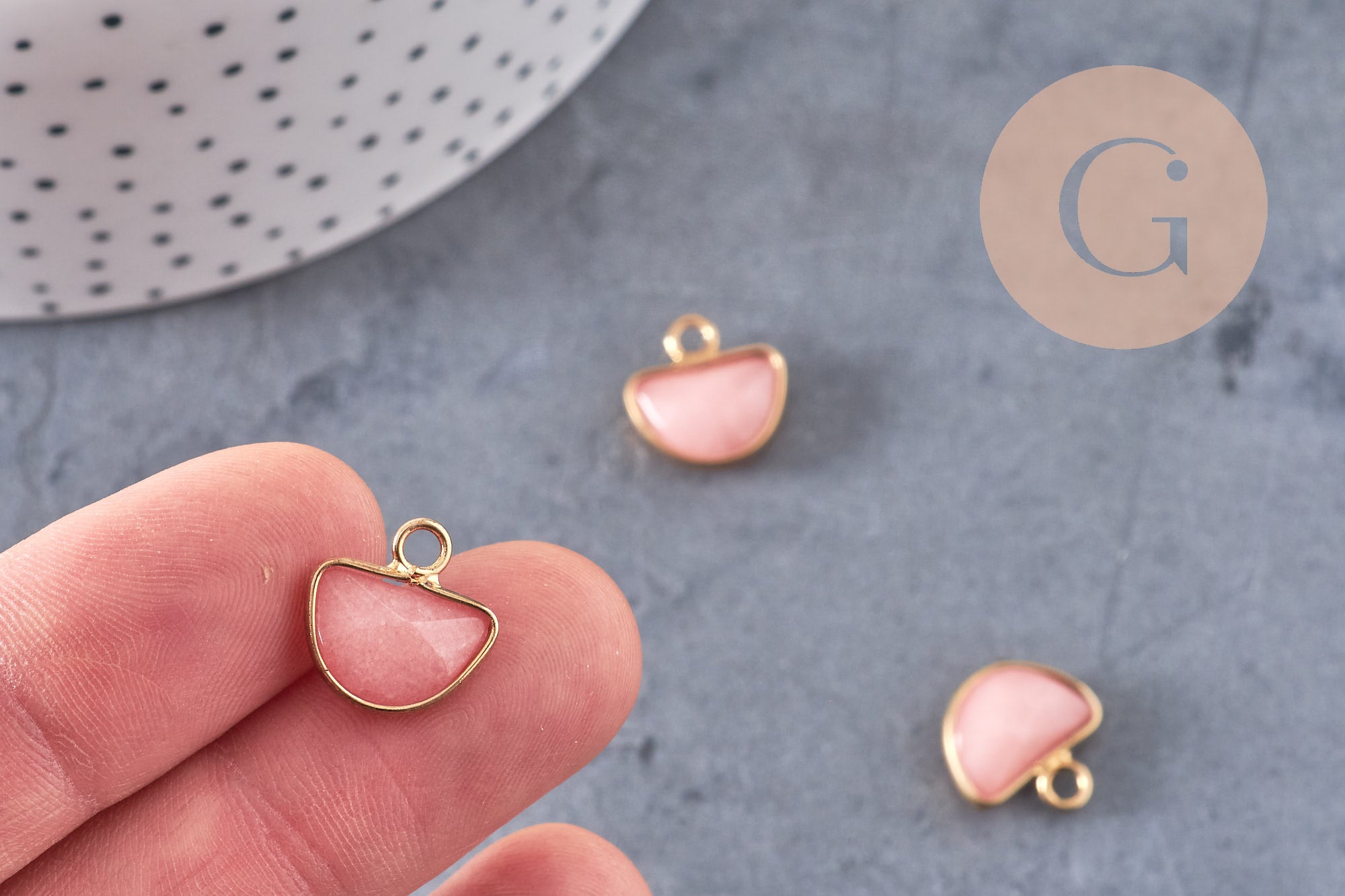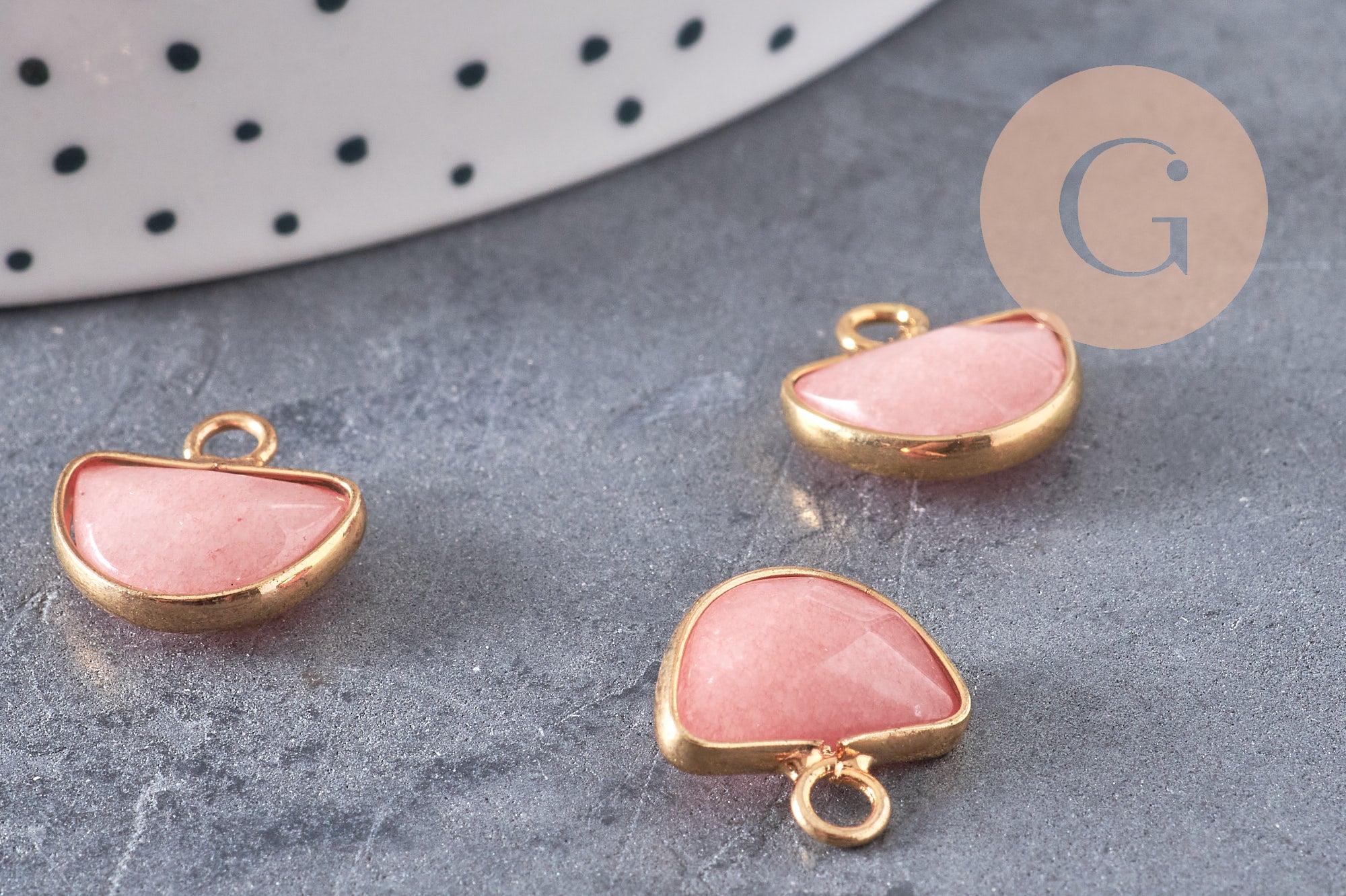 Déjate seducir por este pequeño colgante de jade teñido de rosa coral con su soporte dorado en forma de media luna.