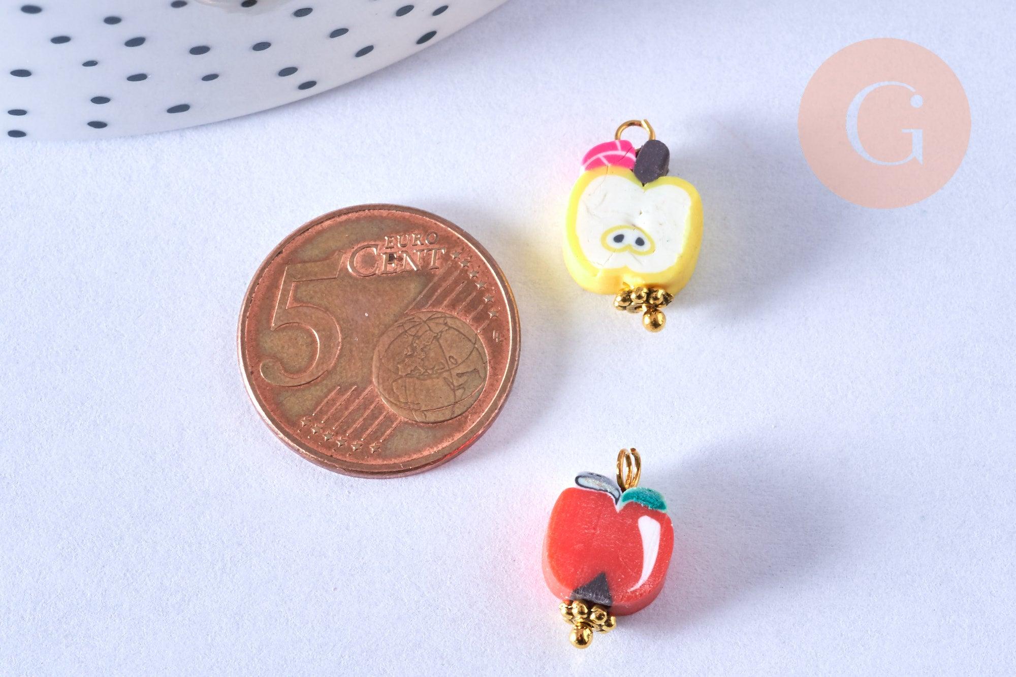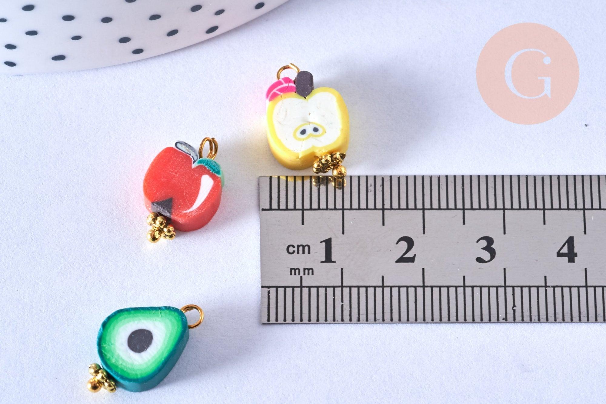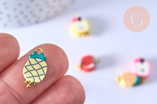 Este lote incluye una mezcla de pequeños colgantes con dijes de frutas en arcilla polimérica multicolor sobre un soporte de zamac dorado.