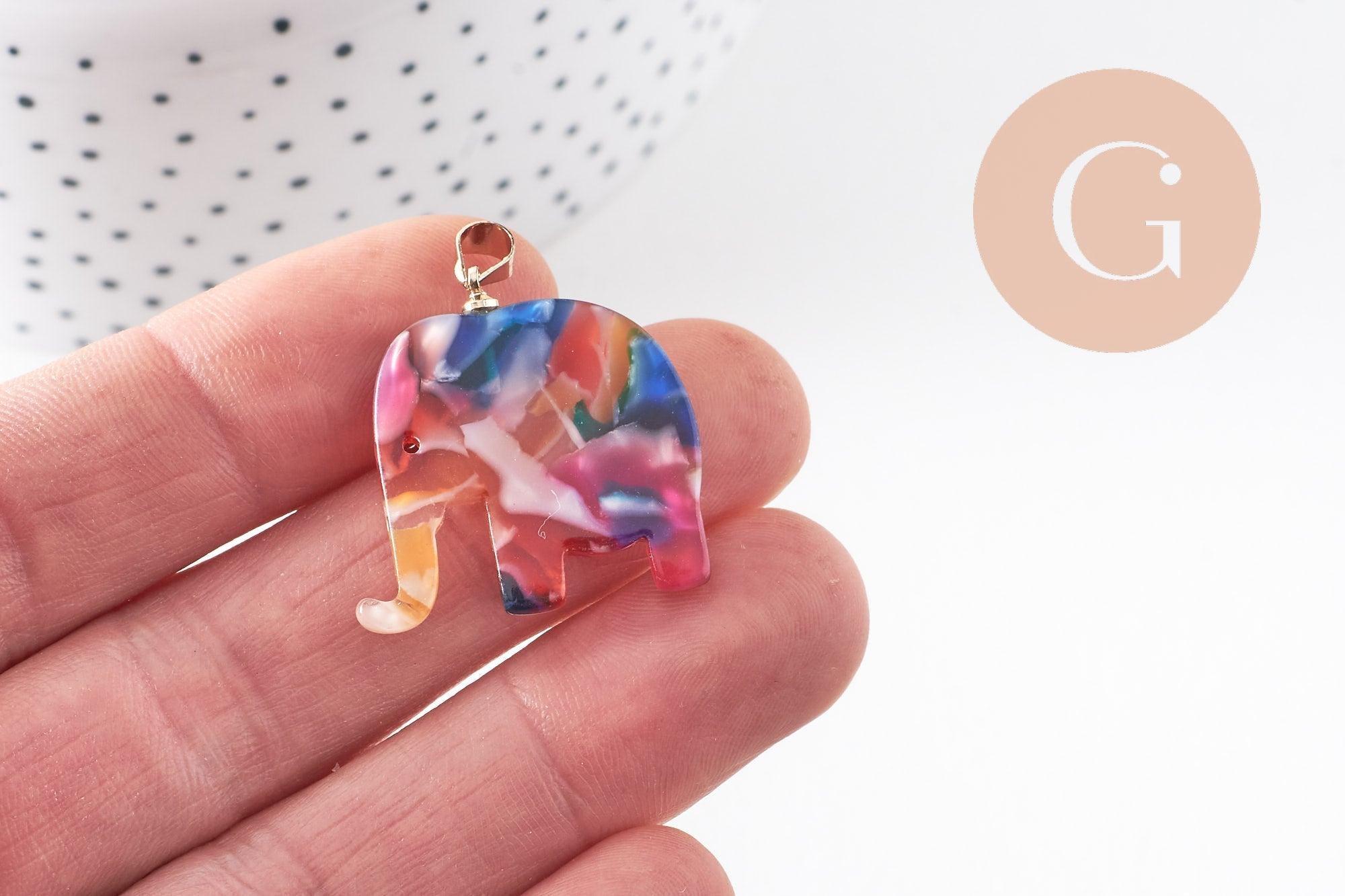 Colgante elefante escamas multicolor, acetato y latón bañado en oro, creación de joyas, cuentas de plástico, 27mm, x1 (G4038)