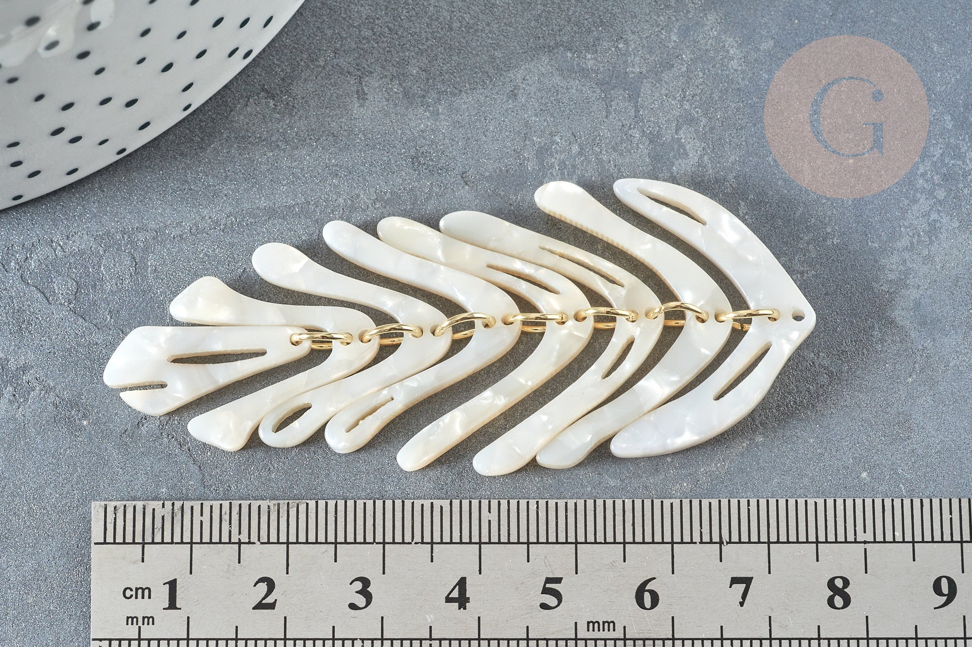 Pendentif feuille acétate blanc fer doré 70-76mm, plastique, x2 (G7351)