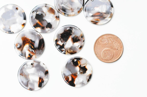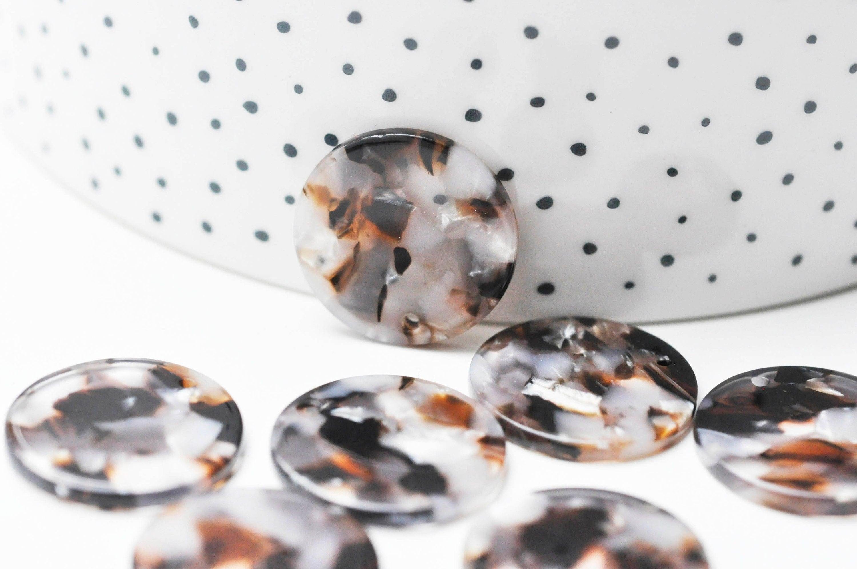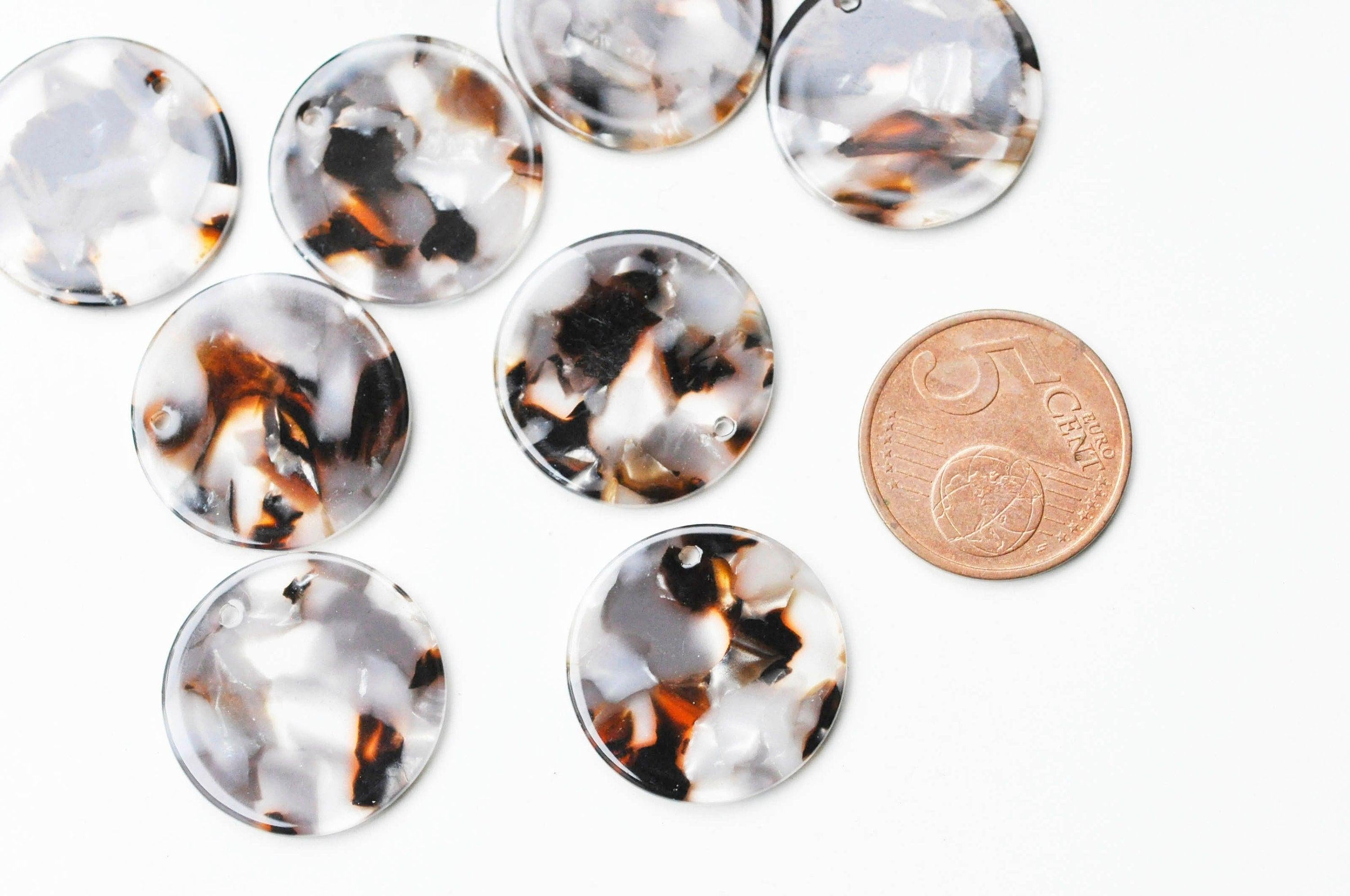 Dale un toque gráfico y contemporáneo a tus creaciones con estos colgantes redondos de acetato de celulosa , con un bonito estampado de carey marrón-beige. Ligeros, modernos y ultramodernos, son perfectos para crear pendientes o collares con un estilo definido.