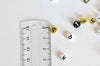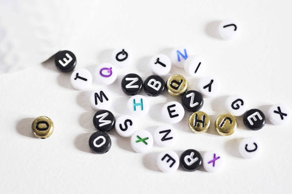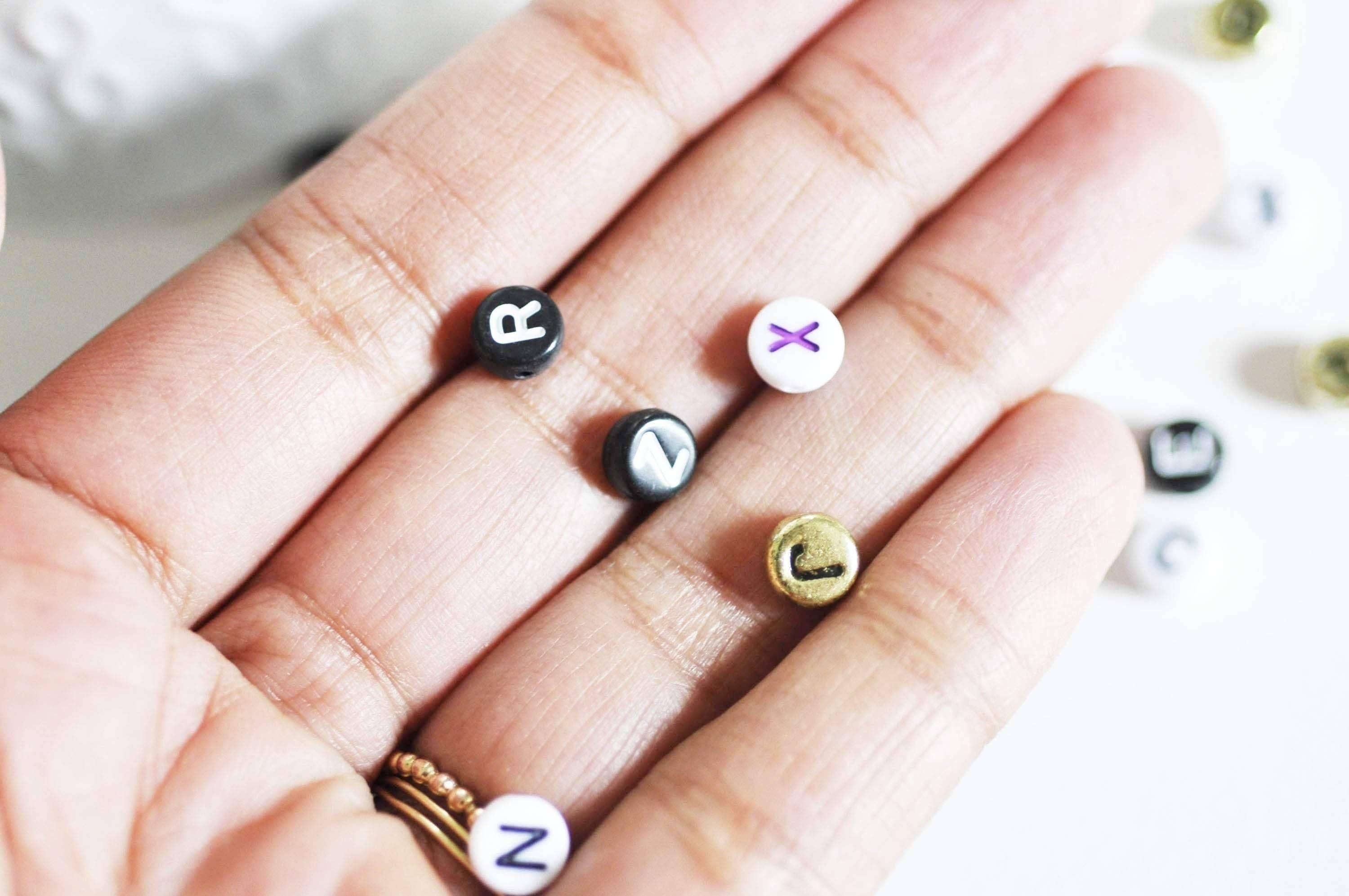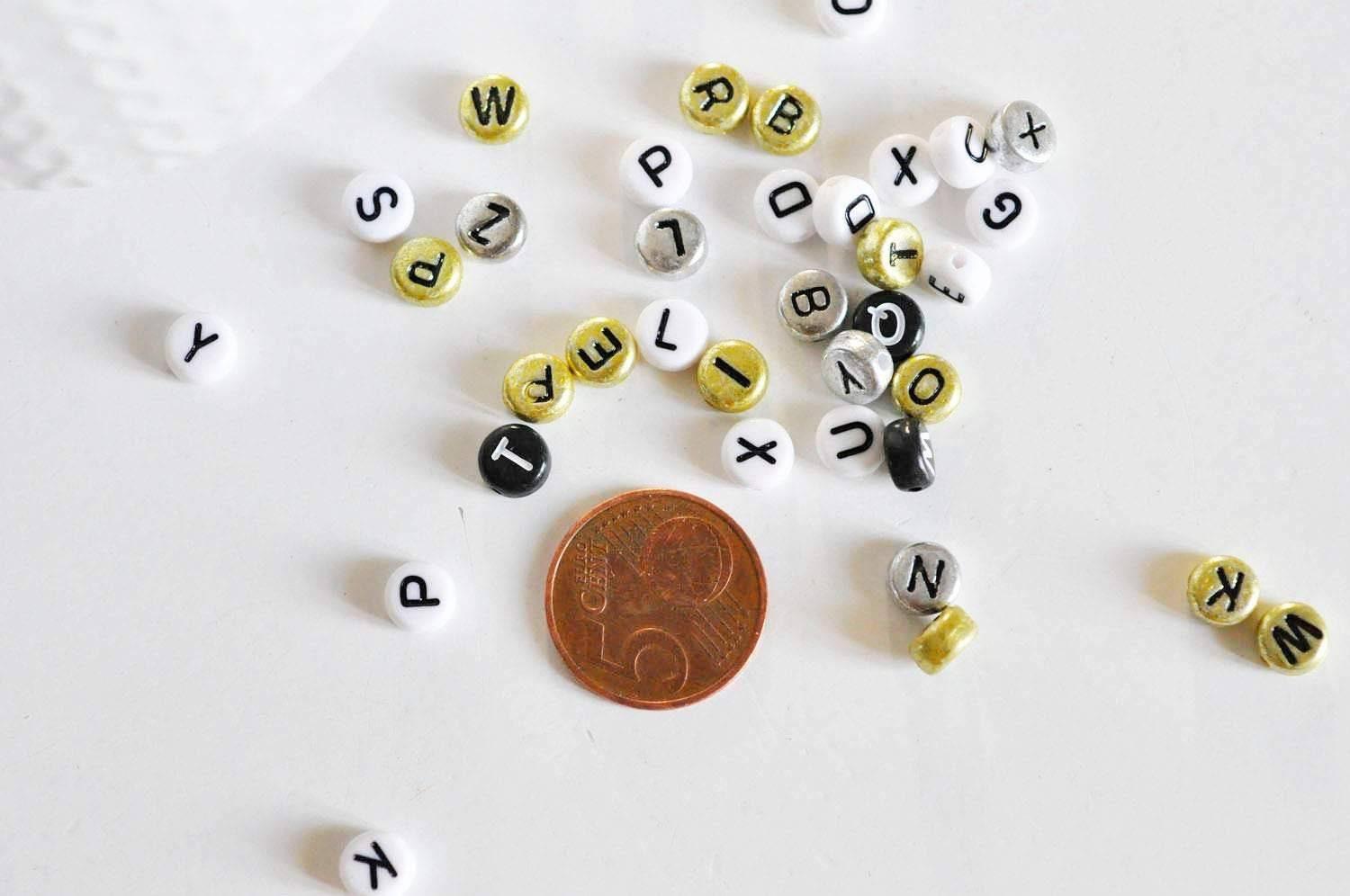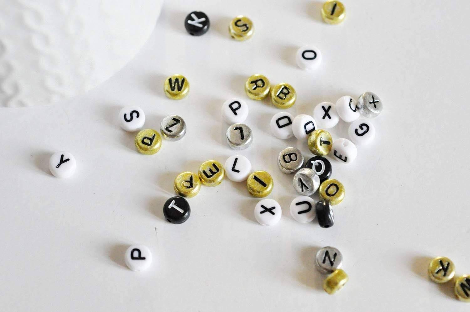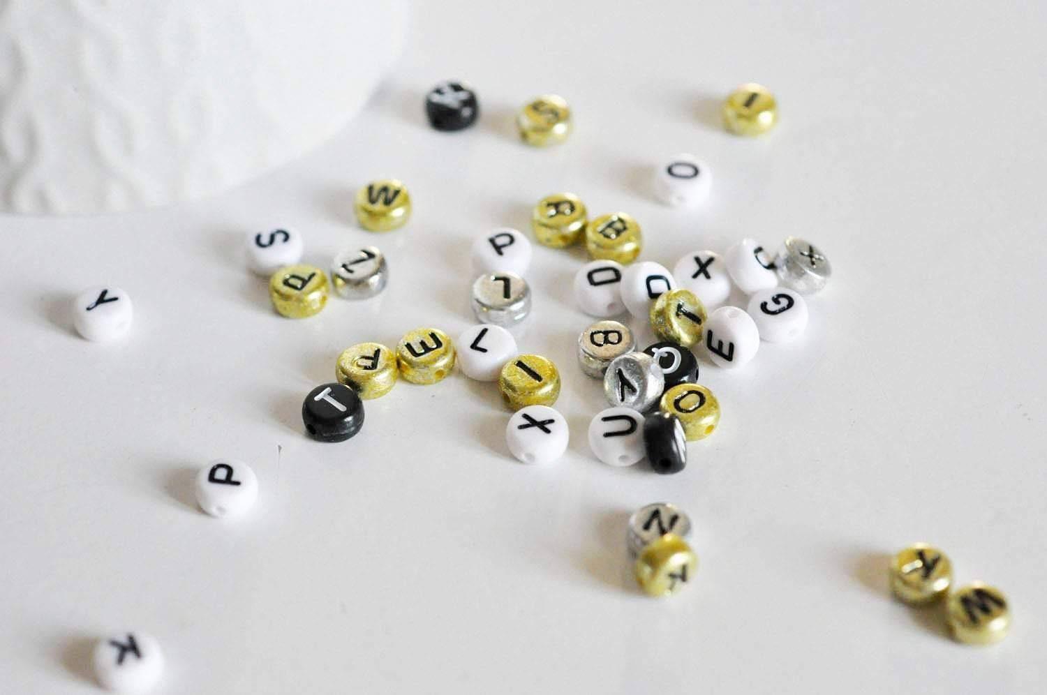 Crea joyas personalizadas con estas cuentas redondas de plástico con letras en blanco, negro, dorado y plateado. ¡Ideales para crear pulseras, collares o llaveros con mensajes únicos!