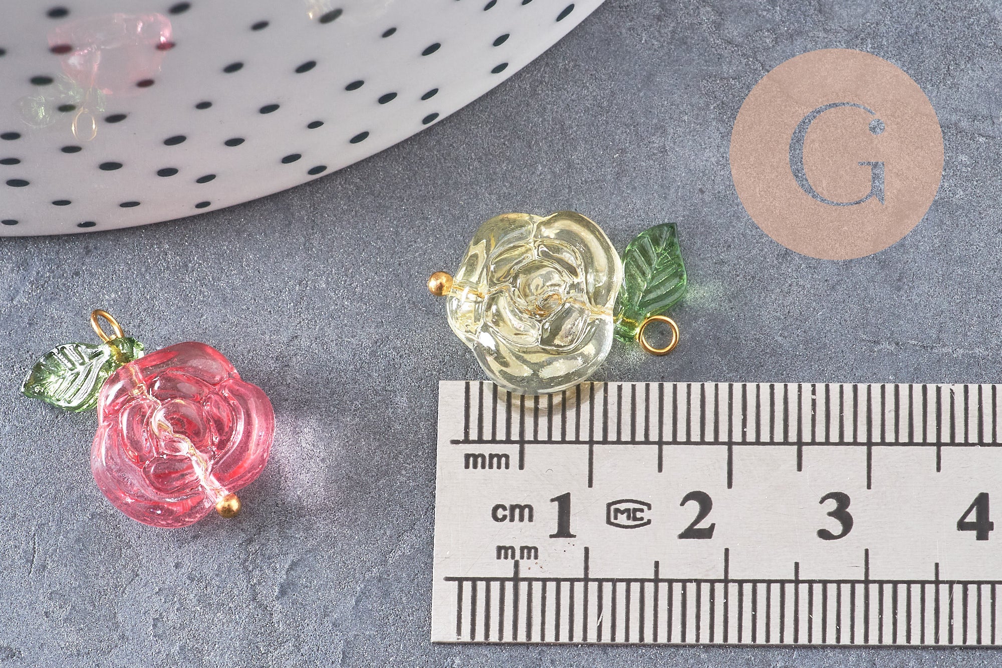 Dale un toque floral y colorido a tus creaciones DIY con estos dijes de rosas de cristal multicolor , delicadamente montados sobre un asa de latón bañado en oro y acompañados de una pequeña hoja de acrílico. Su diseño refinado y luminoso los convierte en la pieza perfecta para una romántica bisutería primaveral.