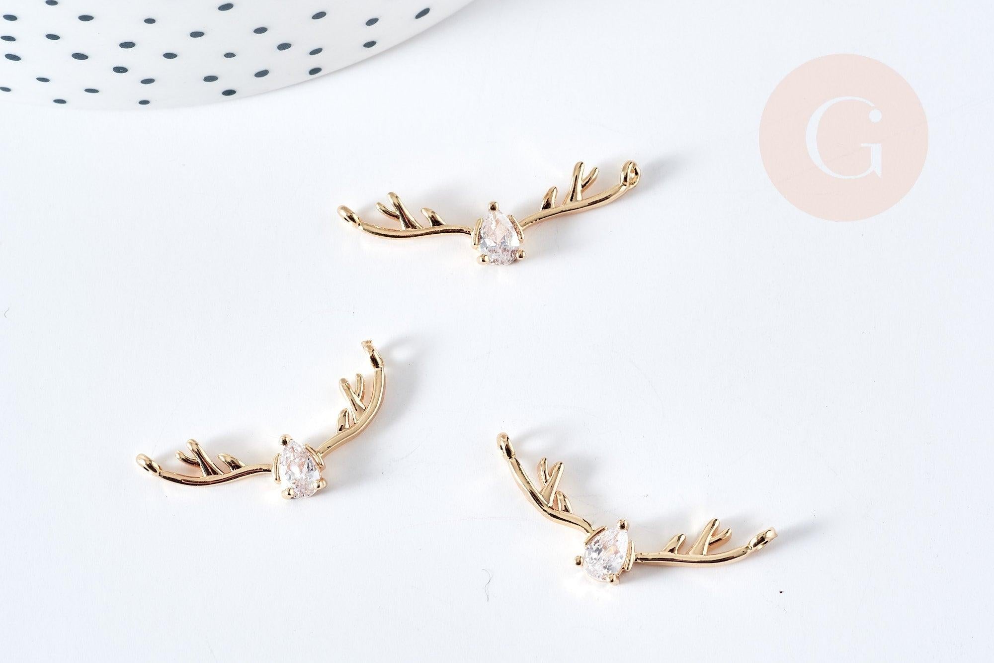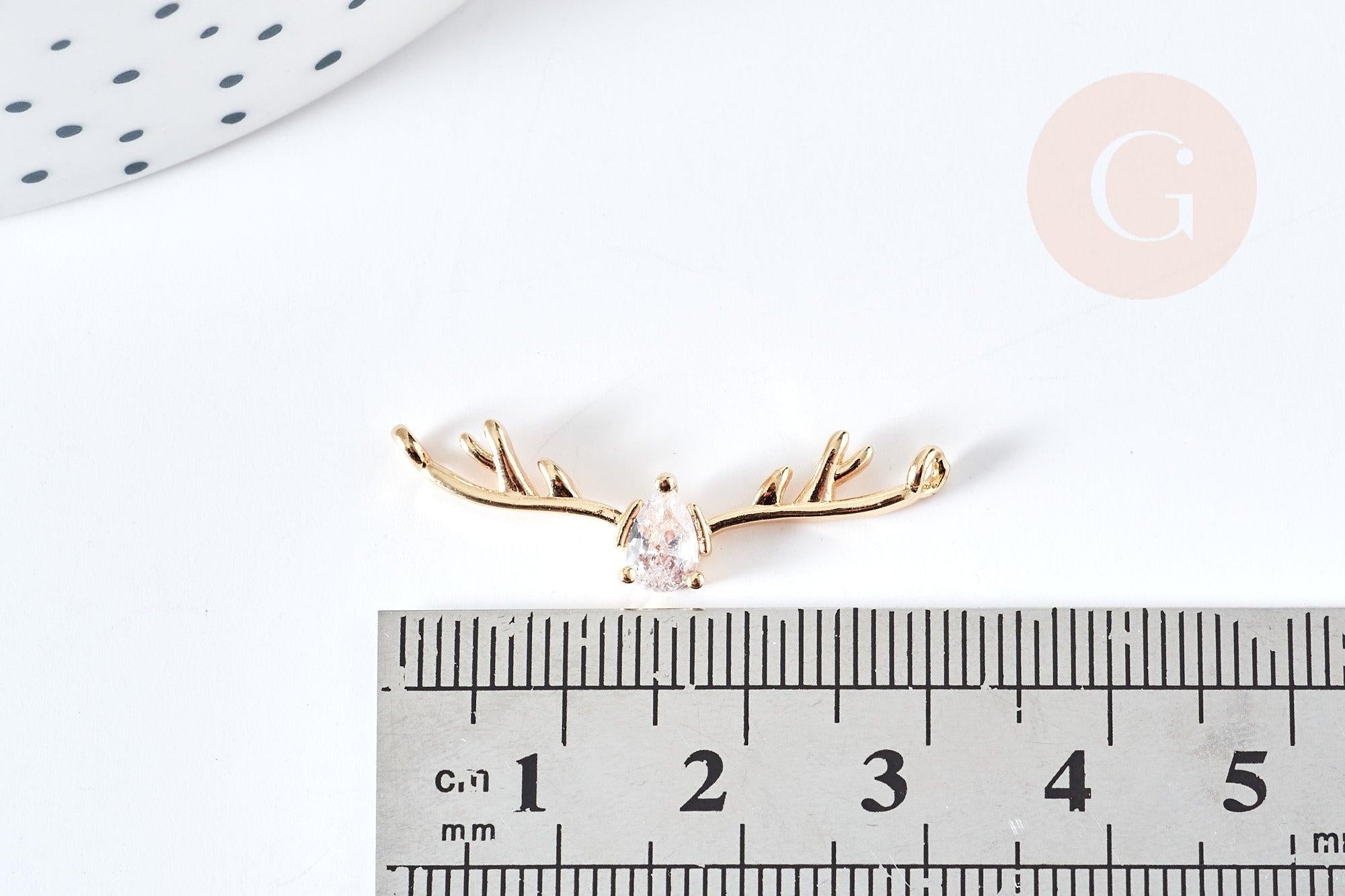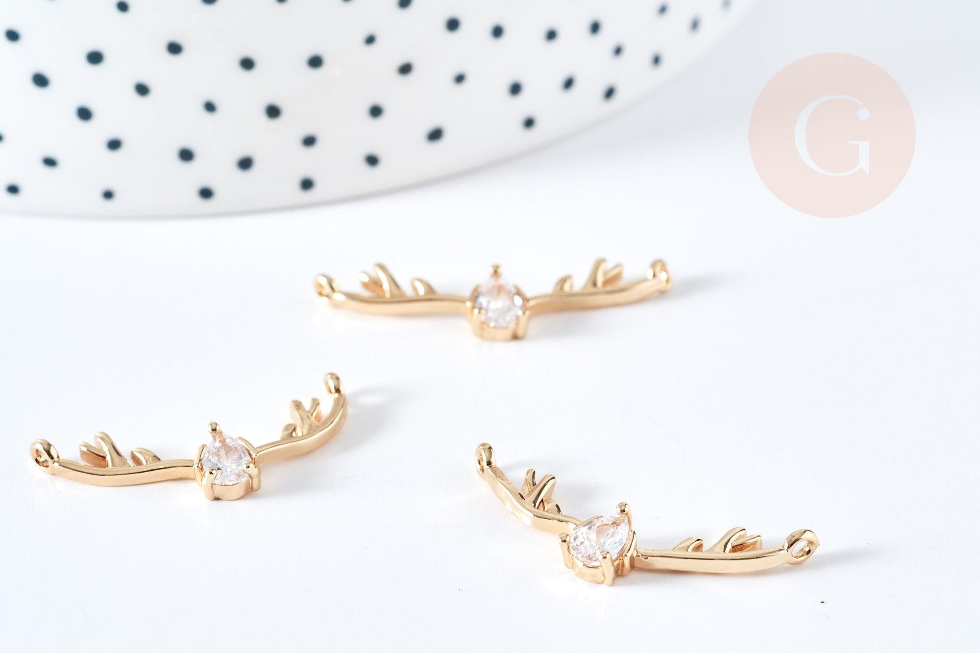 Pendentif connecteur bois de cerf laiton doré 18K cristal zircon blanc 31.5mm, pendentif doré pour création bijou porte-bonheur, x1 G8578