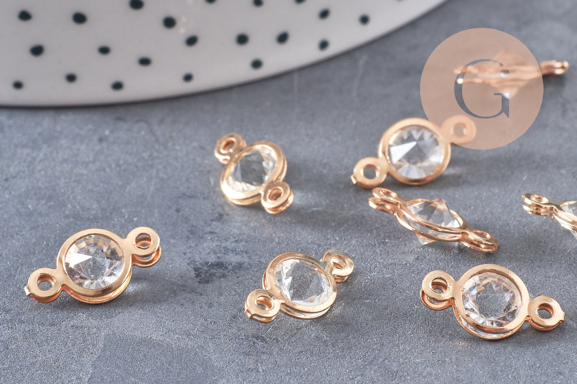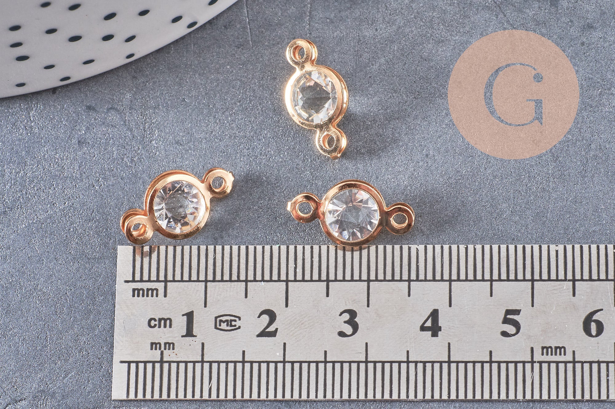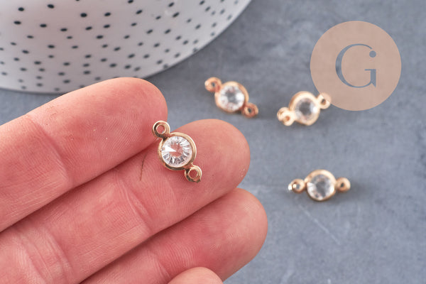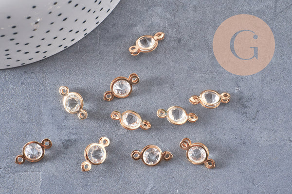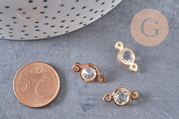 Este colgante con conector redondo de 15 mm , en hierro bañado en oro , está adornado con un cristal transparente brillante , que aporta un toque de elegancia y refinamiento a sus creaciones.