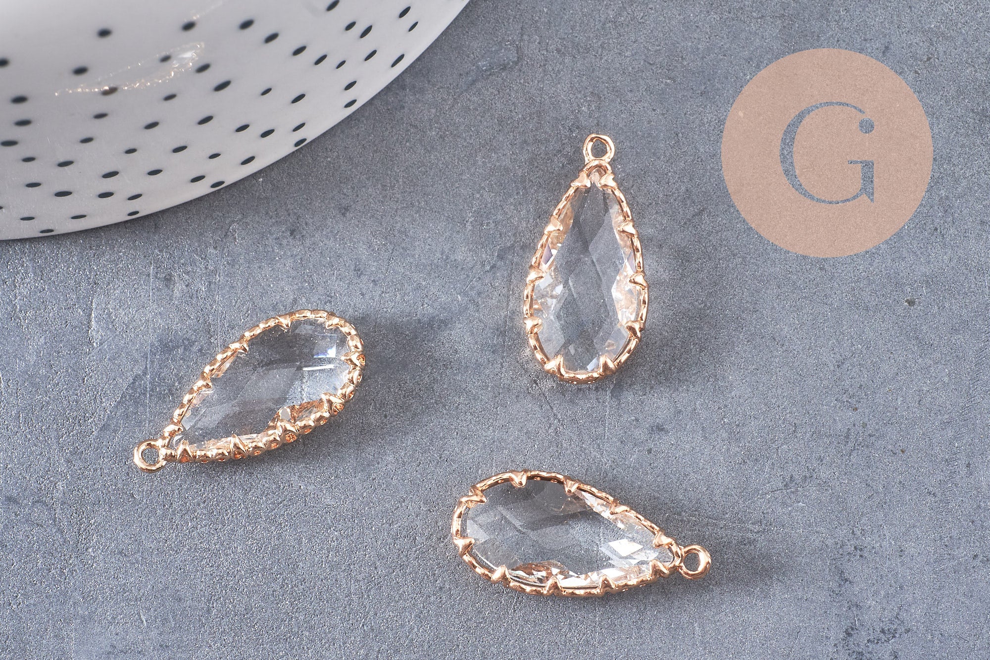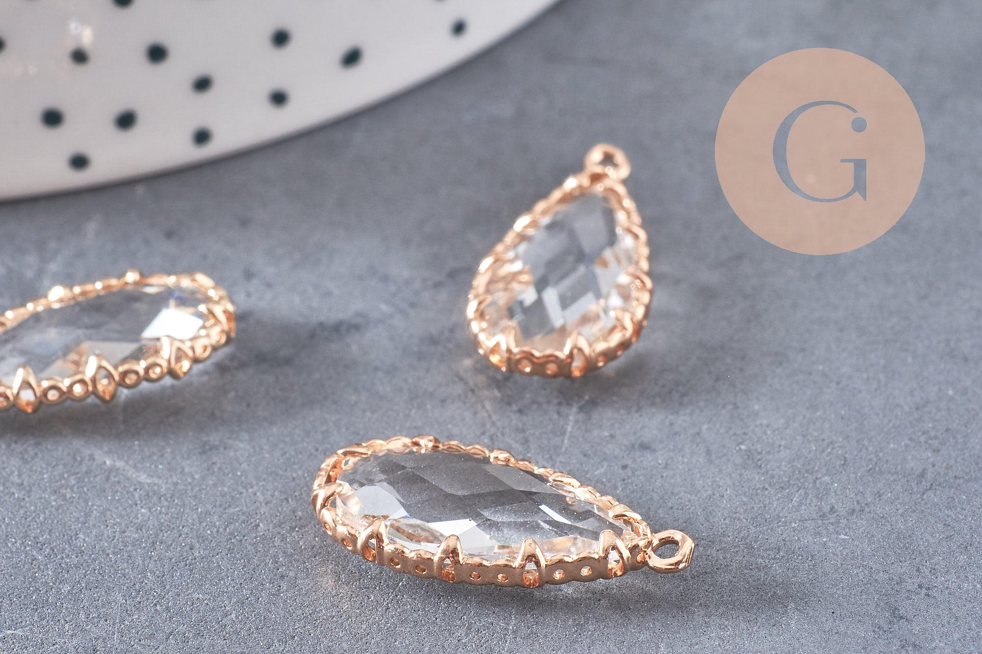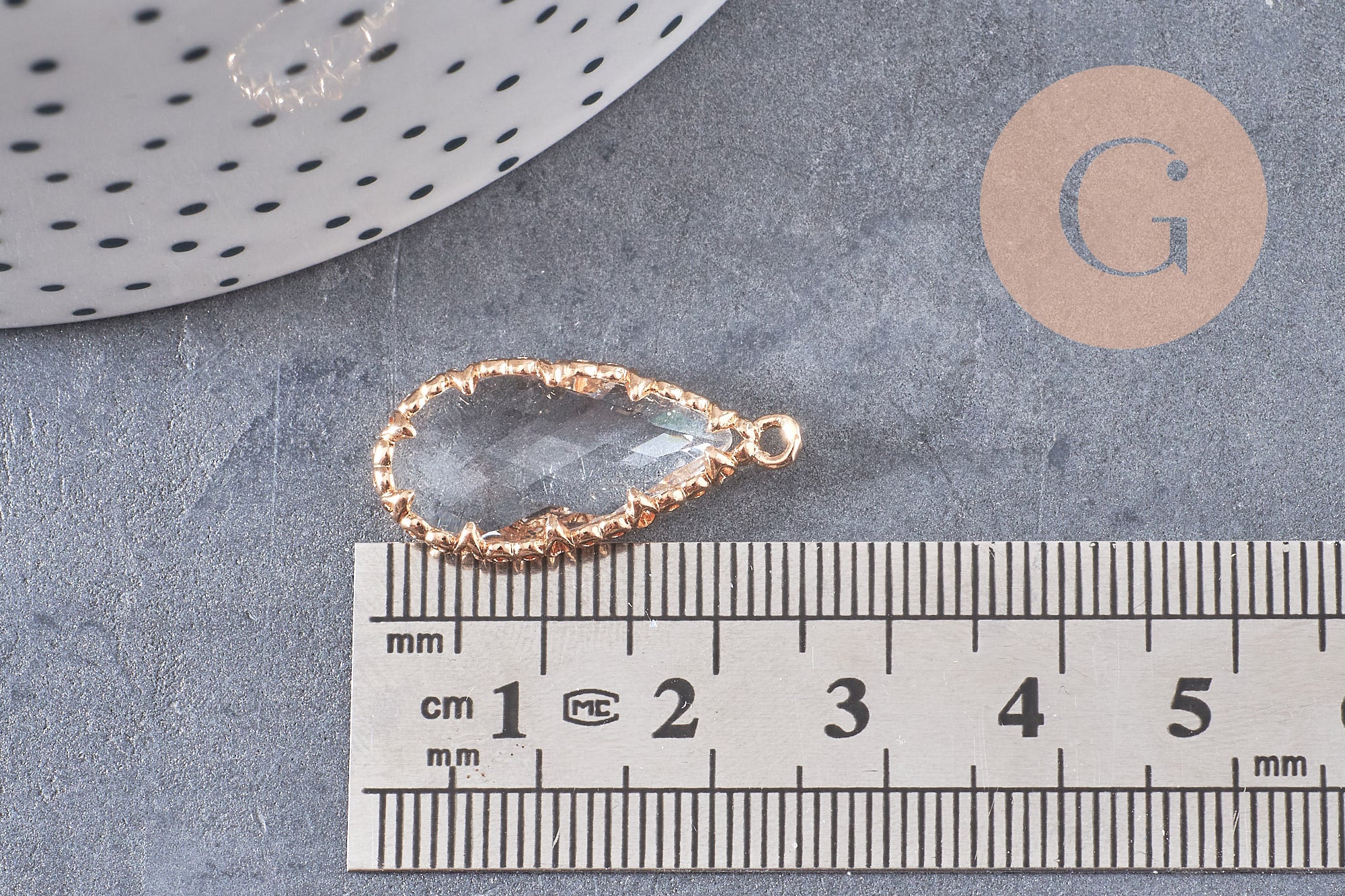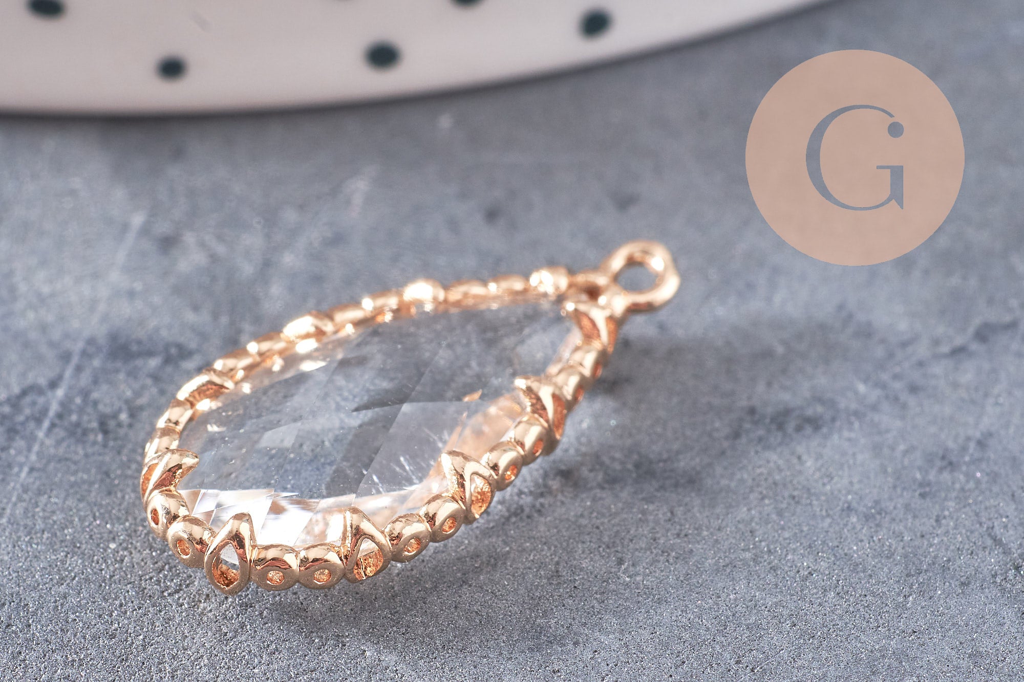 Añade un toque de elegancia atemporal a tus creaciones con este colgante de lágrima de cristal transparente facetado , rodeado de latón chapado en oro.
