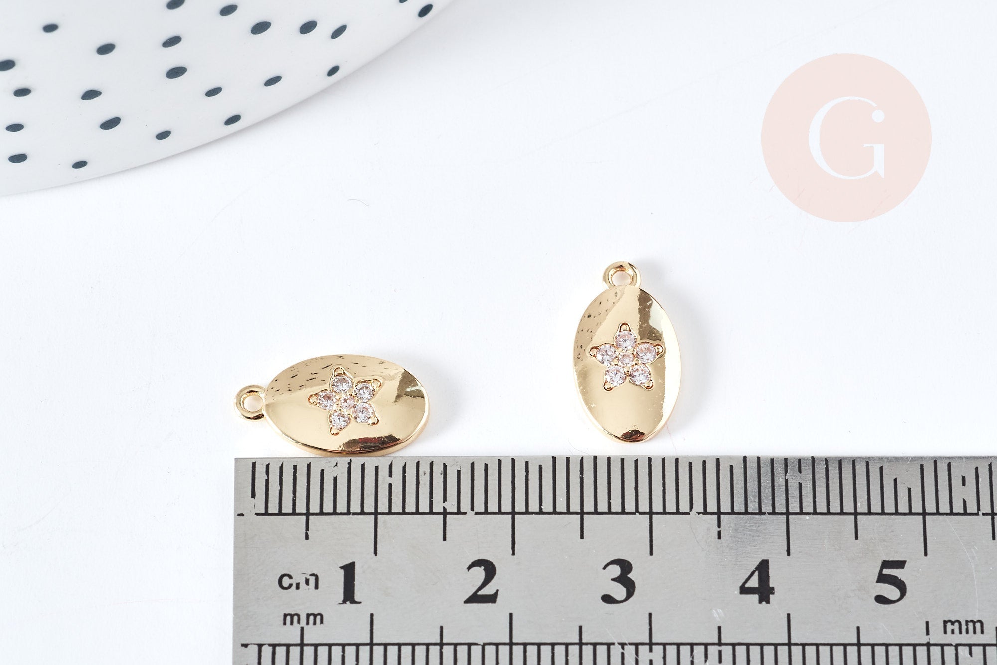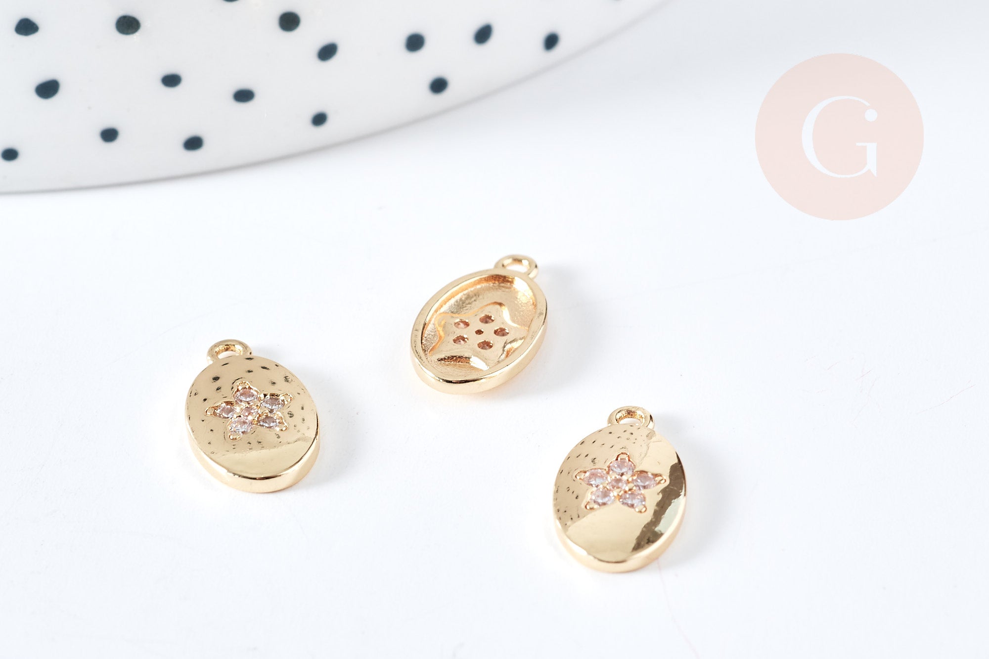 Pendentif ovale fleur laiton doré 14K cristal zircon blanc 14.5mm, pendentif doré création bijou, x1 (G8585)
