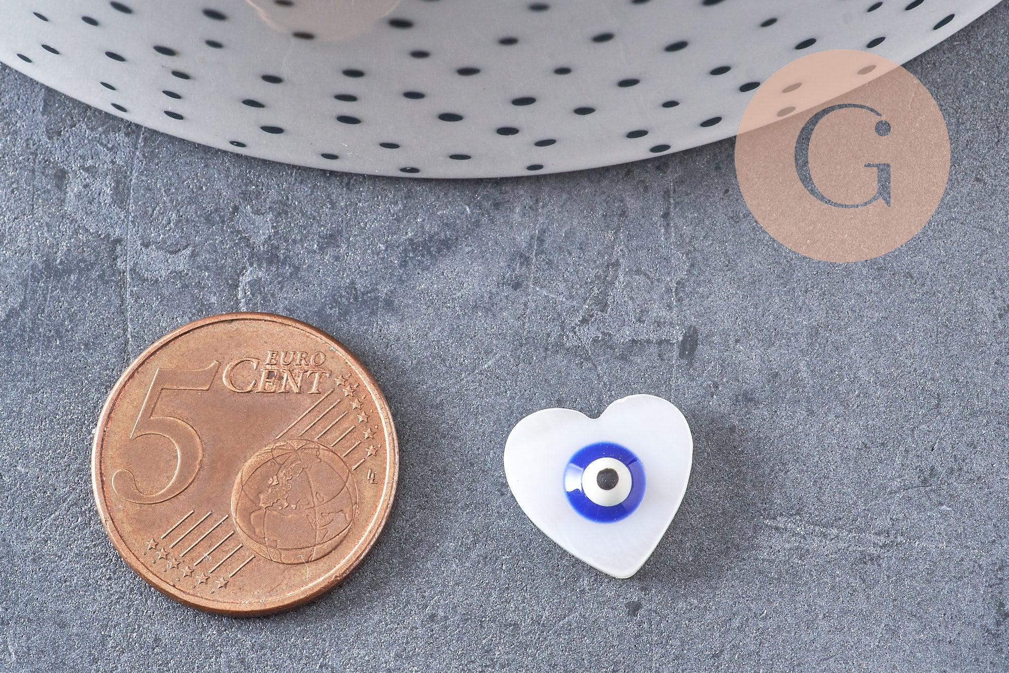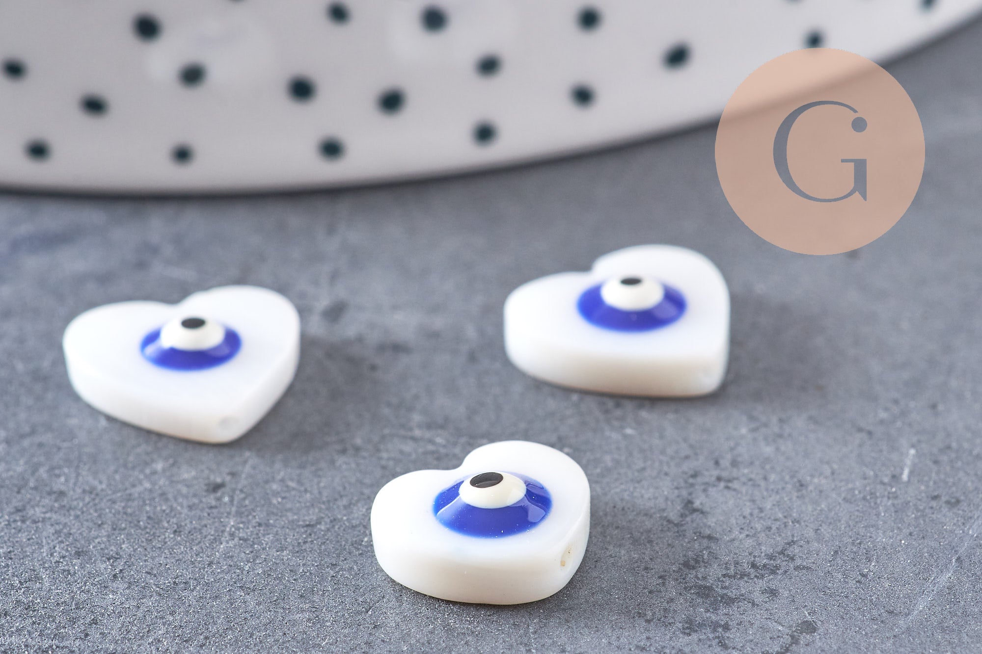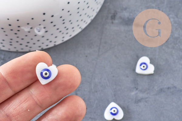 Para personalizar sus joyas y otros accesorios textiles o de piel suave, opte por este juego de 10 cuentas de corazón de nácar blanco que representan el ojo de la suerte.