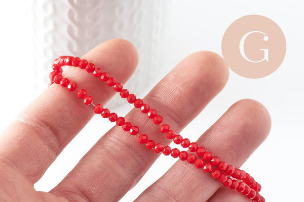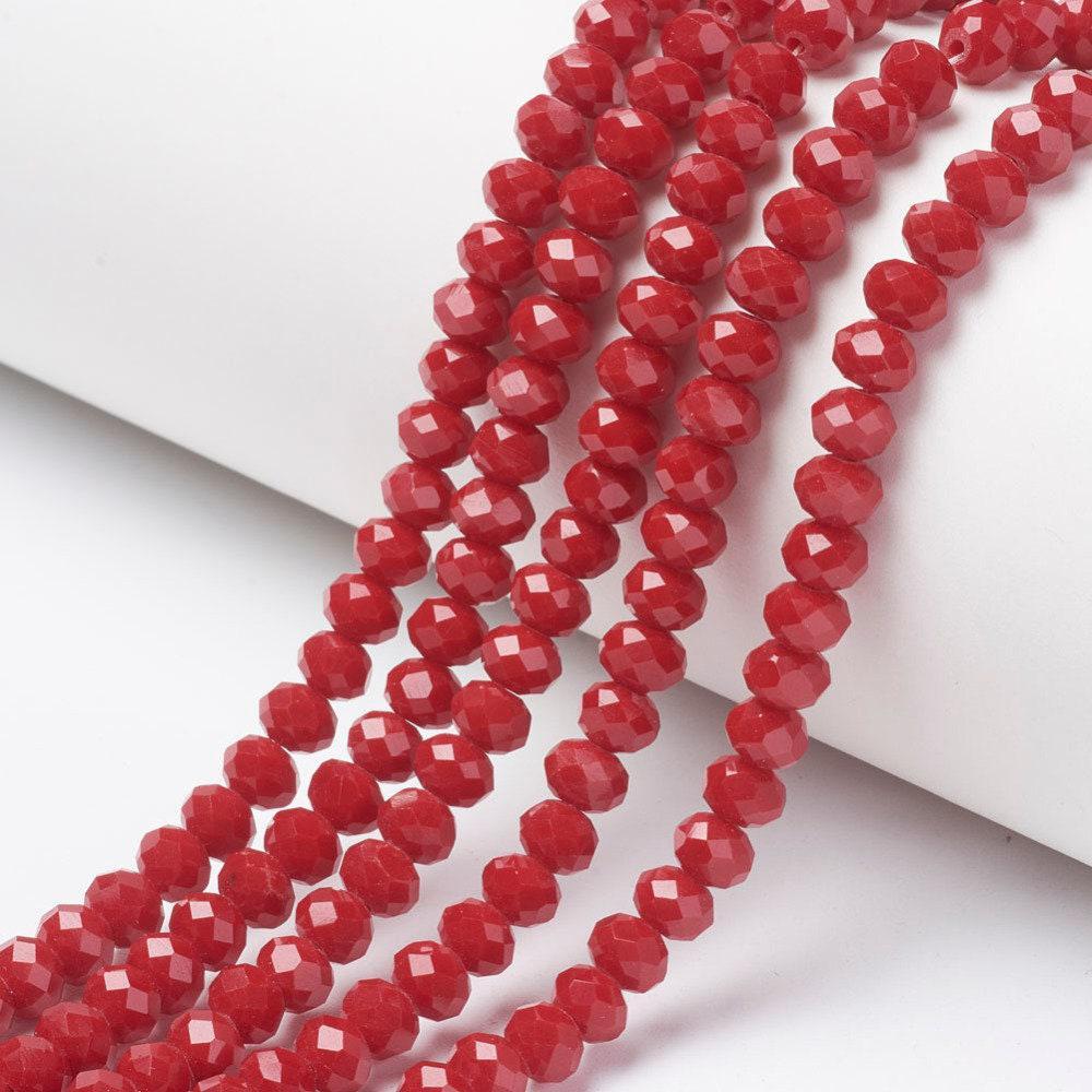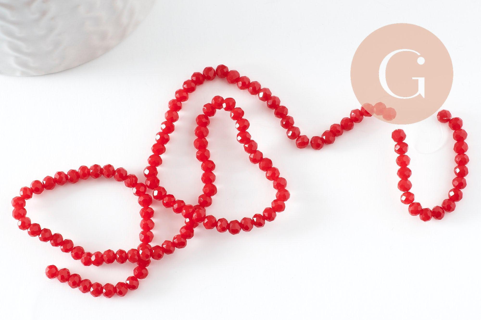 Una tira de aproximadamente 125 cuentas de peonza facetadas en cristal rojo brillante, ideal para hacer todas tus joyas.
