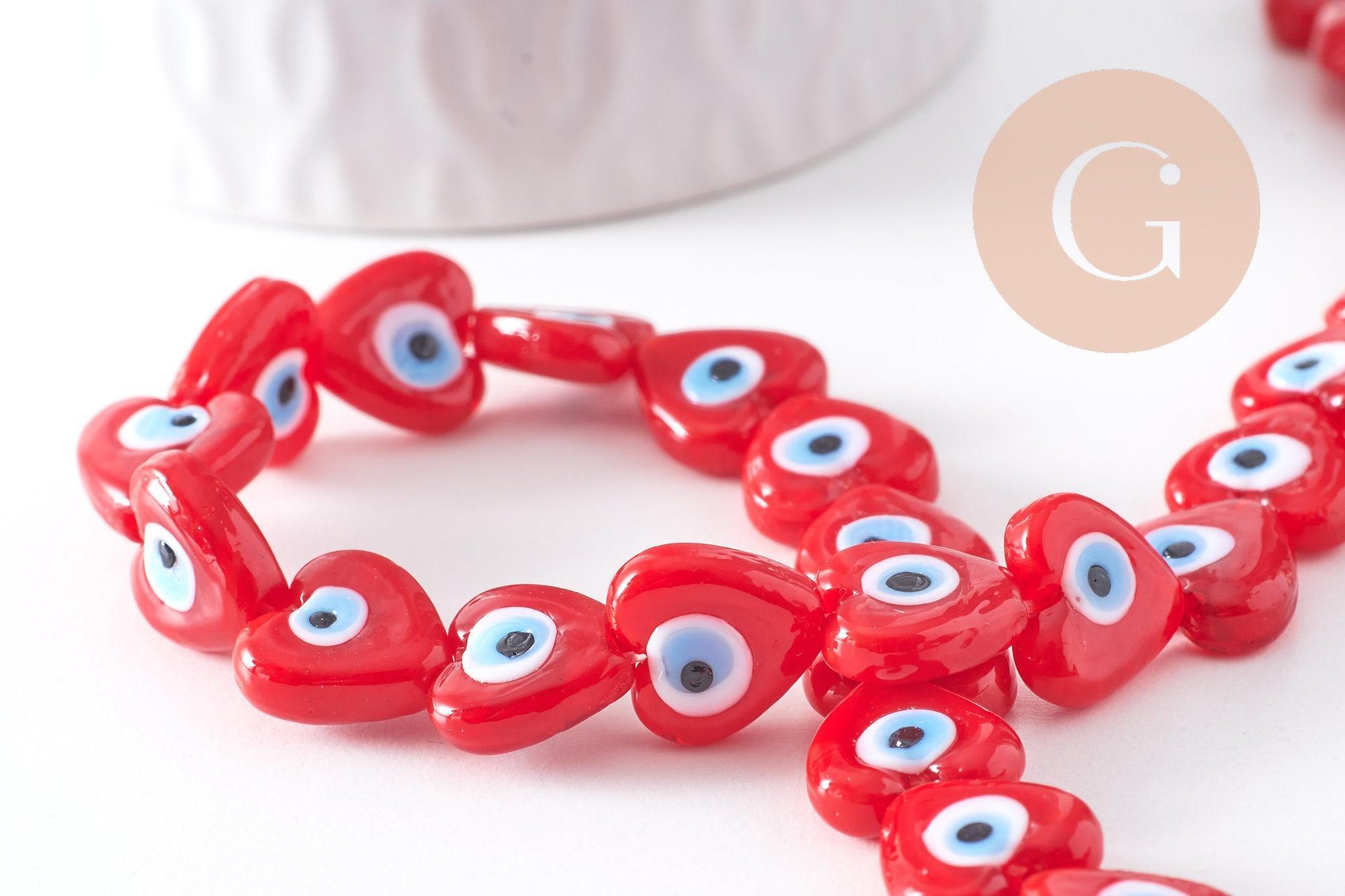 Aporta un toque de protección y elegancia a tus creaciones con estas cuentas de corazón de ojo malvado de cristal rojo . Simbolizando la protección contra las energías negativas, estas cuentas de 12 mm son perfectas para hacer pulseras, collares y pendientes. Su vibrante tono rojo añade un toque de pasión y dinamismo a tus joyas DIY.