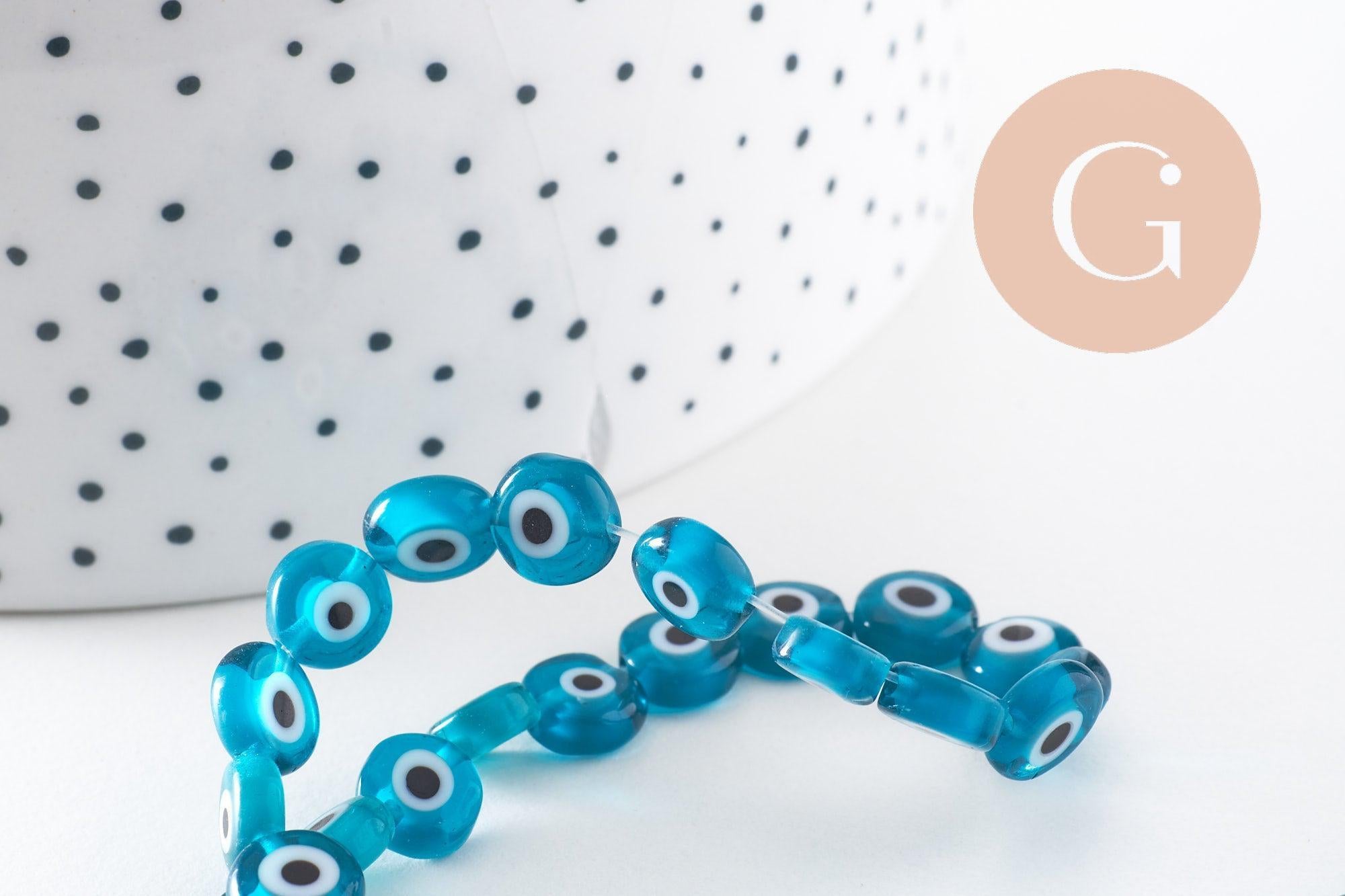 Cuenta de disco griego Evil Eye, vidrio azul turquesa, cuenta de vidrio de la suerte, cuenta de vidrio artesanal, creación de joyería de 8 mm, hilo de 49 cuentas