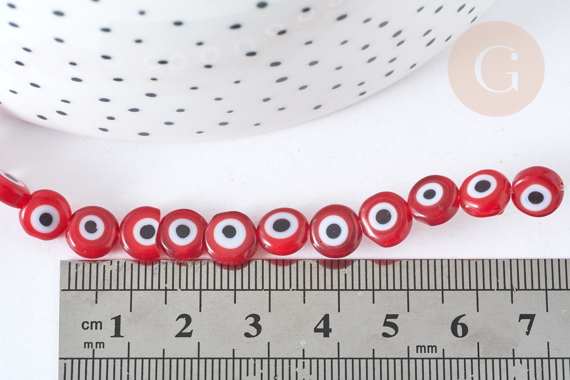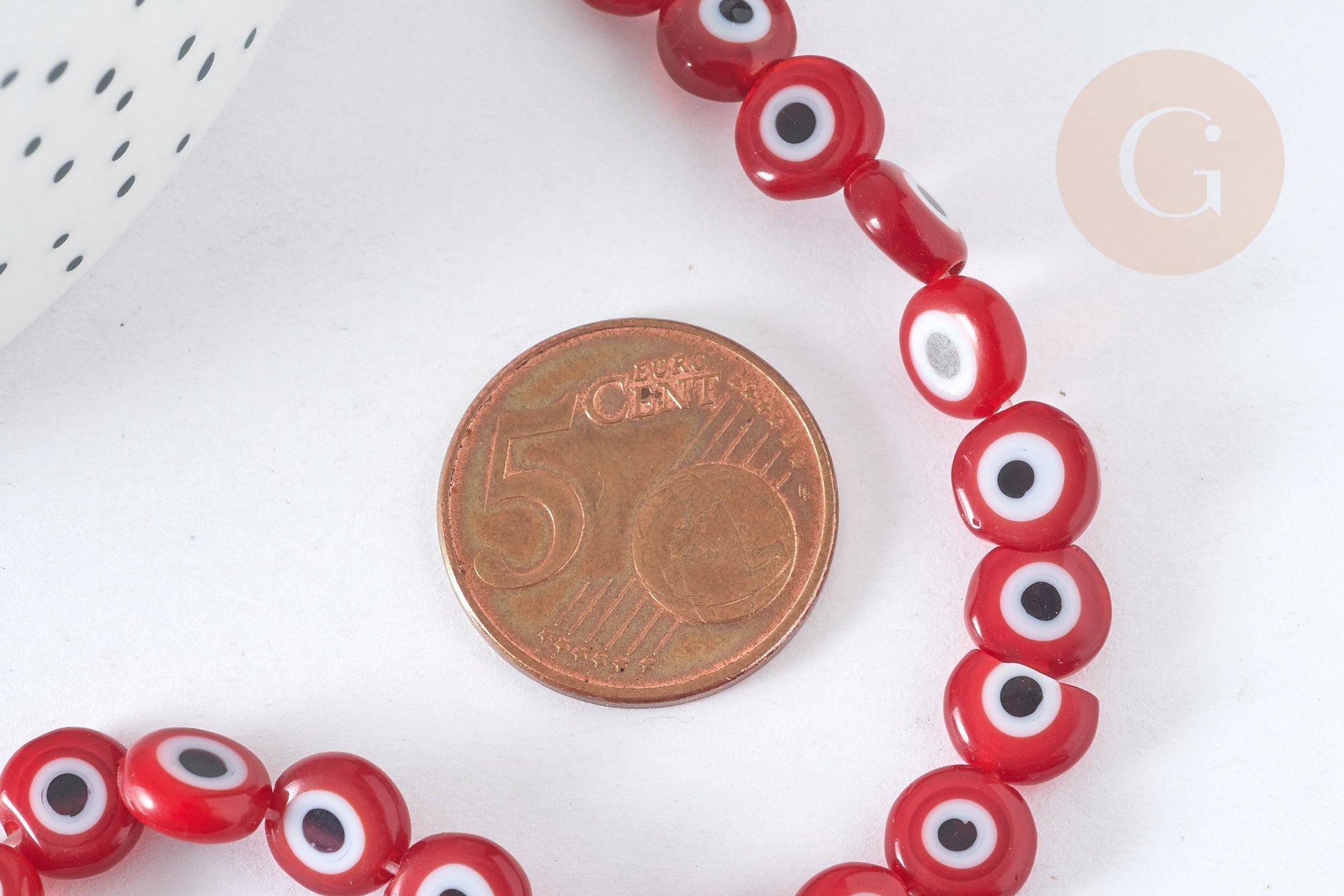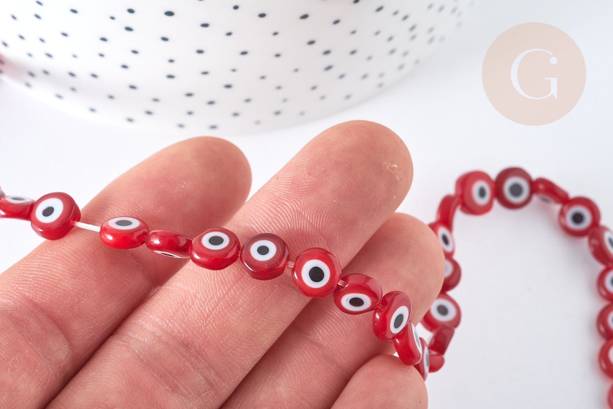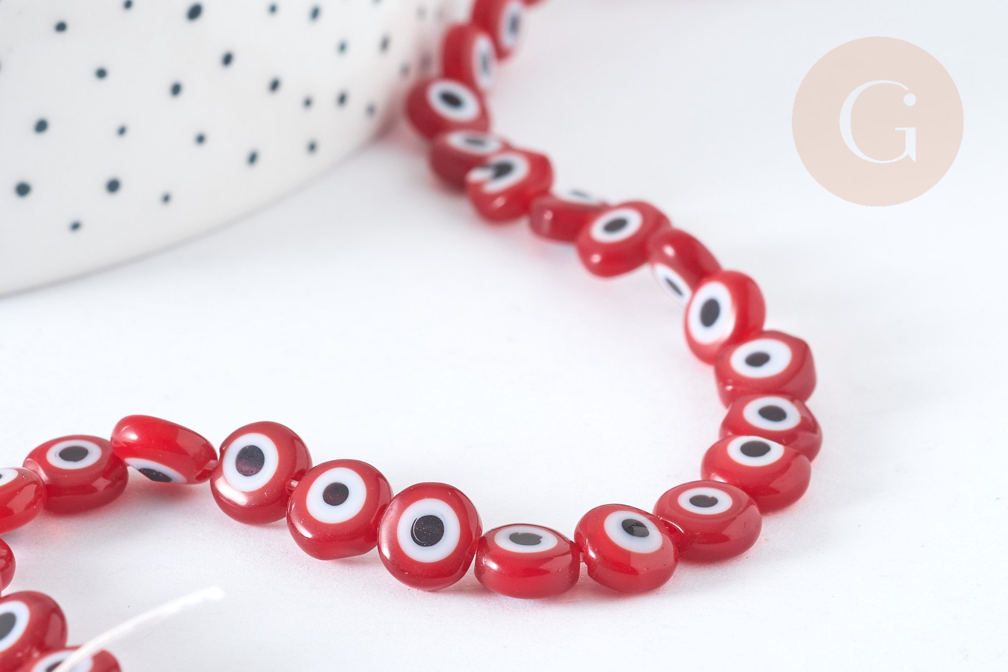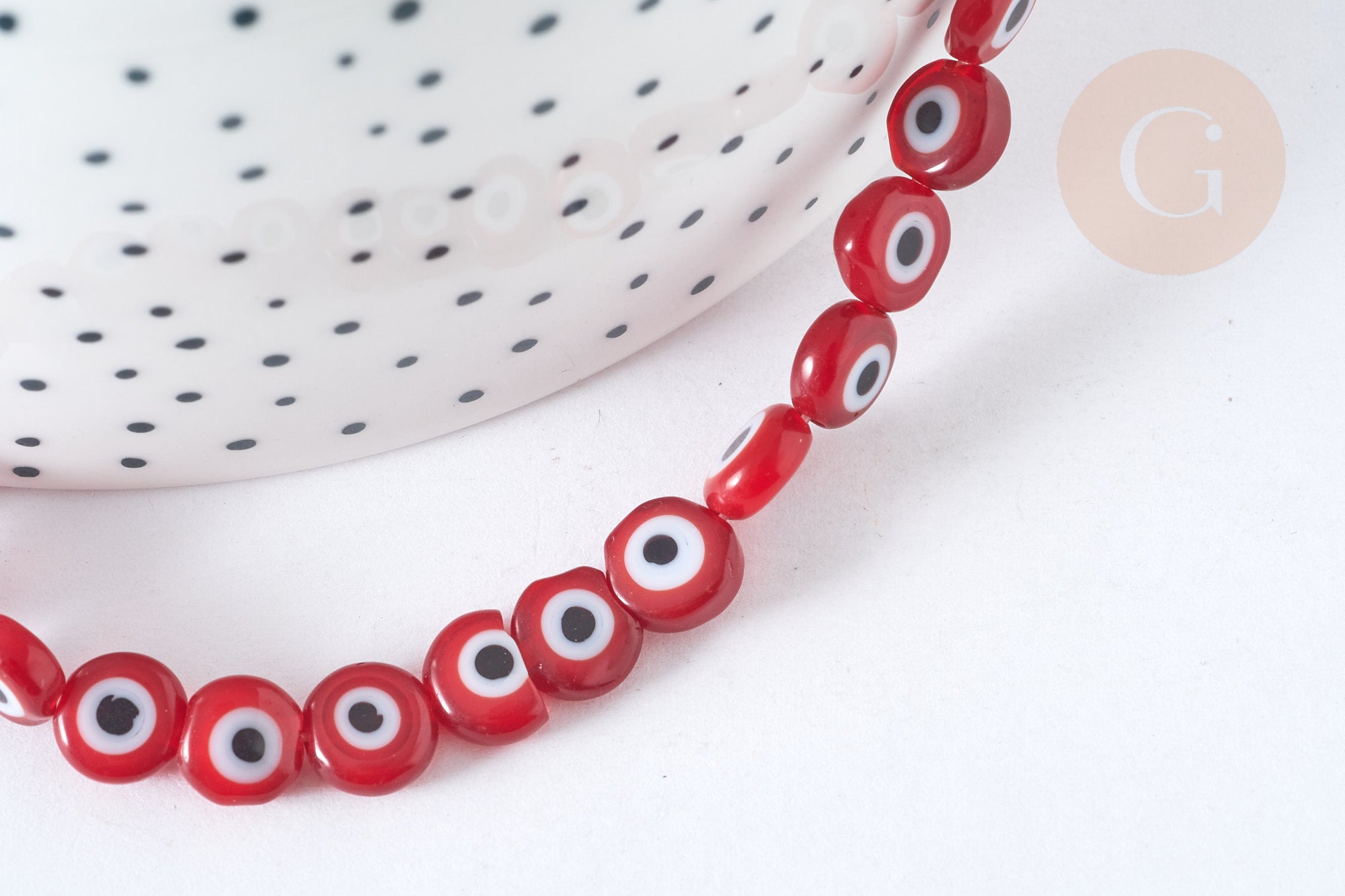 Un bonito conjunto de cuentas de vidrio rojo artesanales decoradas con un ojo protector.