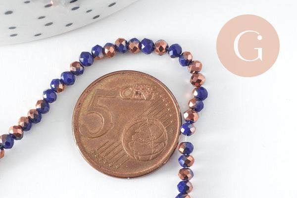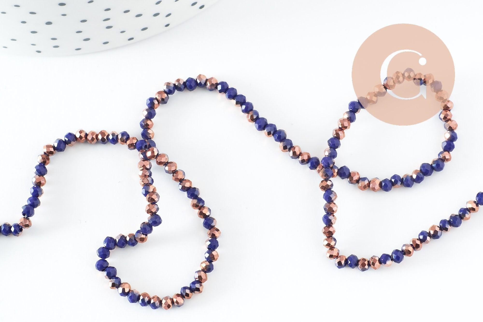 Realza tus creaciones con este hilo de cuentas de ábaco en cristal facetado azul y dorado . Cada perla, delicadamente tallada, ofrece un juego de luz único que mezcla reflejos azul profundo y toques dorados brillantes.