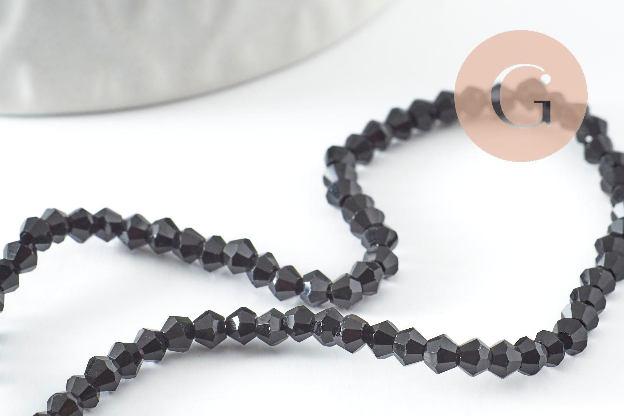 Esta tira de cuentas bicono de cristal negro facetado añadirá un toque de elegancia y brillo a tus creaciones. Su pequeño tamaño (2 x 3 mm) y su intenso brillo las hacen ideales para realzar tus joyas más delicadas. Fáciles de combinar, estas cuentas negras se adaptan a todos los estilos, desde el clásico hasta el moderno.
