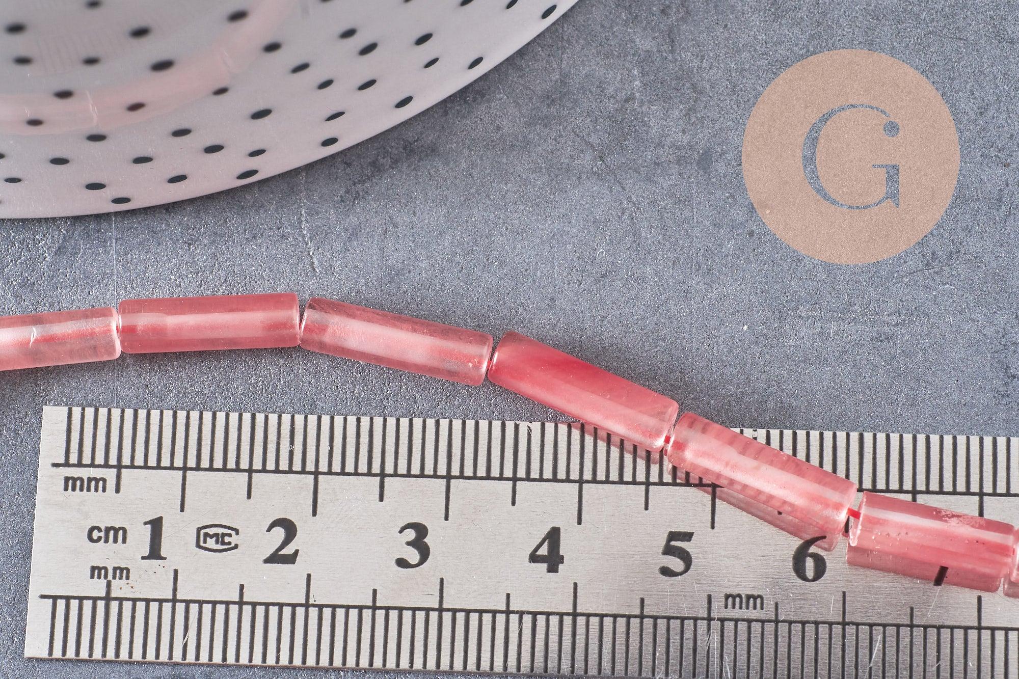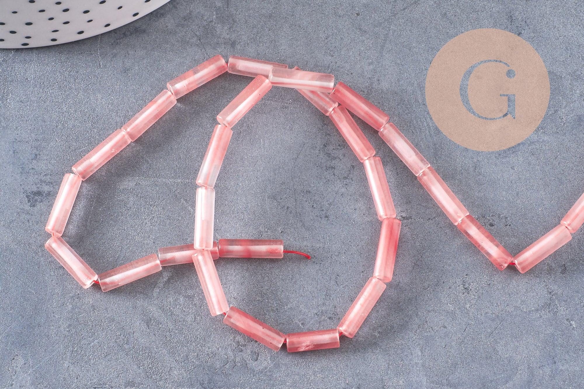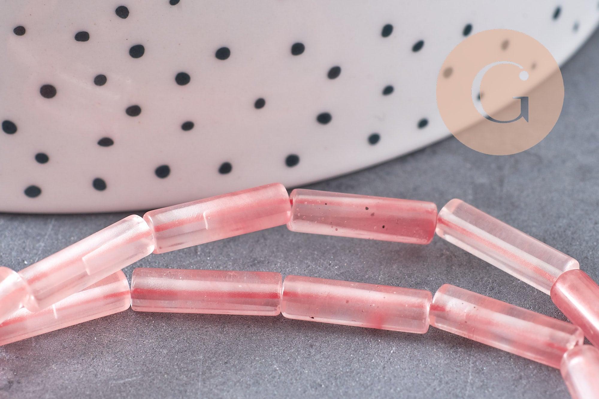 Enamórese de estas encantadoras cuentas tubulares de cuarzo cereza, perfectas para añadir un toque afrutado y luminoso a sus creaciones de bisutería. Su tono rosa transparente y su forma columnar las convierten en un accesorio imprescindible para crear diseños elegantes y modernos.