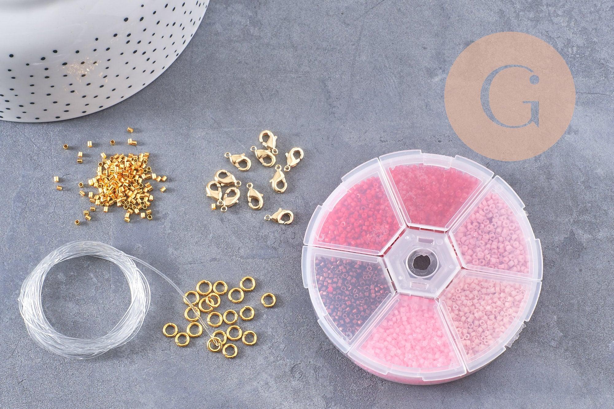 Este kit incluye cuentas en tonos de rosa , cuentas engarzadas , cierres , anillas y alambre elástico para una flexibilidad óptima. También está disponible una opción con 3 alicates de joyería para facilitar su montaje.