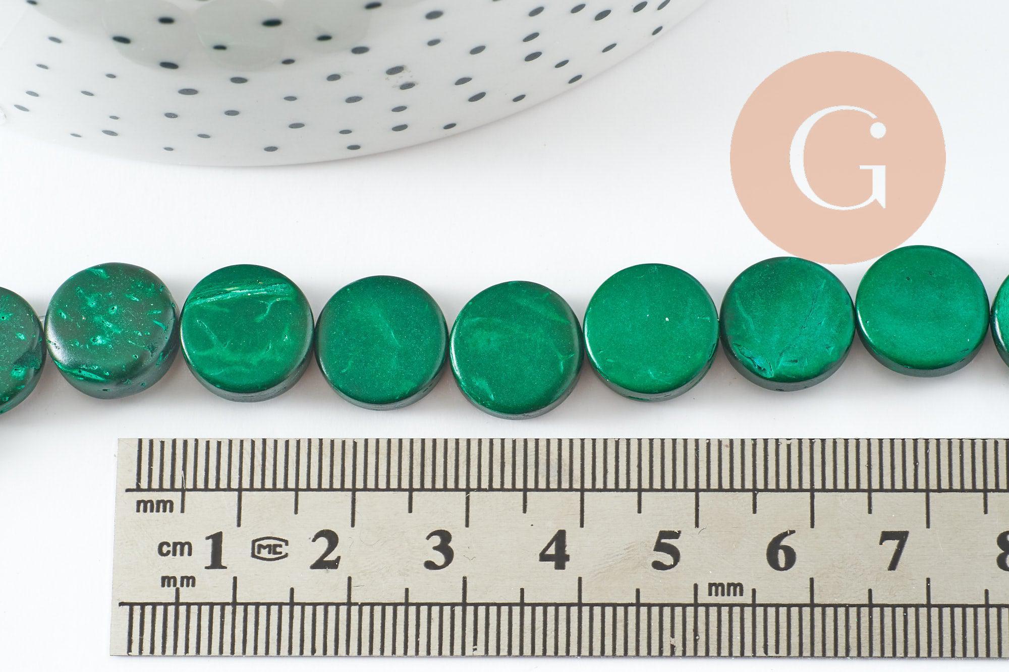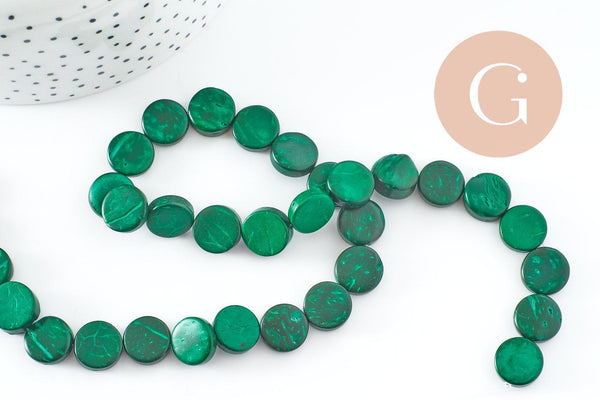 Cuentas en forma de disco hechas de madera de coco teñida de verde.