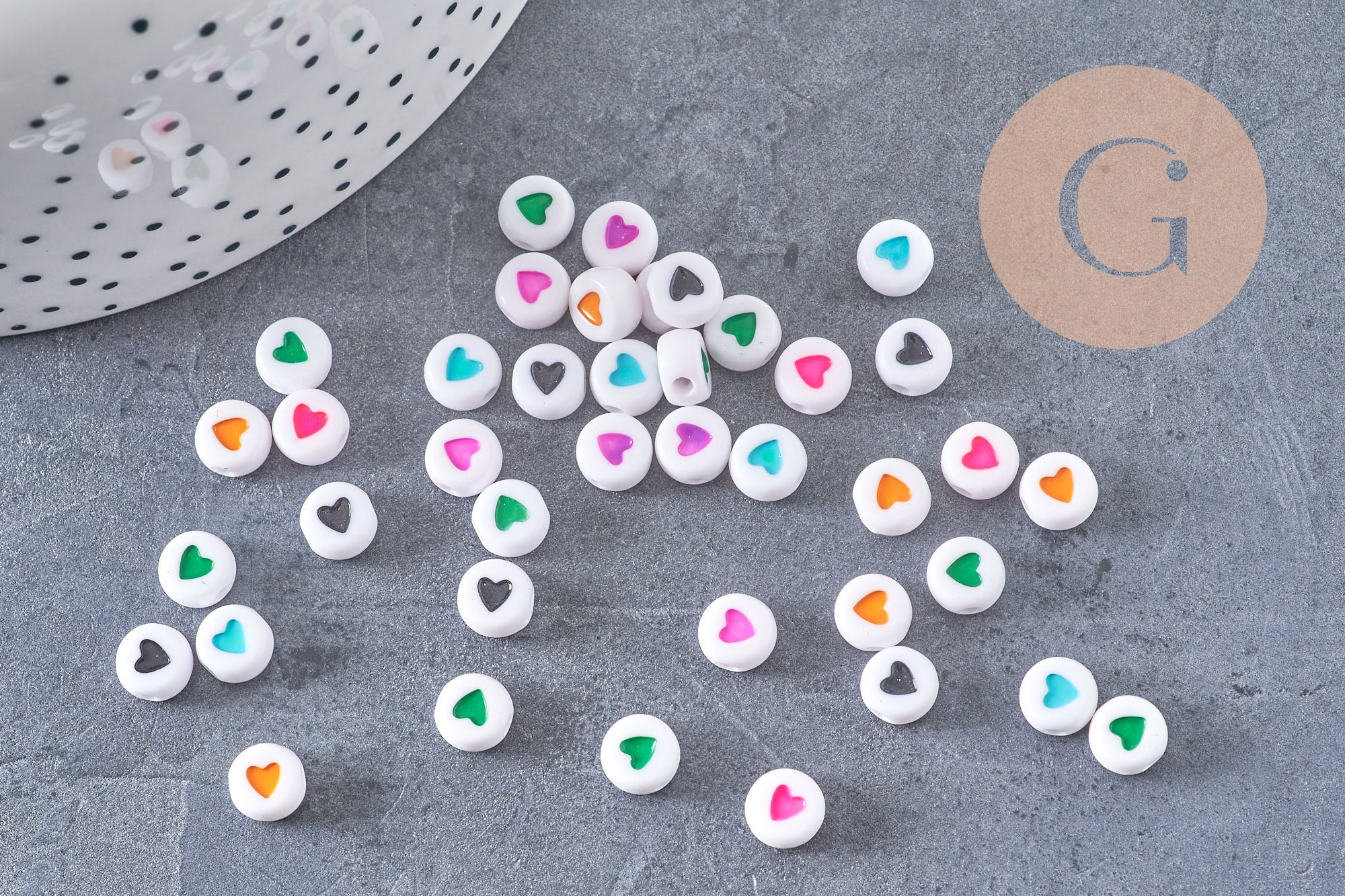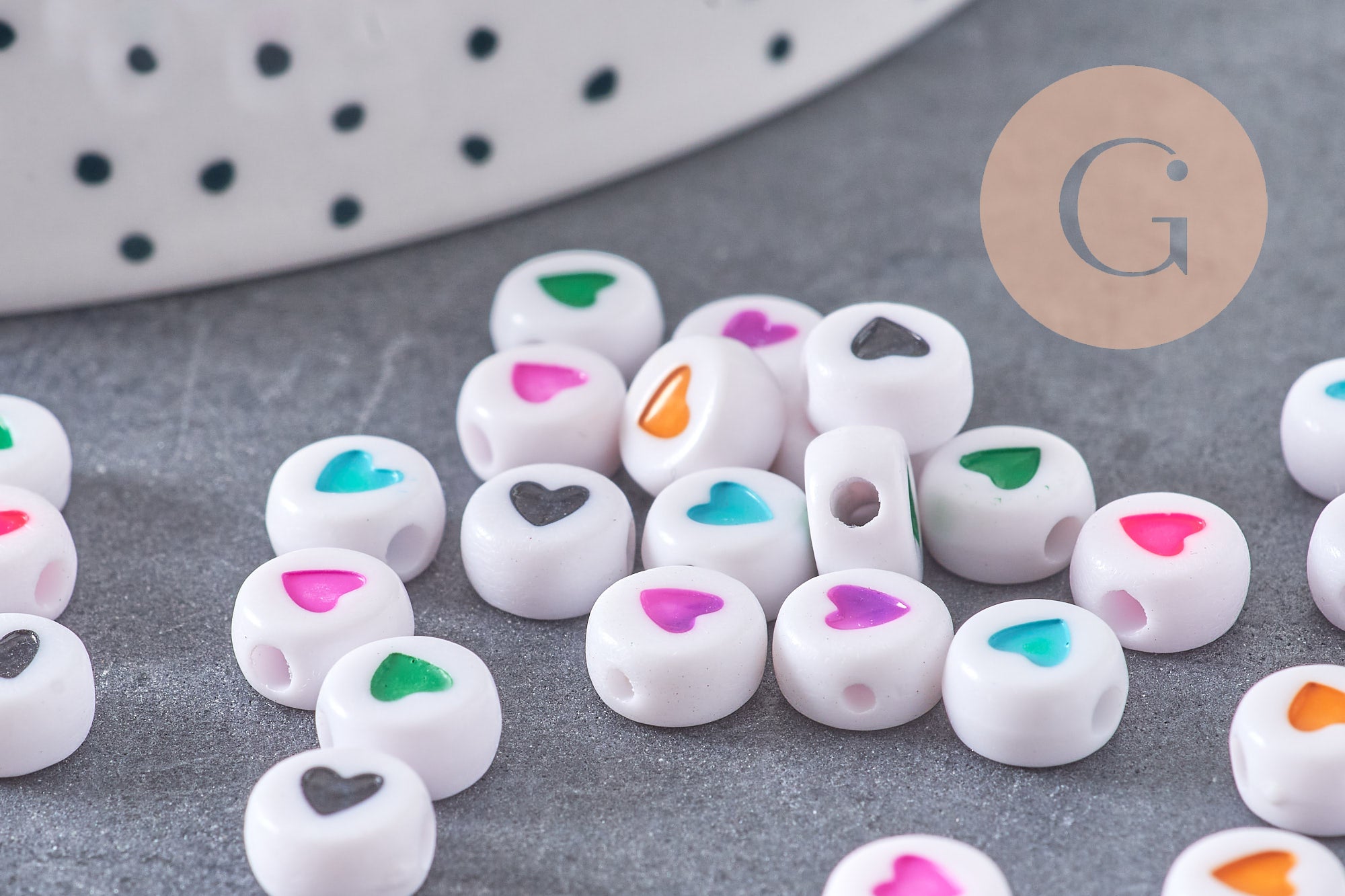 Perle ronde coeur coloré plastique blanc 7mm, perle ronde lettre,perle coeur, x 10Gr (G1805)