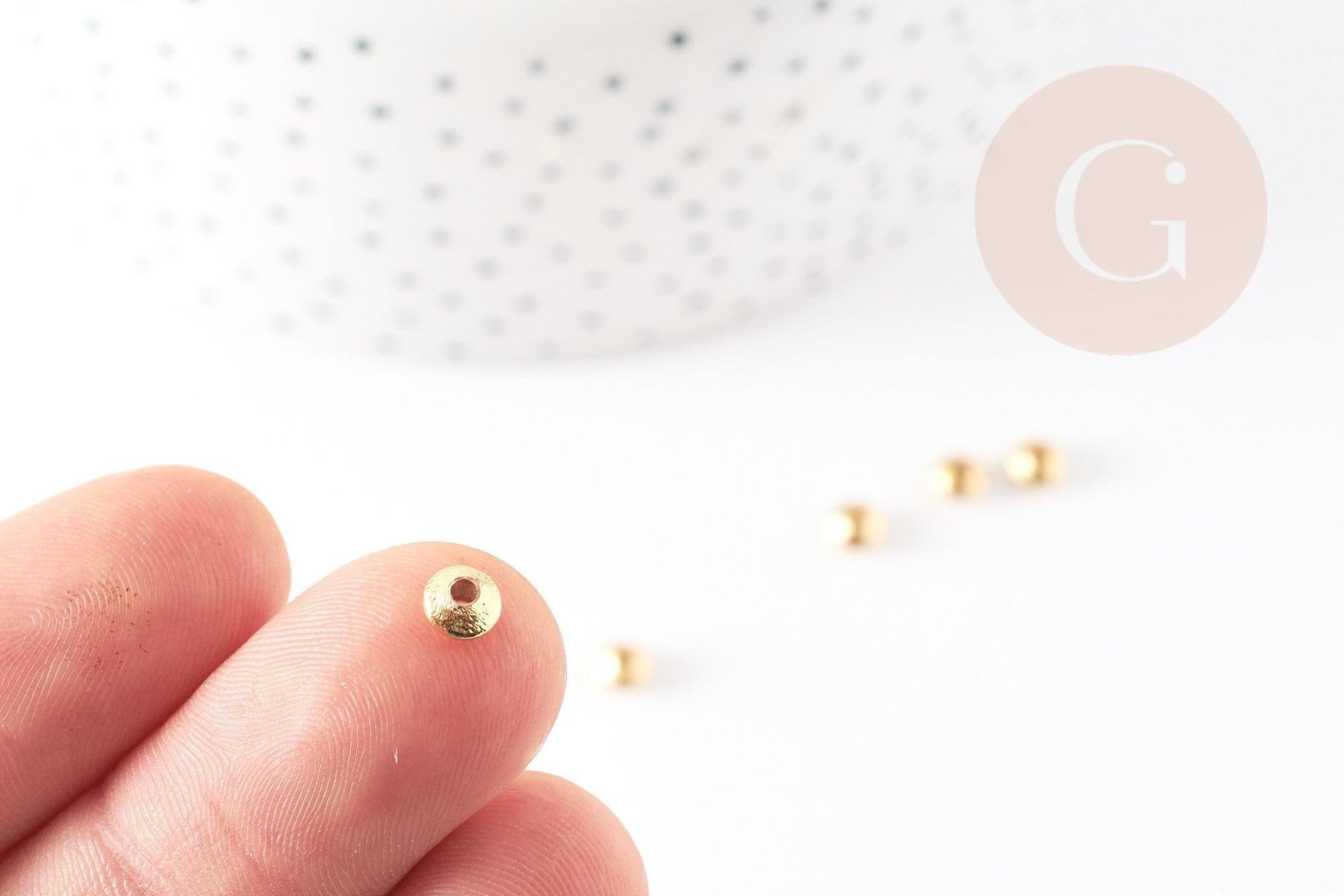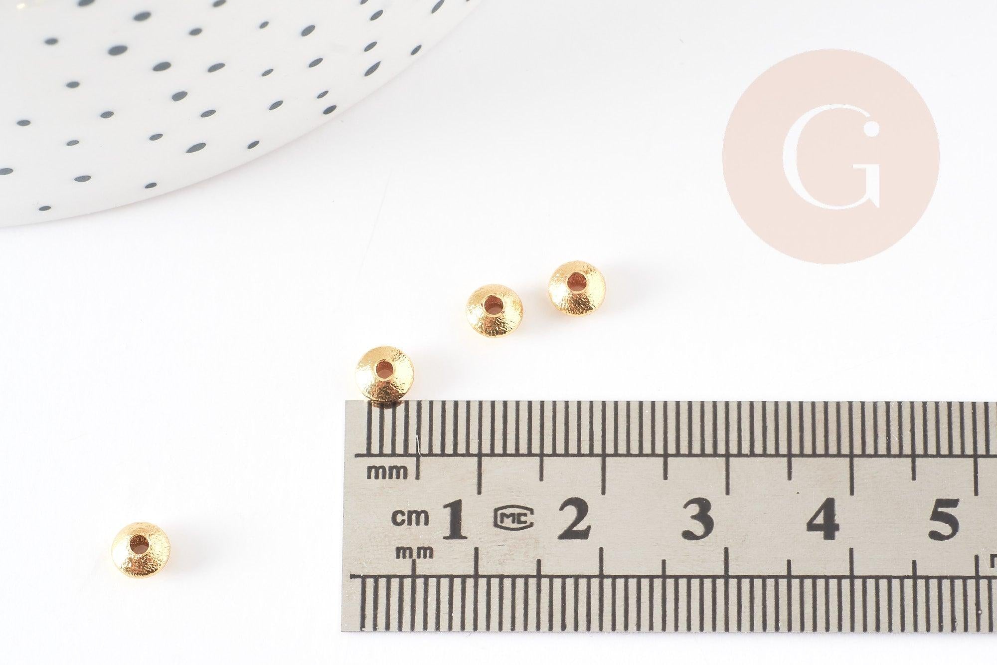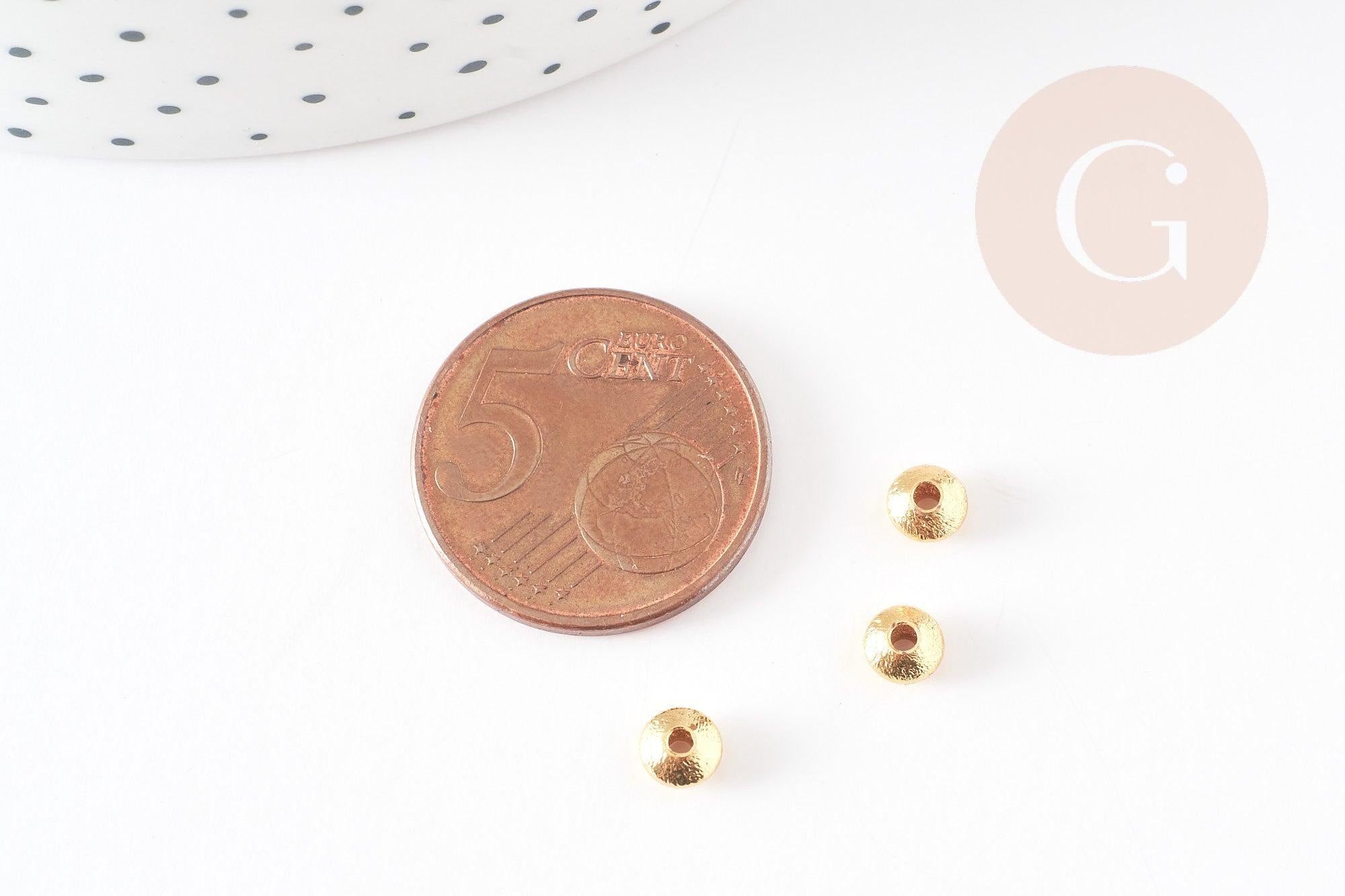 Añade un toque refinado y texturizado a tus creaciones con estas cuentas espaciadoras redondas de latón dorado pulido con chorro de arena . Su acabado ligeramente granulado aporta un brillo sutil y un efecto precioso a tus joyas.