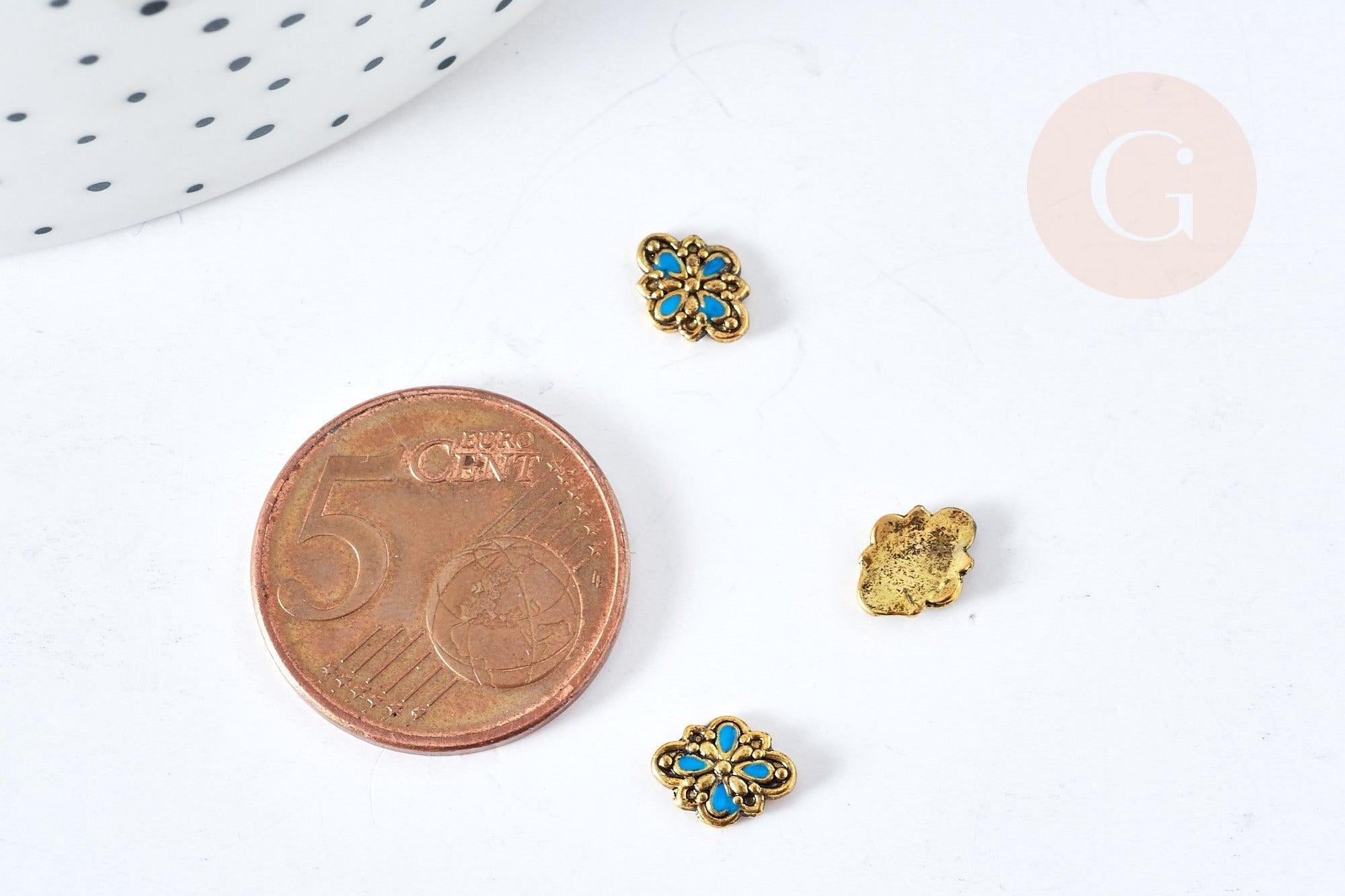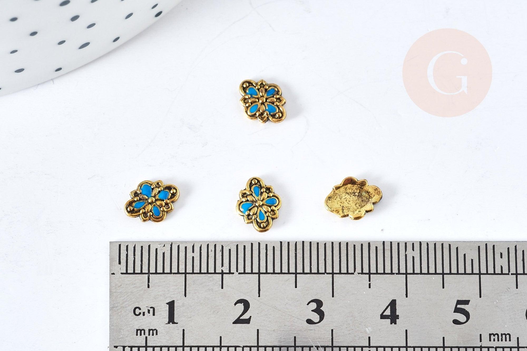Mejora tus creaciones de bisutería DIY con este cabujón de flores adhesivo en aleación de color bronce esmaltado en azul . Su diseño original añadirá un toque personal y moderno a sus cabujones de piedra o de cristal redondos u ovalados para obtener joyas únicas y personalizadas .