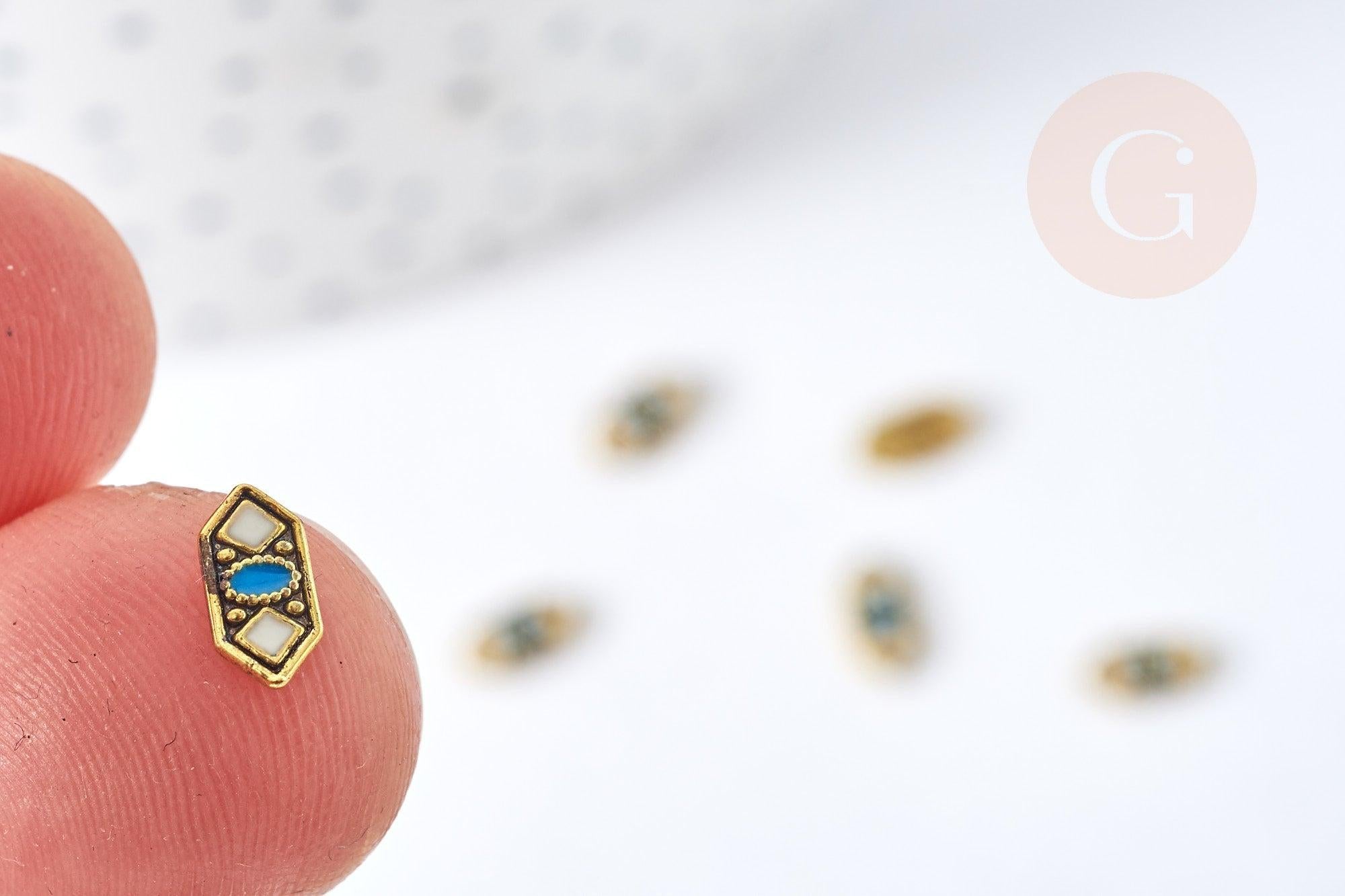 Charm adhesivo geométrico de zamac, esmalte azul bronce y blanco, 7,5 mm, x5 (G8527)