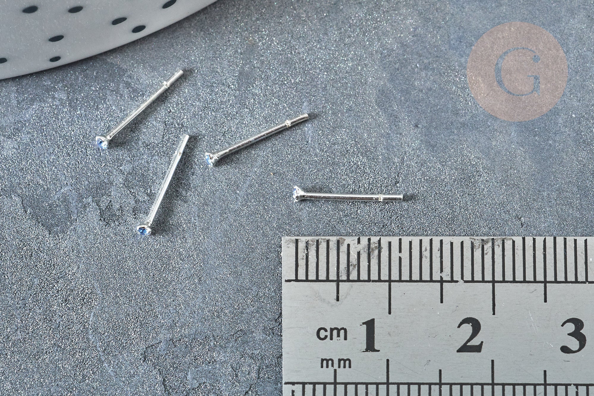 Un discreto piercing para la nariz, en plata maciza 925, con un pequeño brillante de circonita azul aguamarina, de 1,5mm.