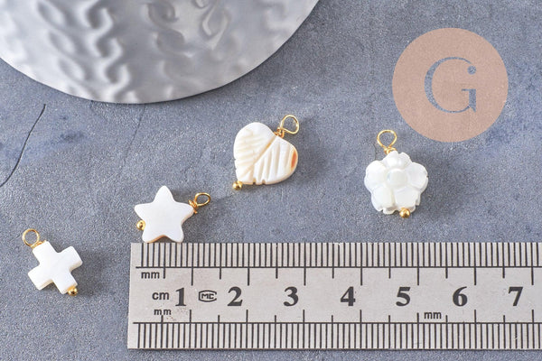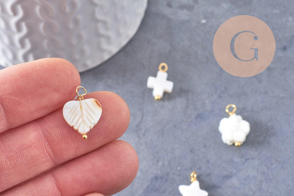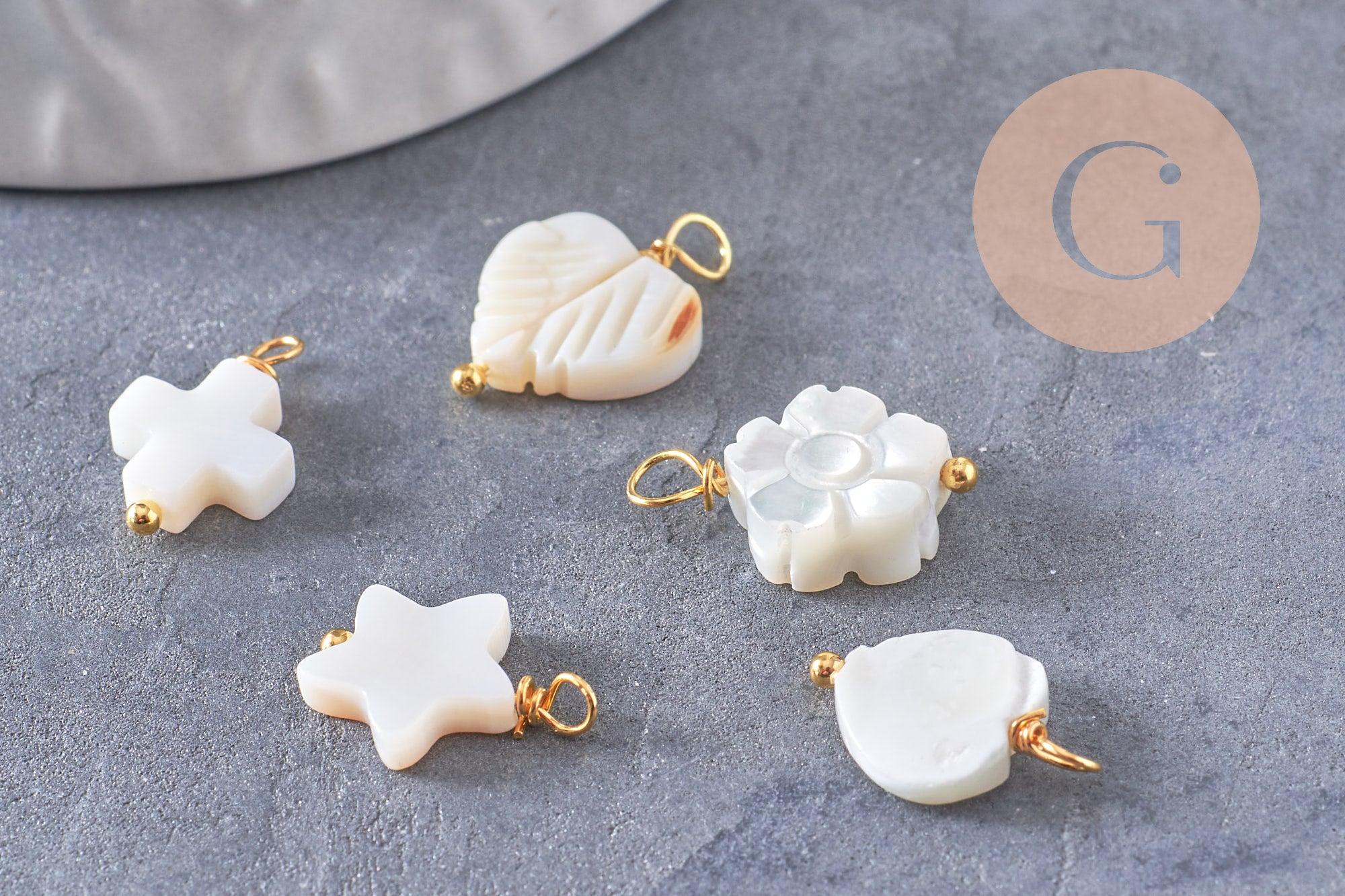 Añade un toque elegante y atemporal a tus creaciones con este charm de nácar blanco natural , montado sobre una base de acero inoxidable bañado en oro 304 . Disponible en varias formas (corazón, estrella, hoja, flor, cruz) , se adapta a todos los estilos de joyería DIY.