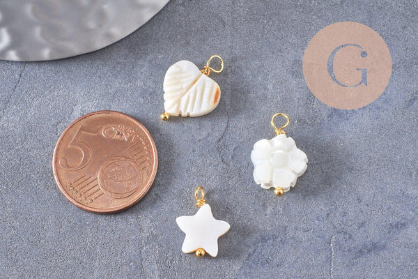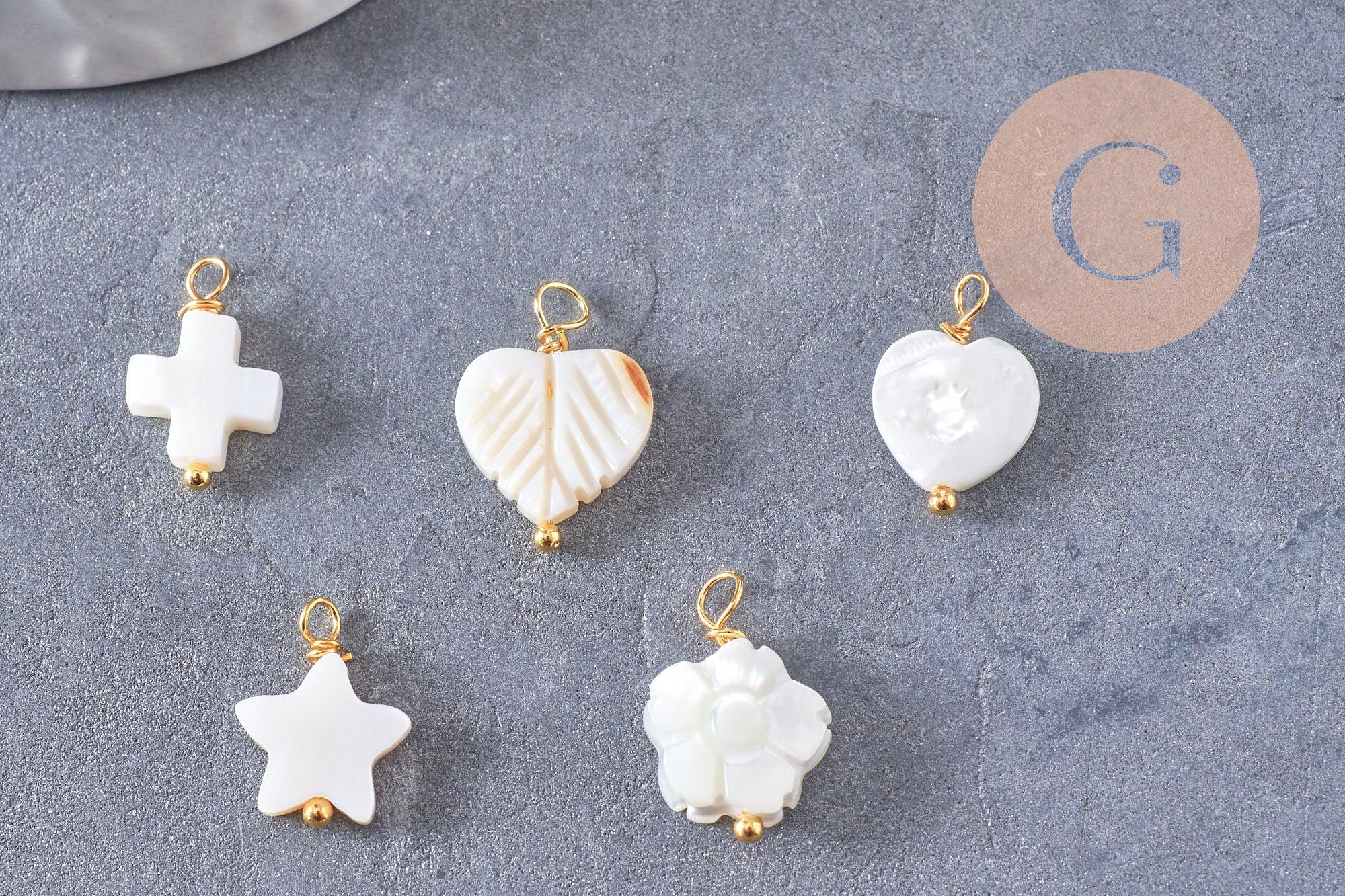 Dije de nácar blanco natural con forma de corazón, estrella, hoja, flor y cruz, acero inoxidable 304, dorado, 15~17 mm (G10410)
